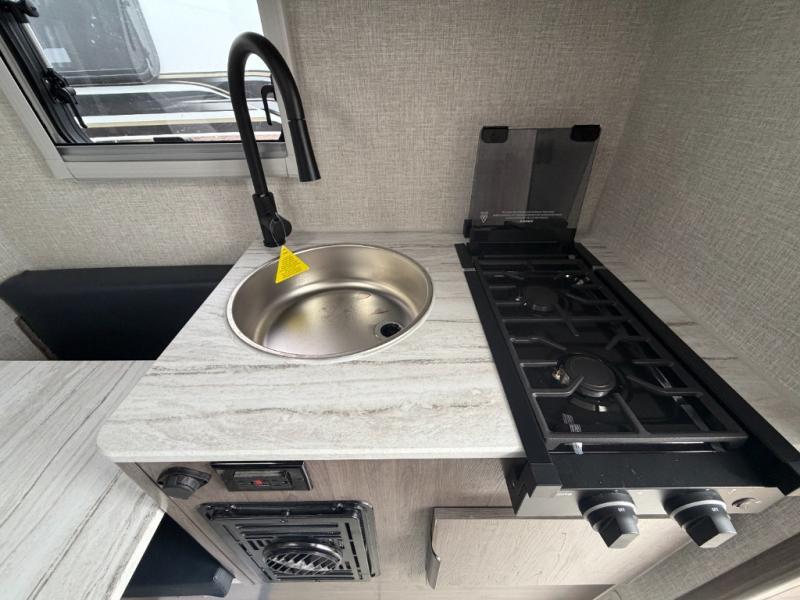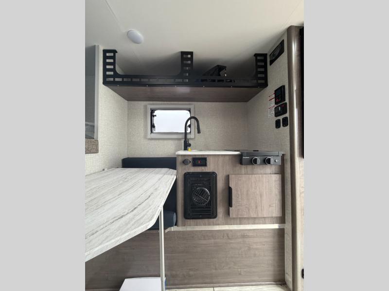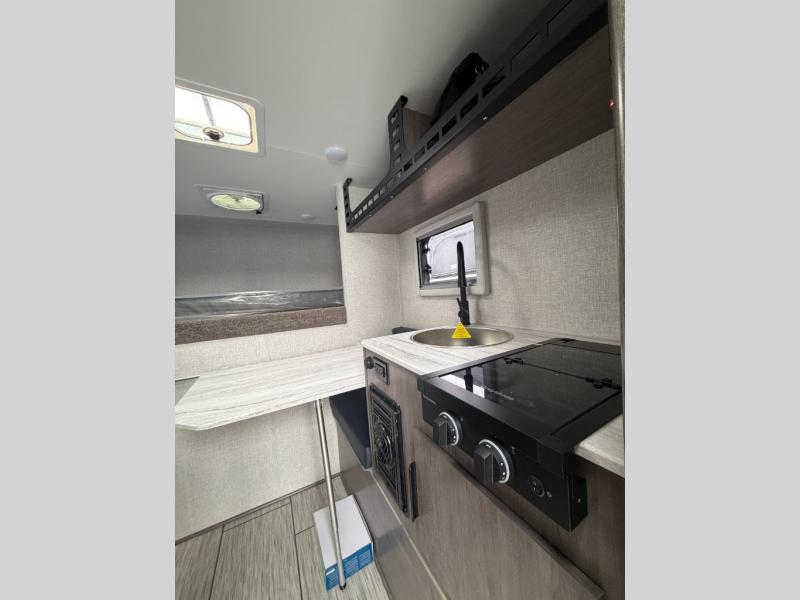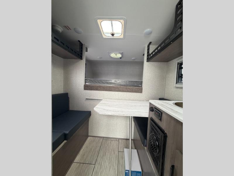 This lightweight truck camper is perfect for short bed trucks. The compact galley includes a two-burner cooktop, a stainless-steel sink, and a 12V refrigerator to keep your food fresh. A dinette provides a place to dine together or play games in the evening, and there is Molle-backed cabinet framing for extra storage. You will appreciate the wet bath with ducted heat and foot flush marine toilet, so you don't have to leave your camper in the middle of the night. A queen-size bed will provide a great night's rest, while the reading lights let you stay up late with a book!