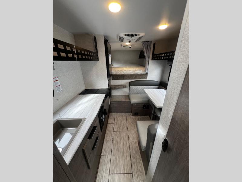 Simple camping has never been easier than with this truck camper! Once you've set up camp for the night, you can make dinner on the two burner cooktop, freshen up with the high spout galley faucet, and store leftovers in the 3.3 cu. ft. 12V refrigerator. You will also appreciate the ample counter space here! The U-shaped dinette will provide a place to dine together and even let a guest or two stay over. This unit also includes a wet bath for even more comfort and convenience!