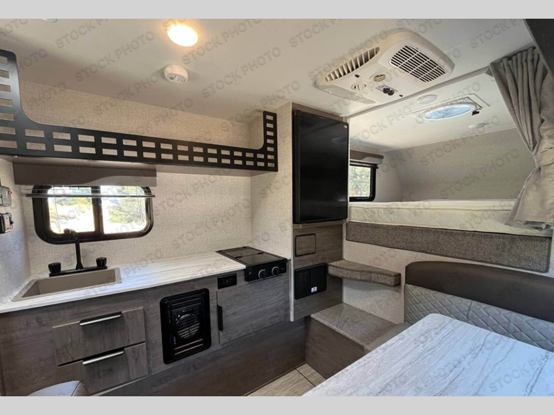 Simple camping has never been easier than with this truck camper! Once you've set up camp for the night, you can make dinner on the two-burner cooktop, freshen up with the high spout galley faucet, and store leftovers in the 3-cu. ft. 12V refrigerator. You will also appreciate the ample counter space here! The U-shaped dinette will provide a place to dine together and even let a guest or two stay over. This unit also includes a wet bath for even more comfort and convenience!