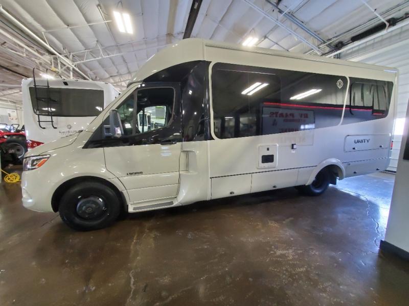 Each Unity Class B+ diesel motorhome by Leisure Travel sits on a durable Mercedes-Benz Sprinter 3500 dual rear wheel chassis with a 2.0-L Turbocharged I-4 diesel engine to power your adventures. The powder coated steel undercarriage support structure and vacuum-bonded construction provide a coach that will last for years, and there are sleek exterior paint options to make the coach your own. You'll love driving the Unity with its electronic stability control, adaptive cruise control, 9-speed automatic transmission with quieter noise levels and more comfort. The luxurious interior includes Ultrafabrics, a contoured solid surface Corian countertop in the kitchen, modern cabinetry finishes, plus many more comforts. And all of your power need will be met with 270-Ah 12V Lithium coach batteries with an internal heating system, plus a 3000W pure sine inverter and a 30 Amp power cord. The optional Desert Shadow Edition can be added to any Unity floorplan to give you a more modern design inspired by the earthly tones and striking silhouettes. This package includes an exclusive canyon exterior paint with black accents, exclusive Desert Shadow badging, matte black hardware, Dune Ultrafabrics and more; see dealer for more details!
