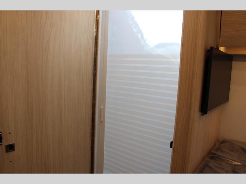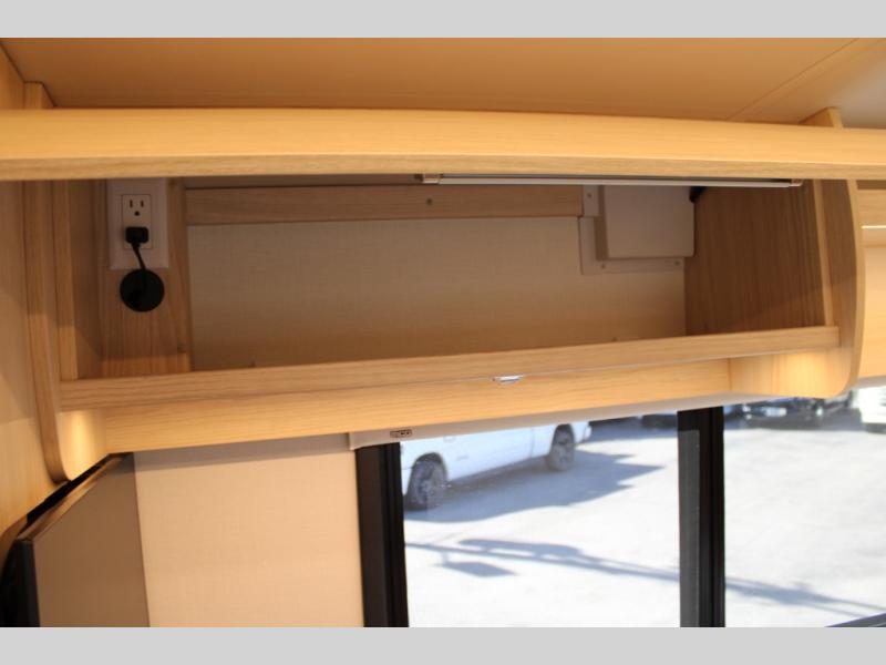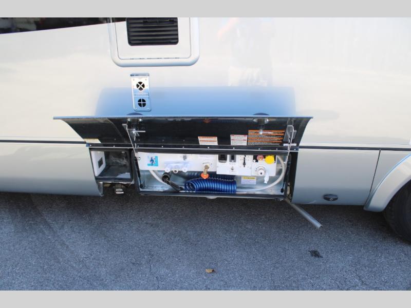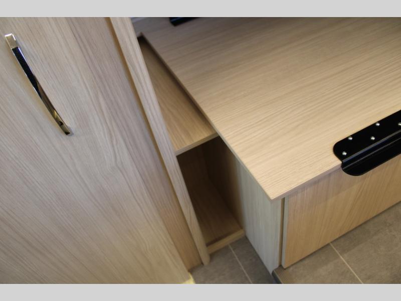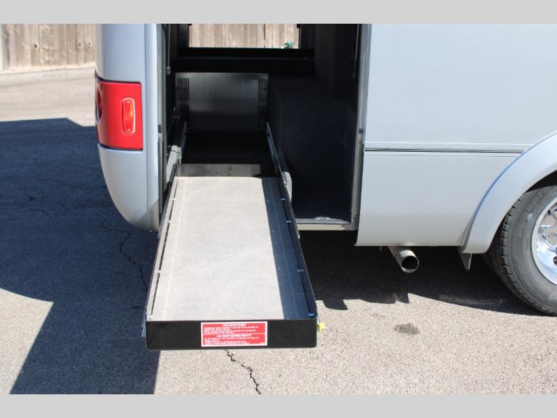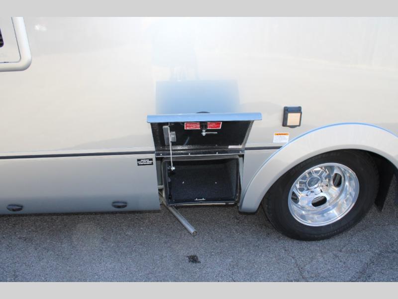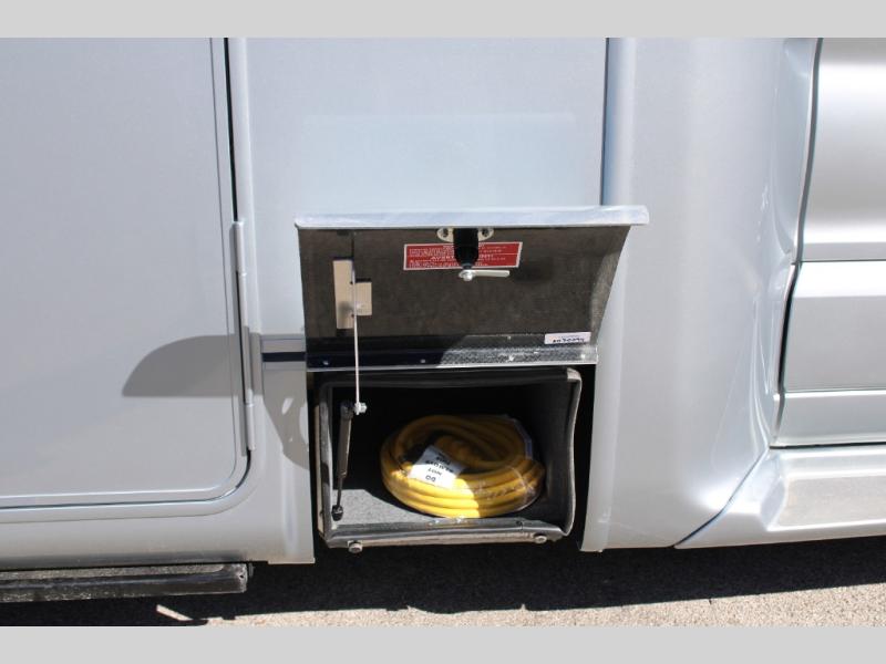 The adventurous type will love this coach with its large pass-through exterior garage-style storage with a bicycle/cargo slide that allows you to fit two full-sized bicycles and much more for fun outdoor adventures on the go. The separate rear bedroom provides convertible twin beds with easy access to the separate lavatory across from the enclosed shower, or you can make the twins into one 64" x 76" bed. The large galley offers a flip-down extension for more space for your drinks, dishes and such, a convection microwave oven, and a flush mount LP cooktop with a hinged glass cover. There is also a garbage can to keep everything tidy, and a double door, a compressor refrigerator/freezer, plus an accessory rail.