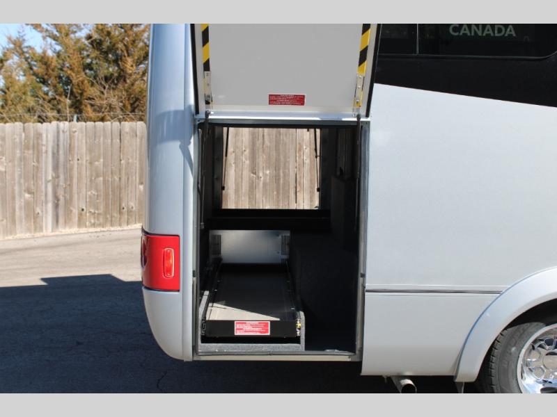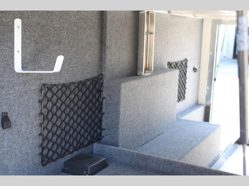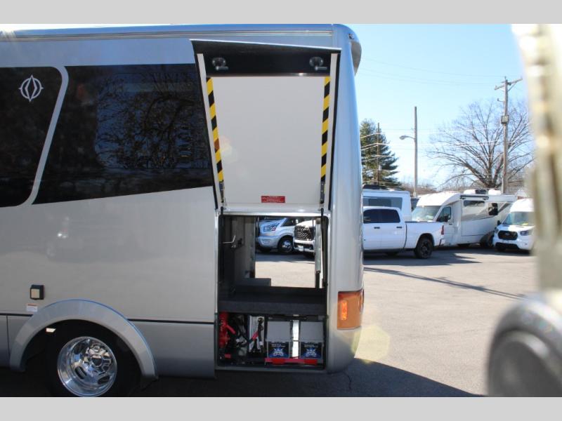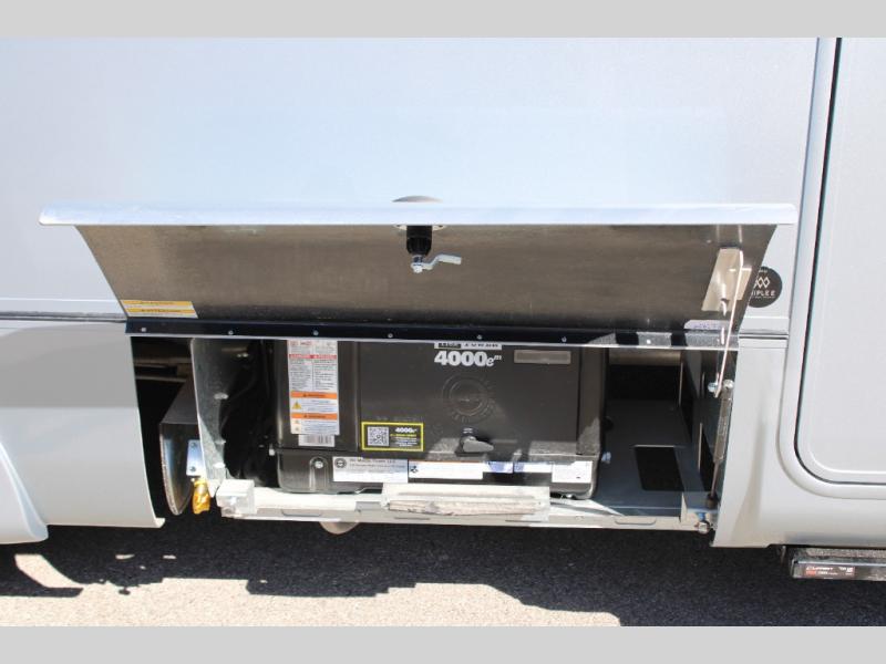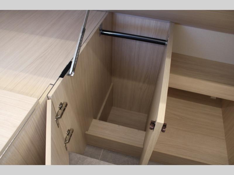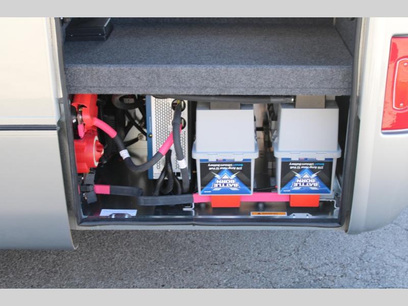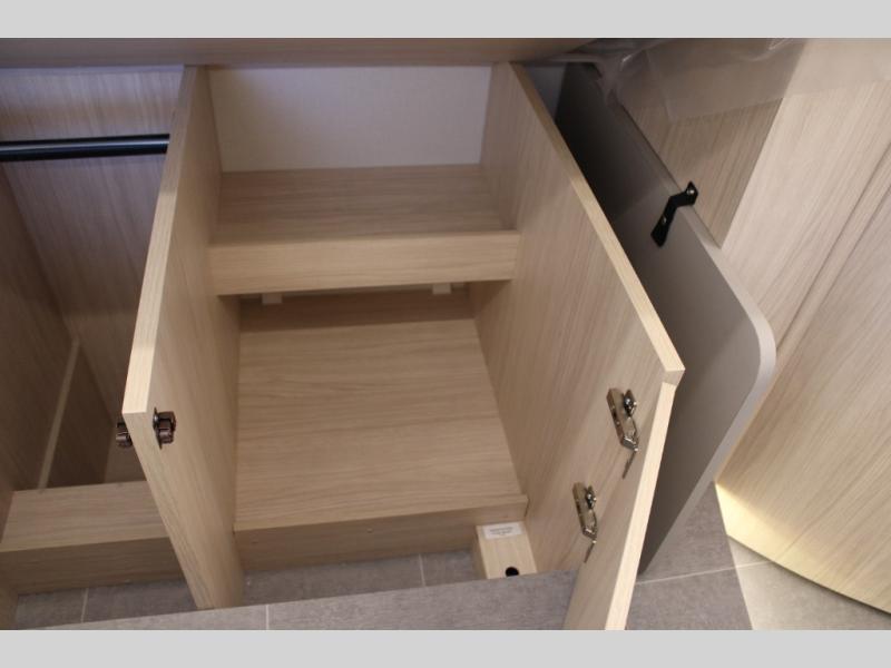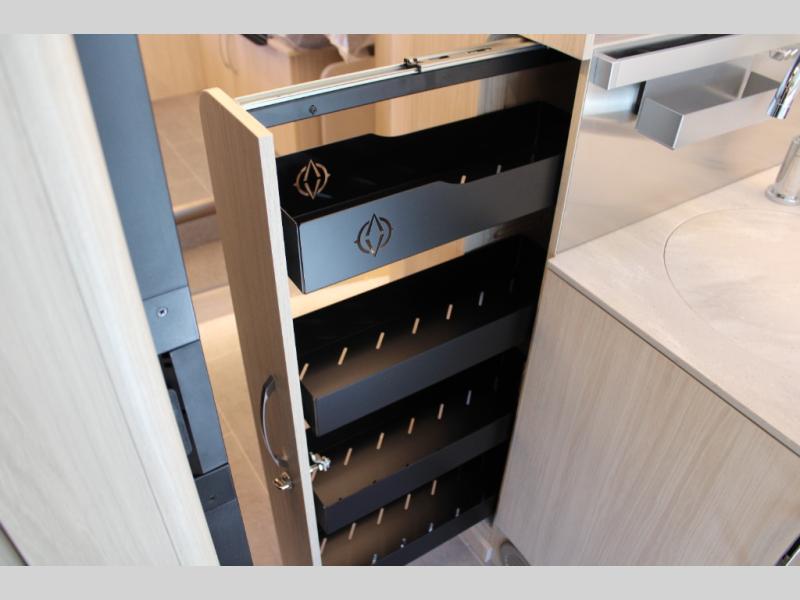 The adventurous type will love this coach with its large pass-through exterior garage-style storage with a bicycle/cargo slide that allows you to fit two full-sized bicycles and much more for fun outdoor adventures on the go. The separate rear bedroom provides convertible twin beds with easy access to the separate lavatory across from the enclosed shower, or you can make the twins into one 64" x 76" bed. The large galley offers a flip-down extension for more space for your drinks, dishes and such, a convection microwave oven, and a flush mount LP cooktop with a hinged glass cover. There is also a garbage can to keep everything tidy, and a double door, a compressor refrigerator/freezer, plus an accessory rail.