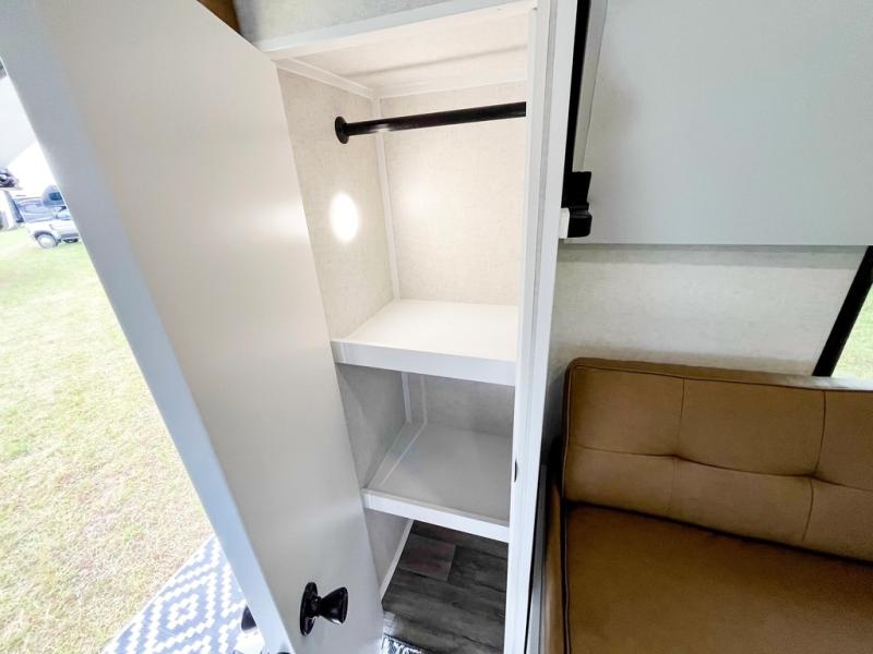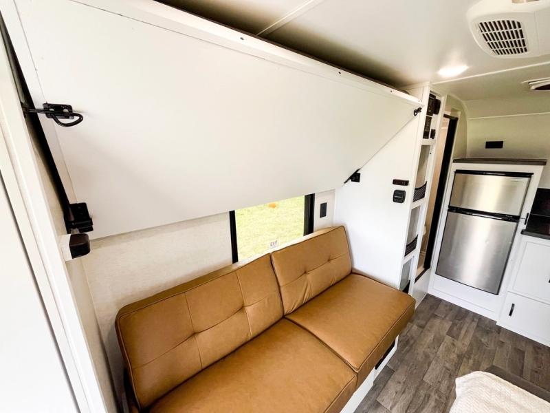 You'll love time at the campground in this lightweight travel trailer! Everything you need for an enjoyable experience has been provided, such as a functional kitchen with a two-burner stove and 12V refrigerator to cook and store food, plus a convenient wet bath so you can freshen up each day! A 68" jack knife sofa with a 68" x 31" bed/bunk above will provide sleeping space for guests, while you take the 45" x 74" bed. There are overhead cabinets for your things, along with two pantries for dry goods, snacks and more!