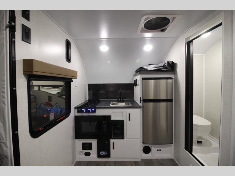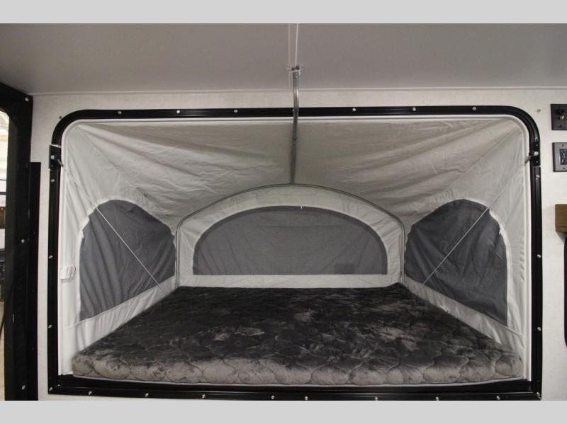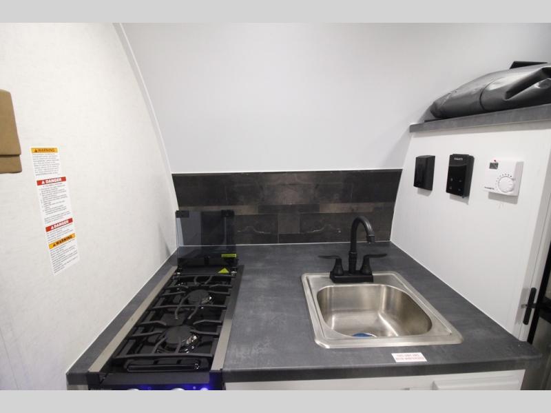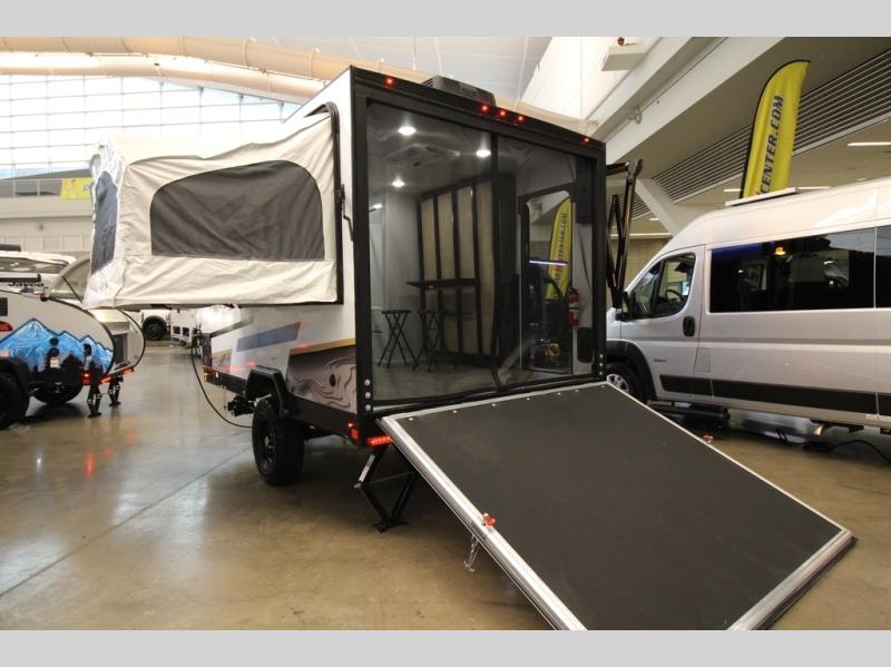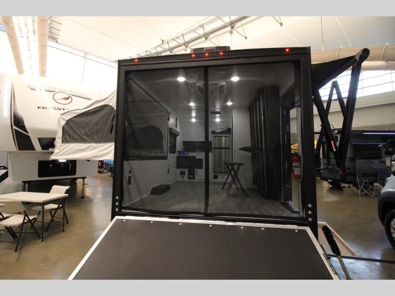 Load up the kayaks or dirt bikes for fun weekends in this toy hauler! Once you've unloaded your toys using the ramp door, you can start lunch in the front corner kitchen that includes a two-burner stove, a 12V refrigerator, and a stainless-steel sink for easy clean up. Speaking of cleaning up, the dry bath is also up front that includes a separate shower and Thetford toilet. And the 50" x 74" Murphy-style bed and side pop-out tent will provide comfy sleeping spaces when you're ready to call it a night!