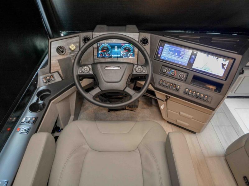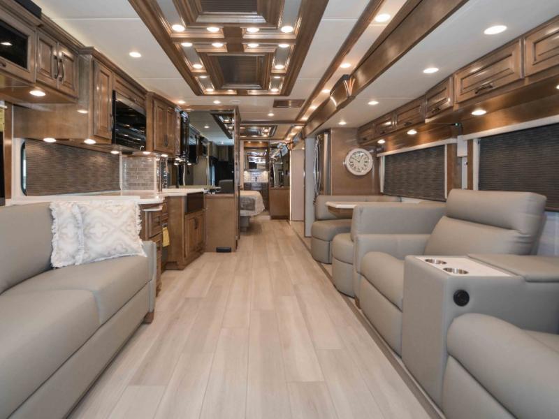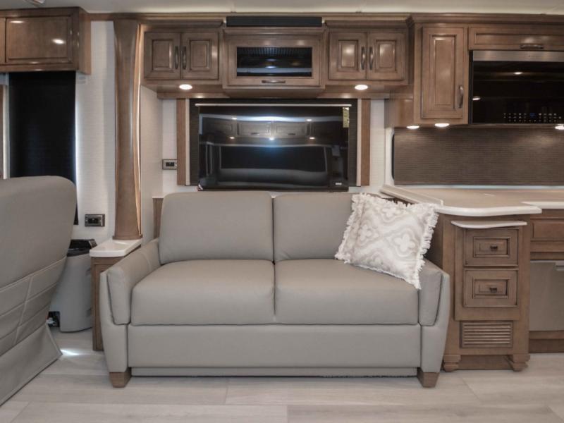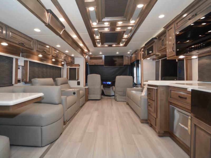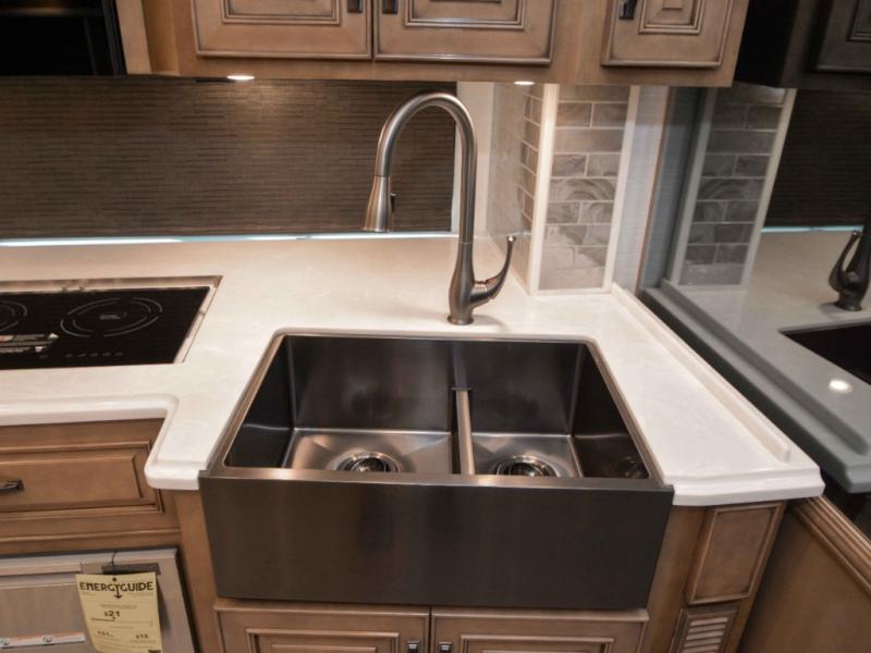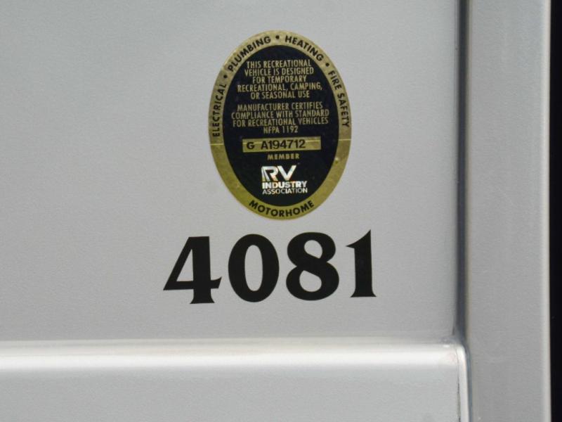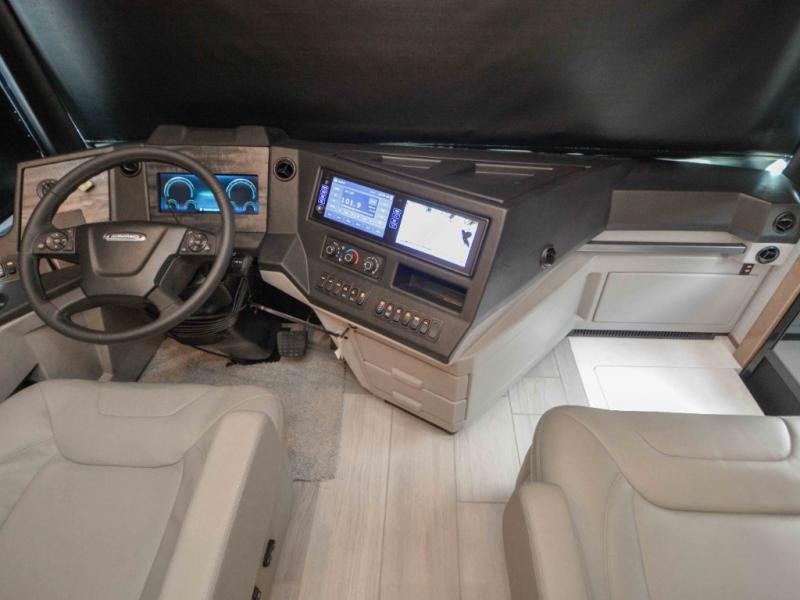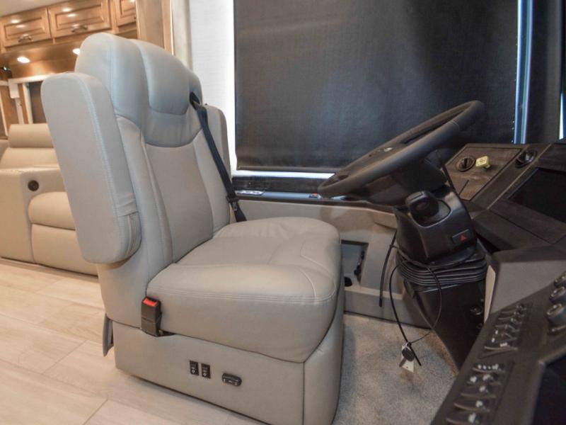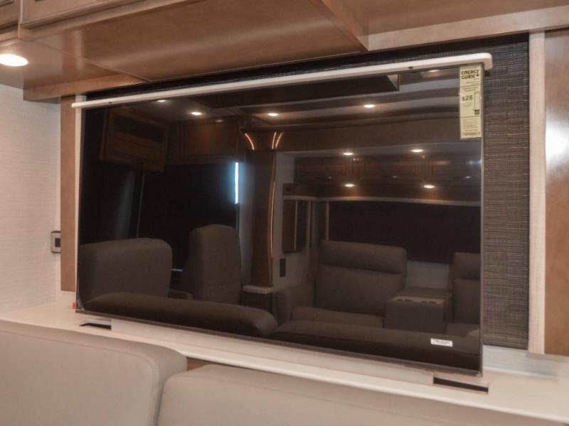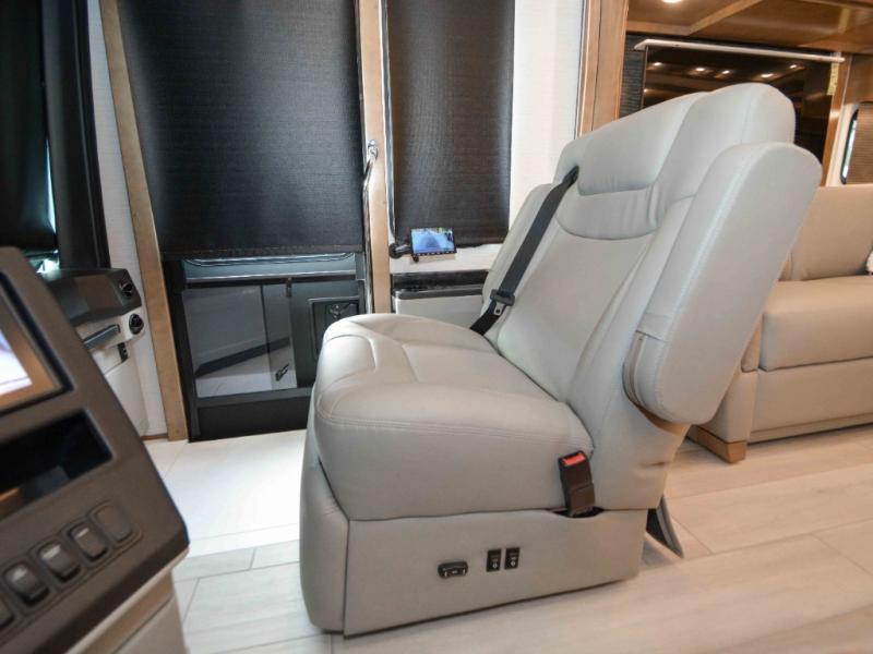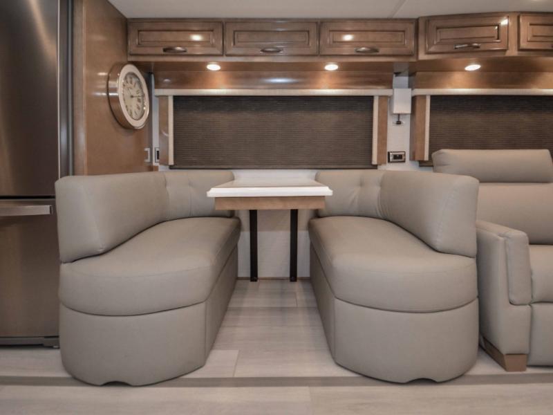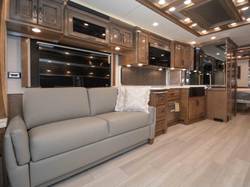 This Dutch Star surrounds you in style and comfort with heated tile flooring, solid surfaces, and hardwood raised panel cabinetry throughout. The living area features 87" theater seating opposite a tri-fold sofa and 50" Samsung 4K LED TV on a televator. Swivel the power captain's seats around for additional seating with another Samsung 4K TV overhead. The gourmet galley provides top-of-the-line residential appliances including a Whirlpool refrigerator with door service, induction cooktop, Whirlpool convection microwave oven, dishwasher in a drawer, plus a beautiful farmhouse sink and pantry with pull-out drawers. Serve up meals at the Euro booth dinette which includes an insert and additional chairs for guests.