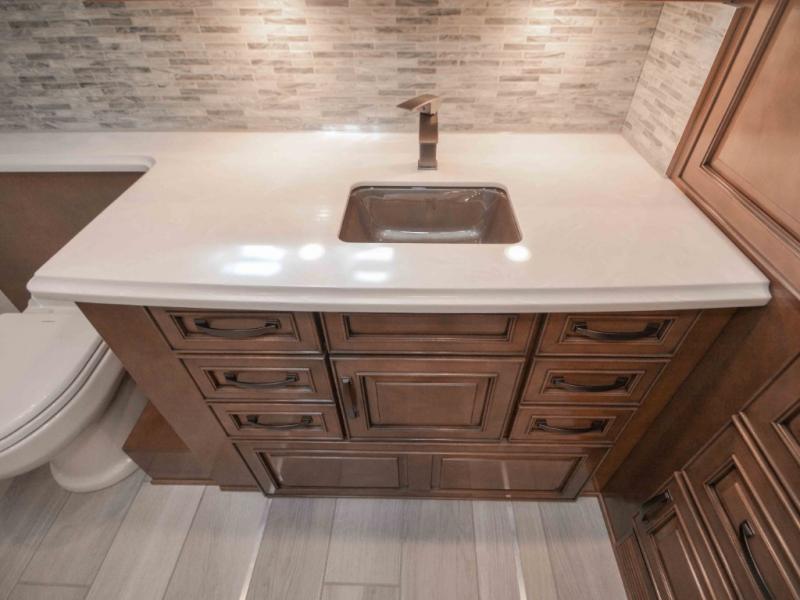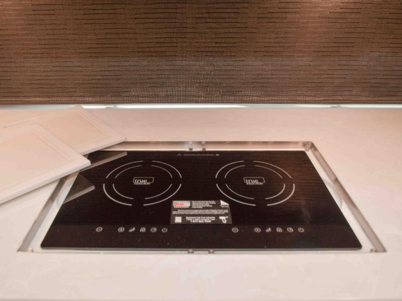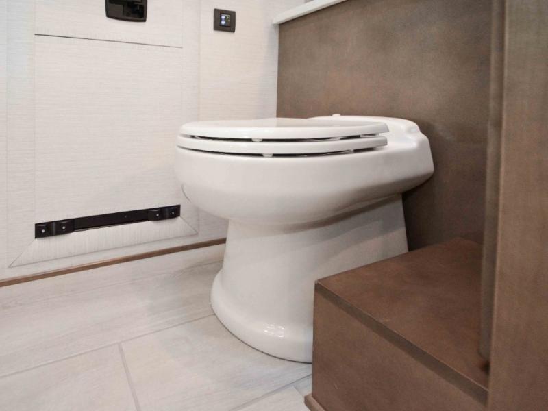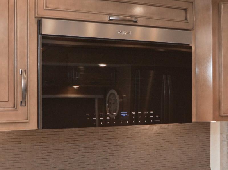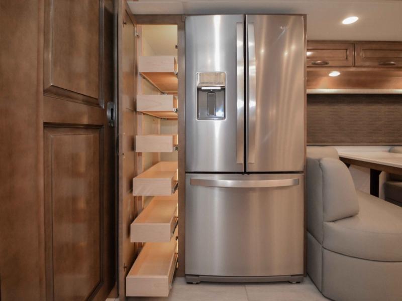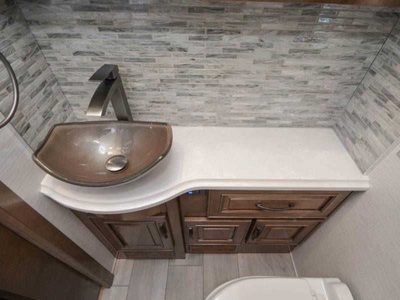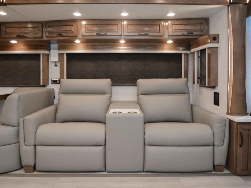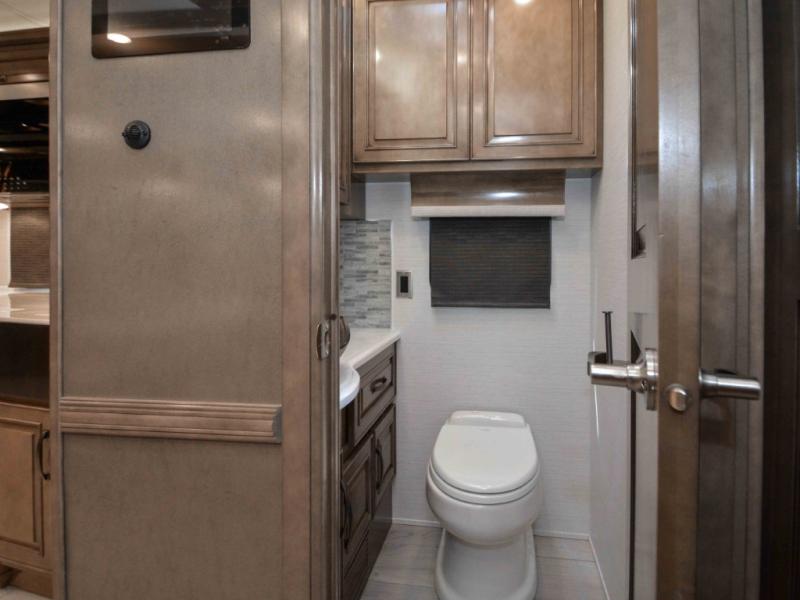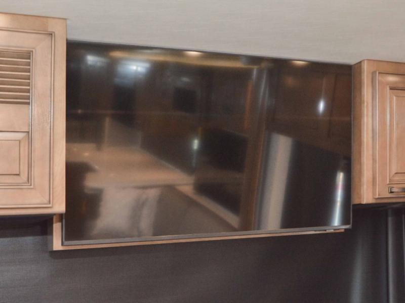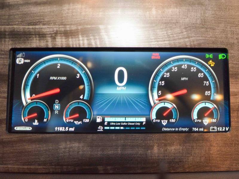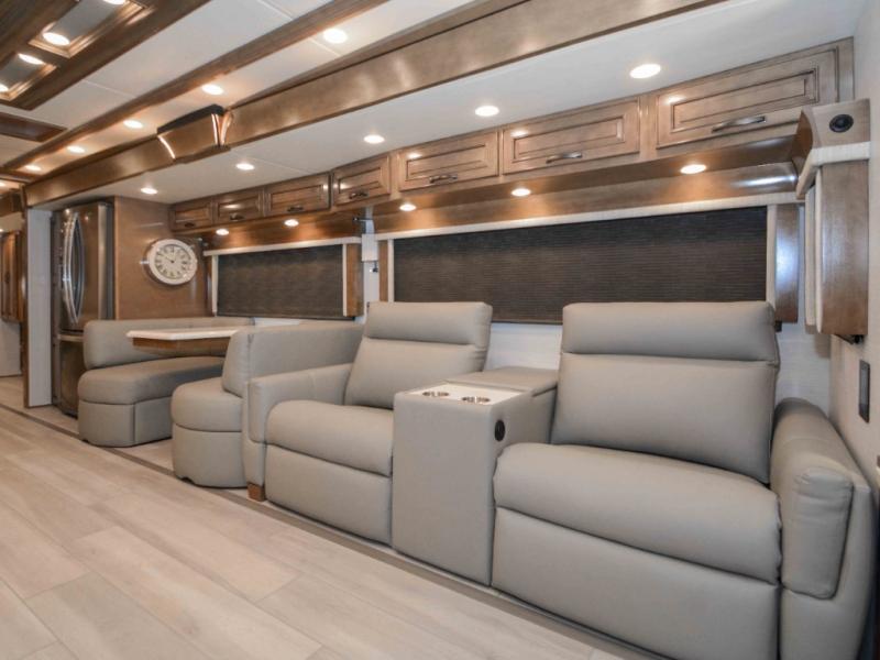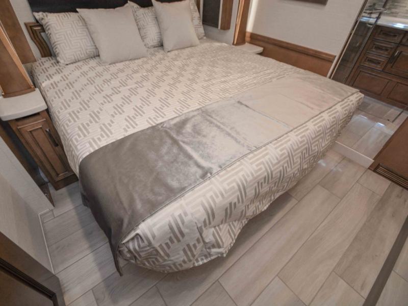 This Dutch Star surrounds you in style and comfort with heated tile flooring, solid surfaces, and hardwood raised panel cabinetry throughout. The living area features 87" theater seating opposite a tri-fold sofa and 50" Samsung 4K LED TV on a televator. Swivel the power captain's seats around for additional seating with another Samsung 4K TV overhead. The gourmet galley provides top-of-the-line residential appliances including a Whirlpool refrigerator with door service, induction cooktop, Whirlpool convection microwave oven, dishwasher in a drawer, plus a beautiful farmhouse sink and pantry with pull-out drawers. Serve up meals at the Euro booth dinette which includes an insert and additional chairs for guests.
