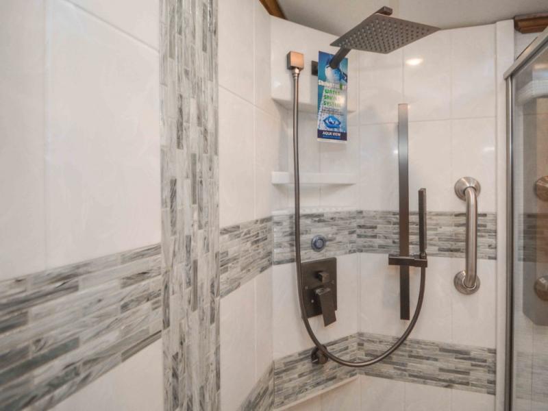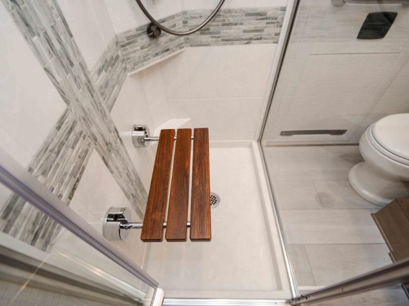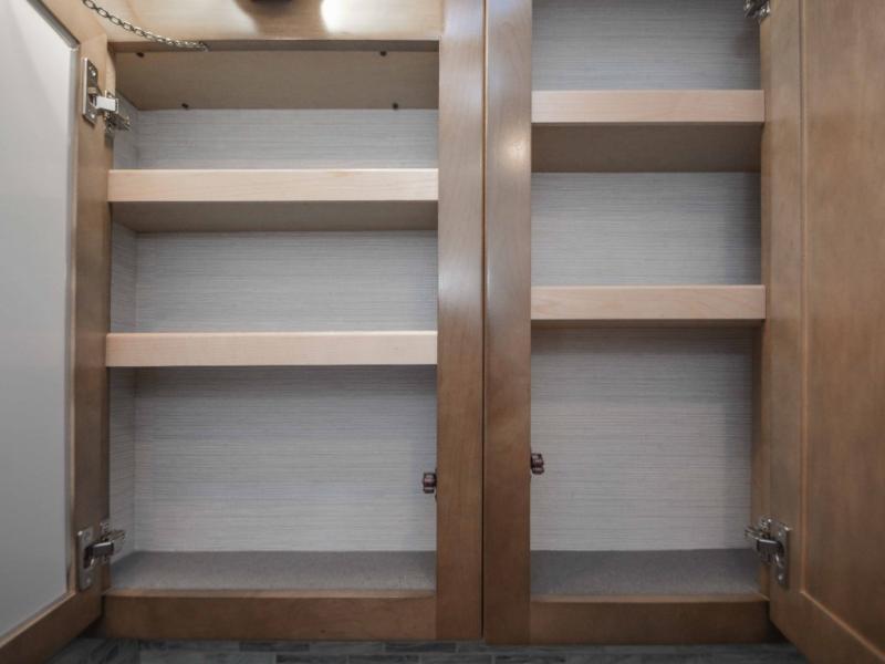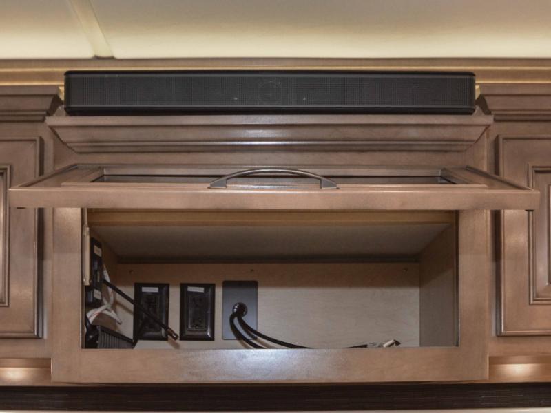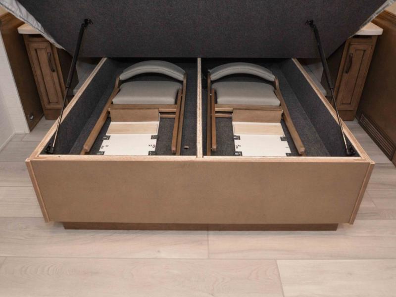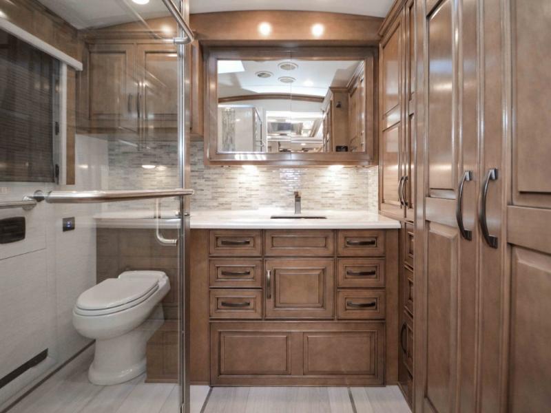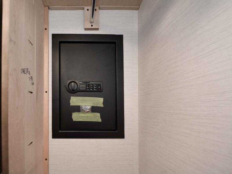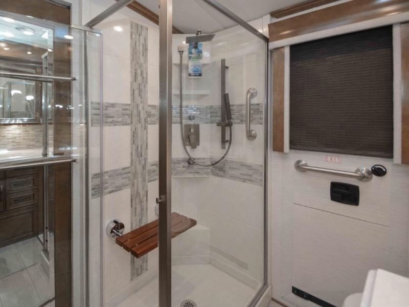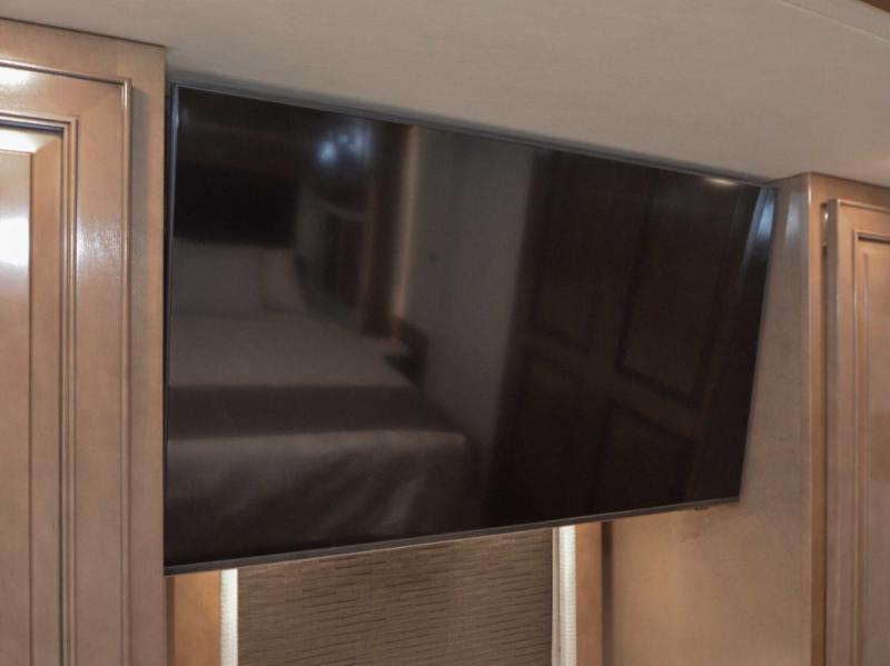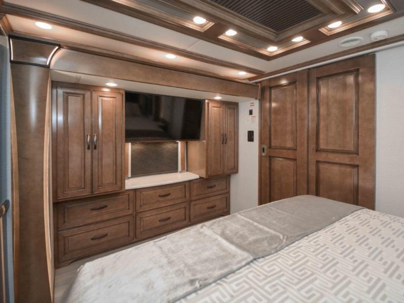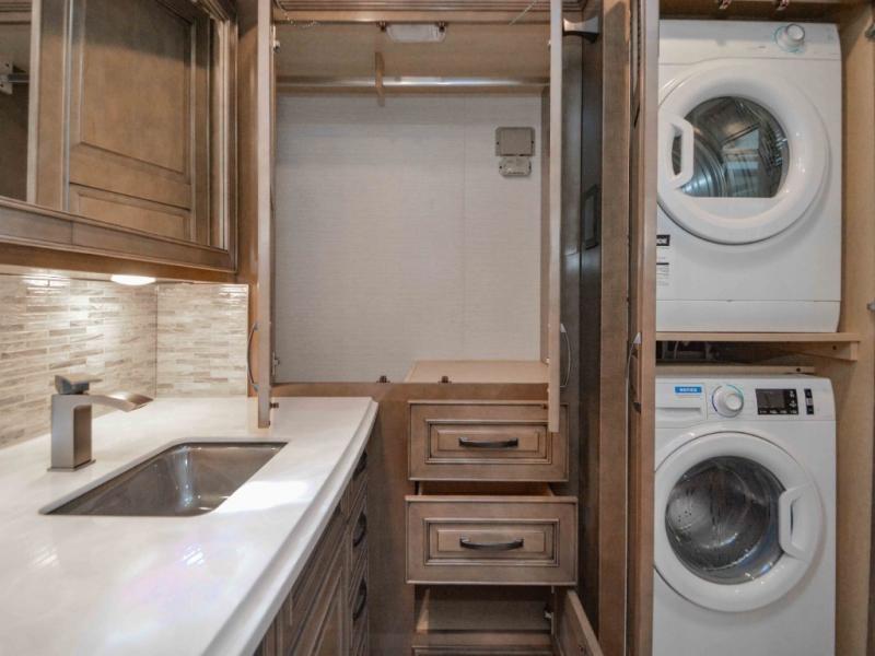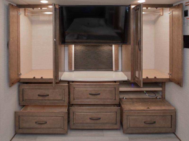 The master suite welcomes you with a king-size bed. Opposite is a Samsung 4K LED TV flanked by dual shirt wardrobes above a built-in credenza. The master bath features a 40" x 30" glass shower enclosure with fold down seat, vanity with storage above & below, plus a wardrobe with a safe for your valuables. The stacked Splendide washer and dryer await patiently behind cabinet doors until you're ready for them.