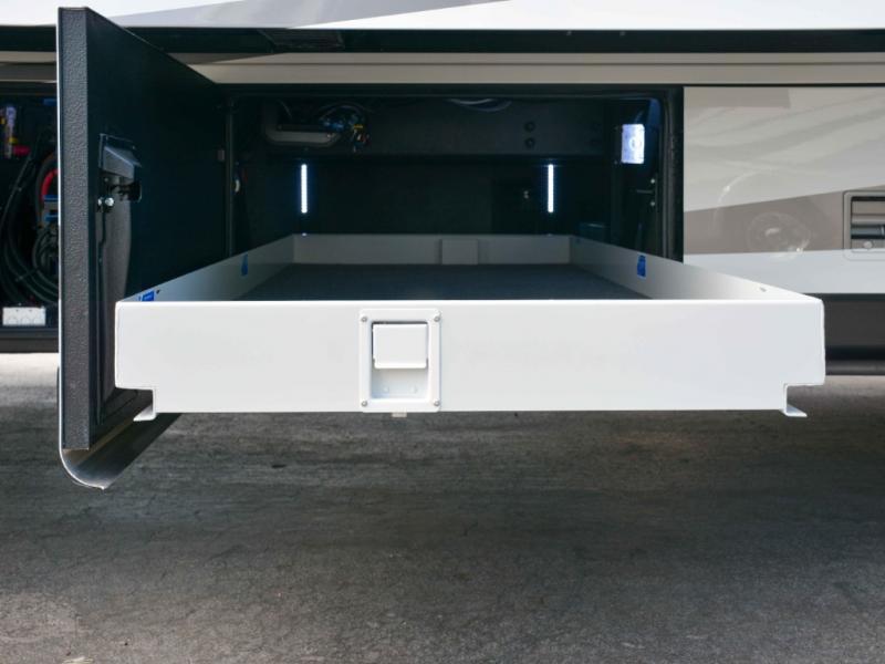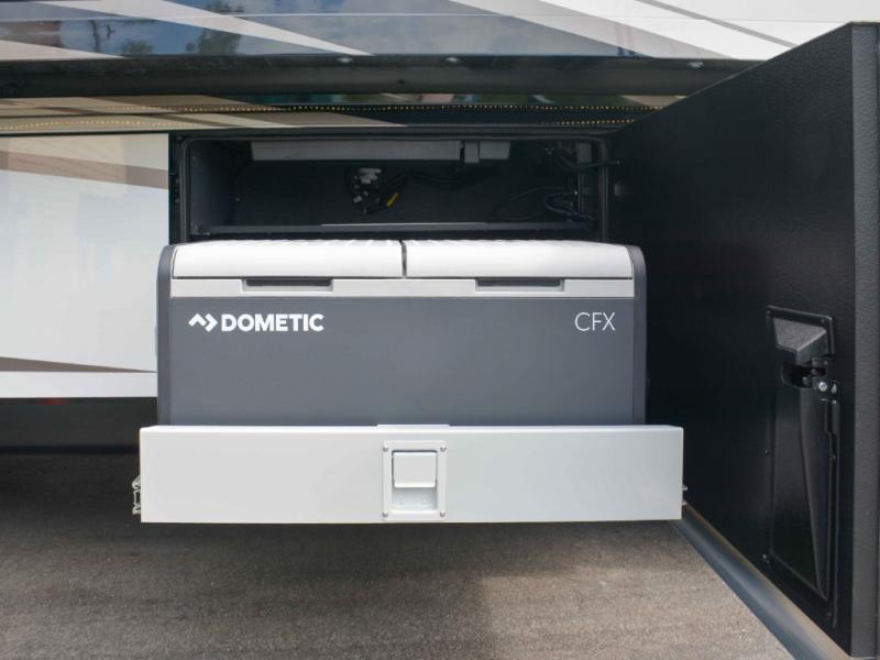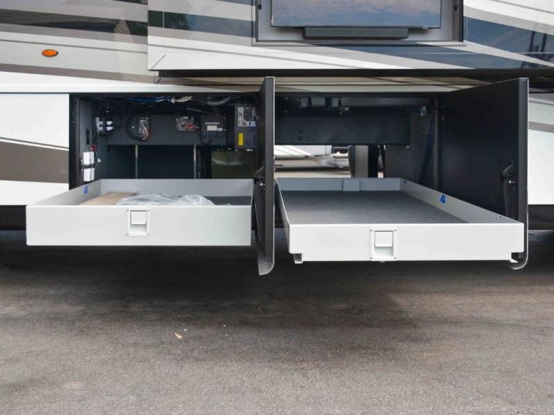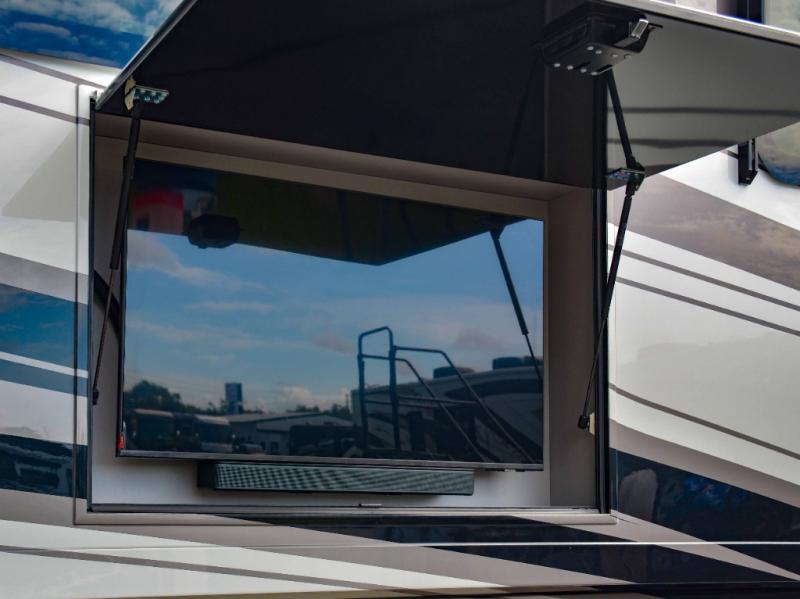 Outside this Newmar Dutch Star, you'll find every bit as much luxury as inside and the power to enjoy it. The Girard awning package includes dual power patio awnings as well as power window awnings! The sidewall television and Bose soundbar provide the entertainment while the basement slide trays and Dometic freezer offer convenience.