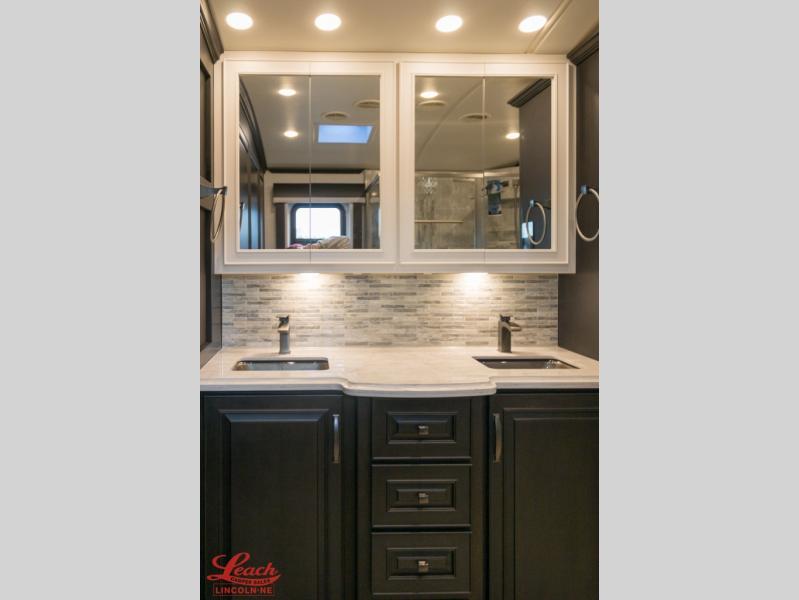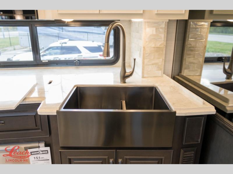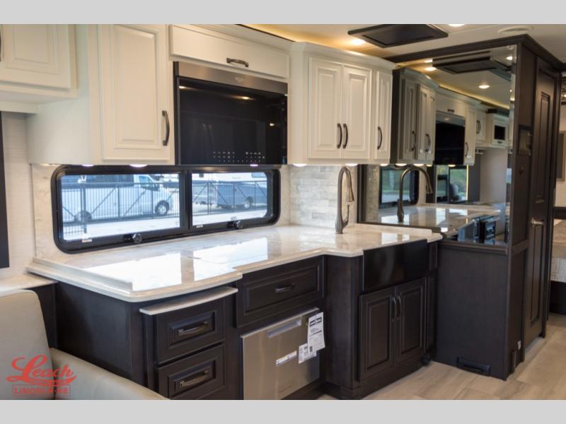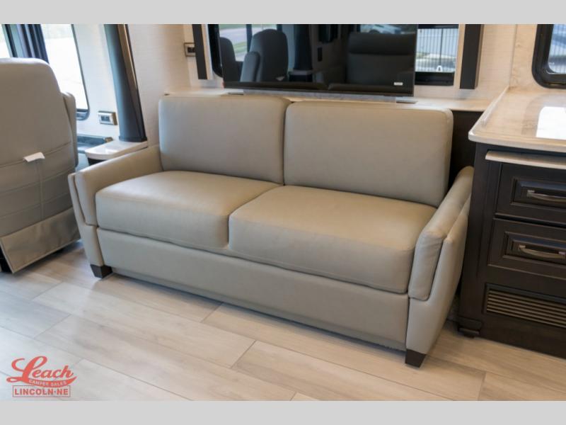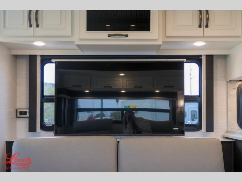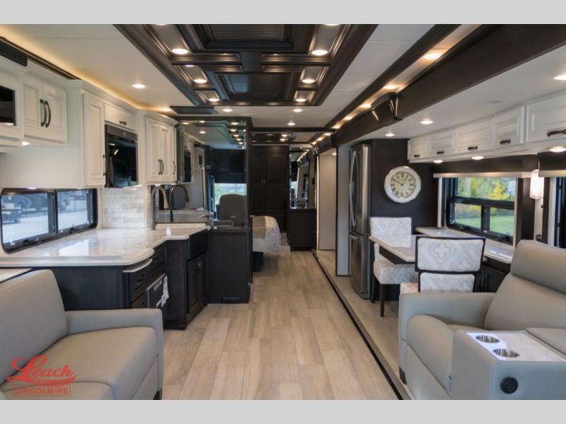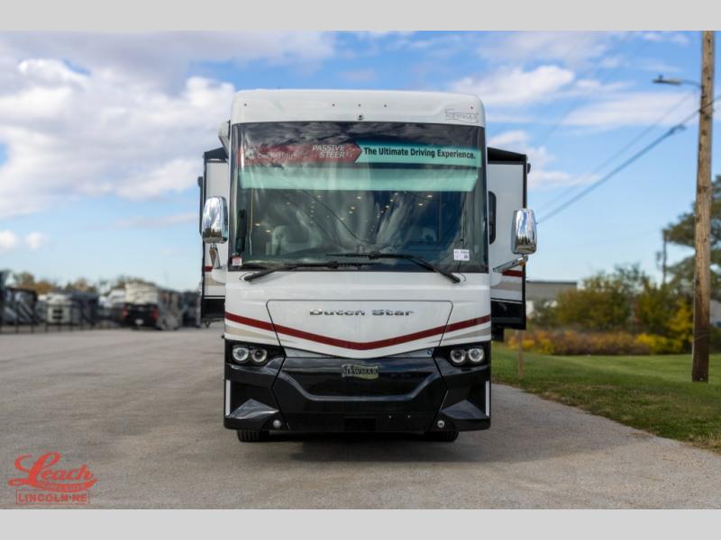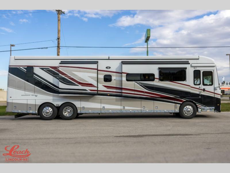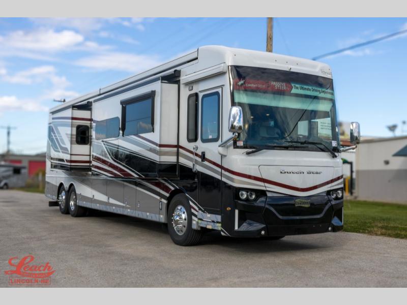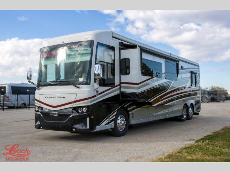 Luxury is waiting for you in this spacious Dutch Star Class A diesel motorhome that can comfortably sleep six each night. The full-wall slide plus two additional slides will open up the whole unit for a more at-home feel. Relax on the hide-a-bed sofa or read a book on the jackknife sofa. The hide-a-leaf dinette will be the perfect place to catch up on some work while you're away from home. Easily prepare breakfast, lunch, and dinner on the all-electric induction cooktop, or use the convenient stainless steel convection microwave with an air fryer feature. This model features a master suite with a pillowtop king bed, dual wardrobes and a dresser, plus an LED TV. You will love the rear bath cathedral ceiling that will add additional height, plus there is plenty of storage space and two bath sinks so that you and your spouse can freshen up at once! Specifications shown are with the standard Freightliner tag axle chassis. See dealer for details if optional Spartan K2 tag axle chassis is selected.
