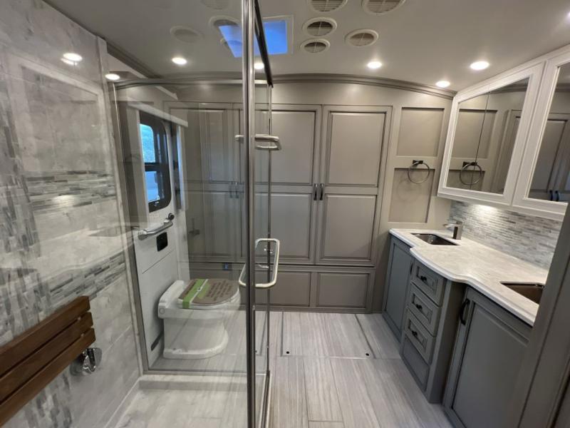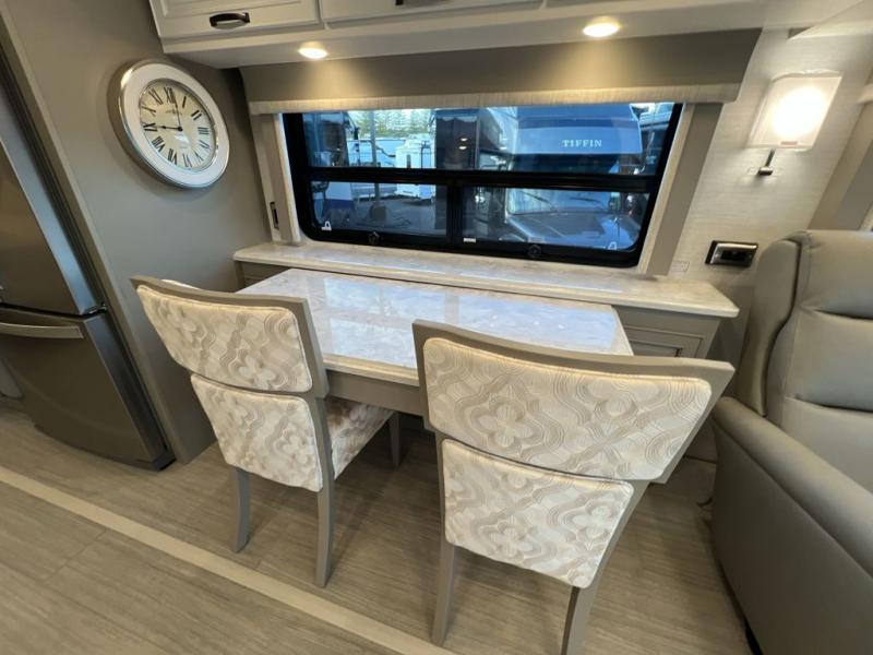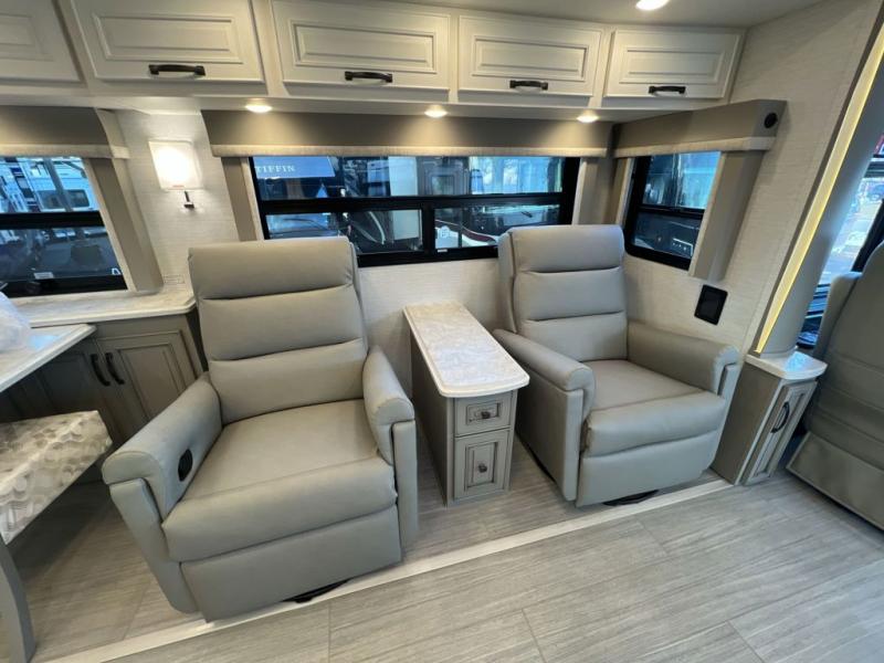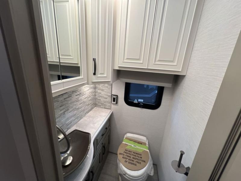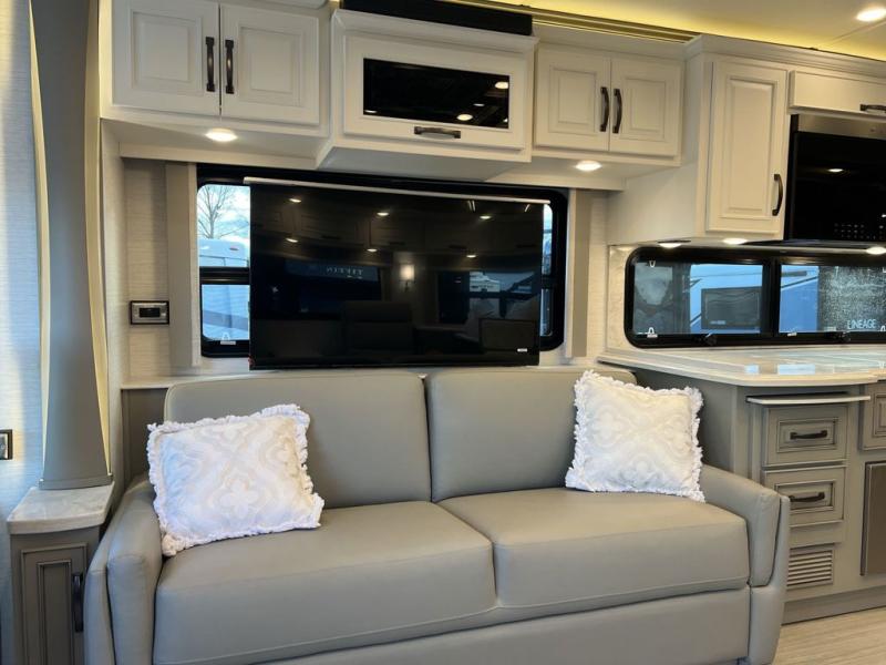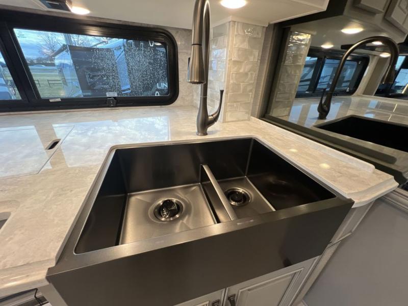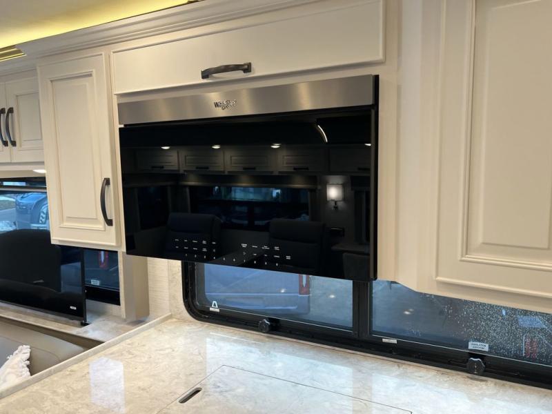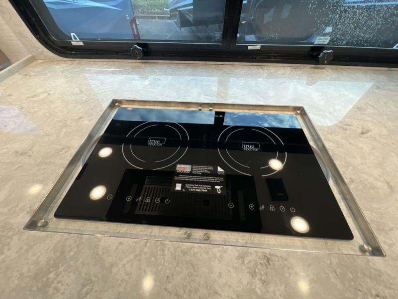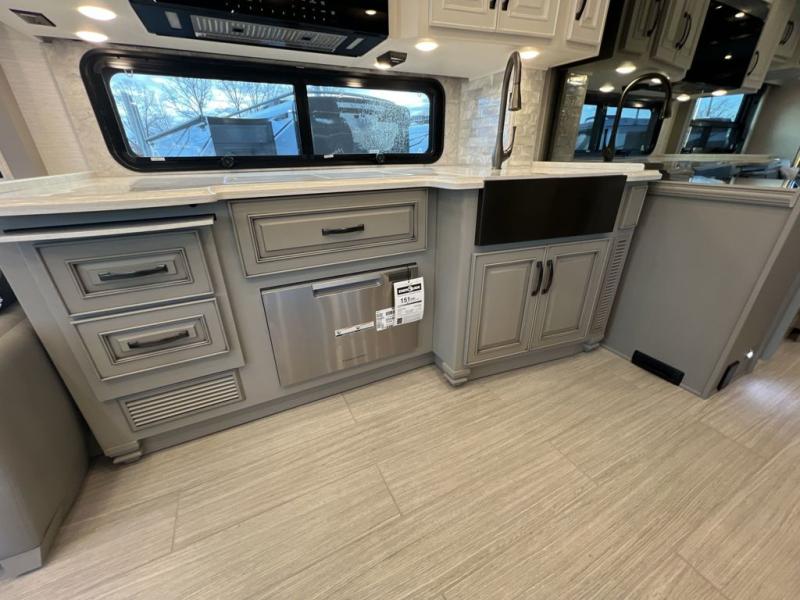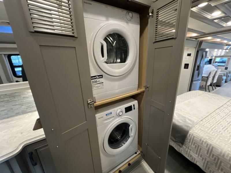 Luxury is waiting for you in this spacious Dutch Star Class A diesel motorhome that can comfortably sleep six each night. The full-wall slide plus two additional slides will open up the whole unit for a more at-home feel. Relax on the hide-a-bed sofa or read a book on the jackknife sofa. The hide-a-leaf dinette will be the perfect place to catch up on some work while you're away from home. Easily prepare breakfast, lunch, and dinner on the all-electric induction cooktop, or use the convenient stainless steel convection microwave with an air fryer feature. This model features a master suite with a pillowtop king bed, dual wardrobes and a dresser, plus an LED TV. You will love the rear bath cathedral ceiling that will add additional height, plus there is plenty of storage space and two bath sinks so that you and your spouse can freshen up at once! Specifications shown are with the standard Freightliner tag axle chassis. See dealer for details if optional Spartan K2 tag axle chassis is selected.