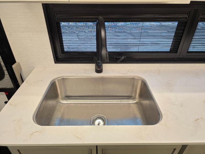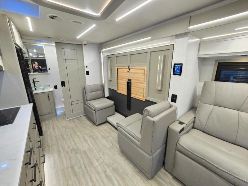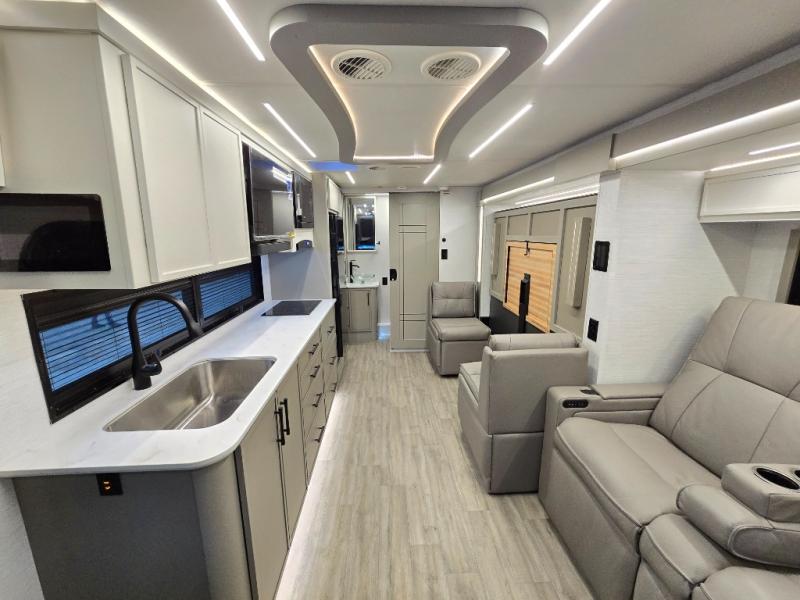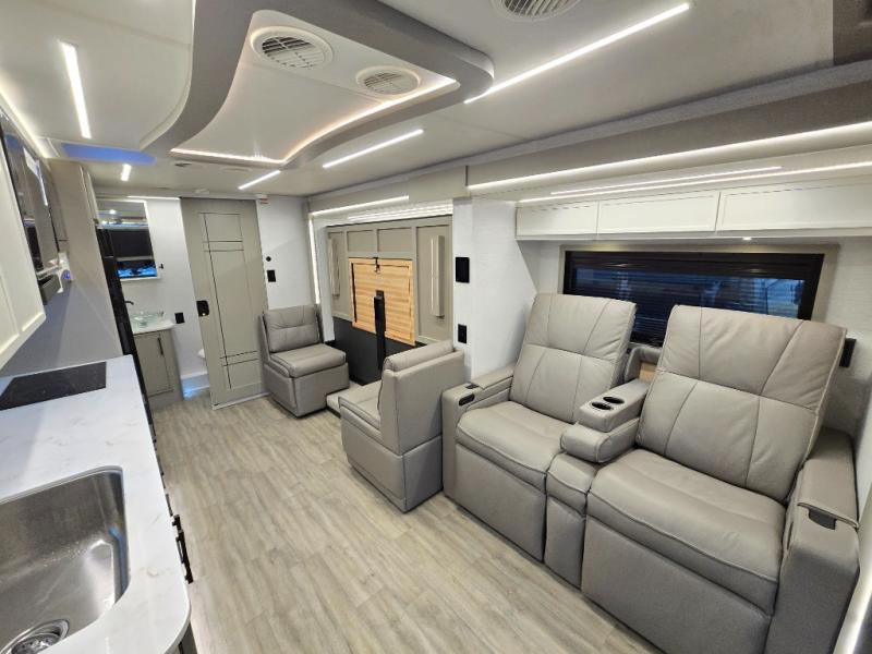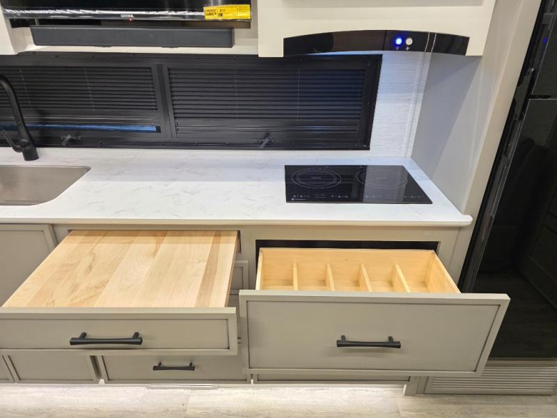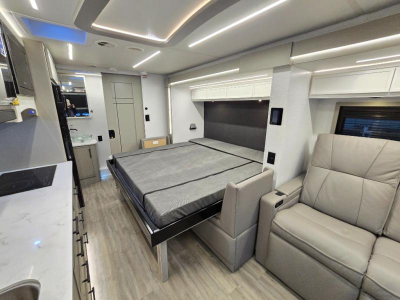 Experience true comfort in this spacious coach for six! There is a full-wall slide which houses the fold-down Murphy bed with a 74" sofa, plus a U-shaped dinette where you dine each day. And a 49" x 78" cab-over bunk lets additional guests sleep over. You can prepare lunch on the two burner cooktop when you've worked up an appetite, then store leftovers in the 8 cu. ft. Suburban refrigerator. A full rear bath includes a 32" x 24" shower, a wardrobe for your clothes, and extra storage for towels and bath necessities. An optional layout for this unit features a booth dinette in place of the sofa and a theater seat in place of the U-shaped dinette if you choose this configuration instead!
