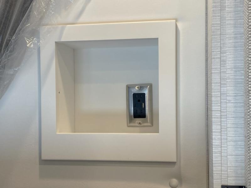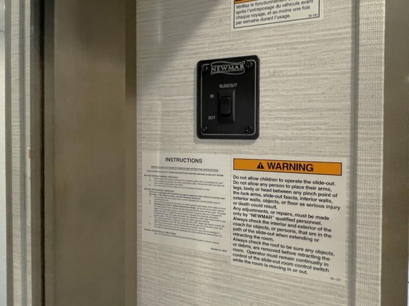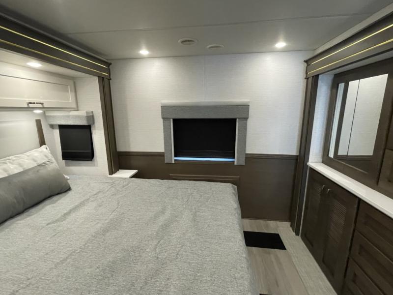 Private Rear Bedroom with King Bed Slide – Power retracting bed, dual shirt wardrobes, dresser, and washer/dryer prep