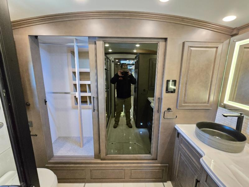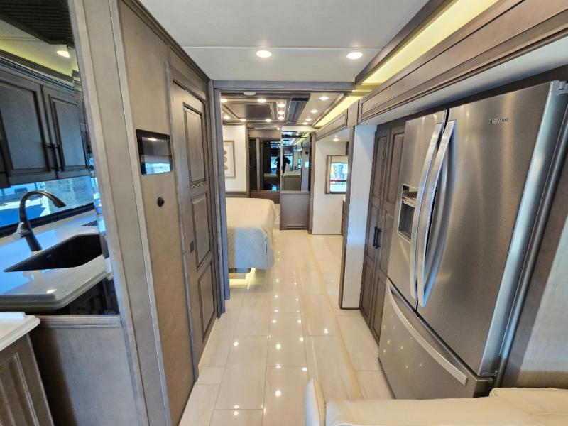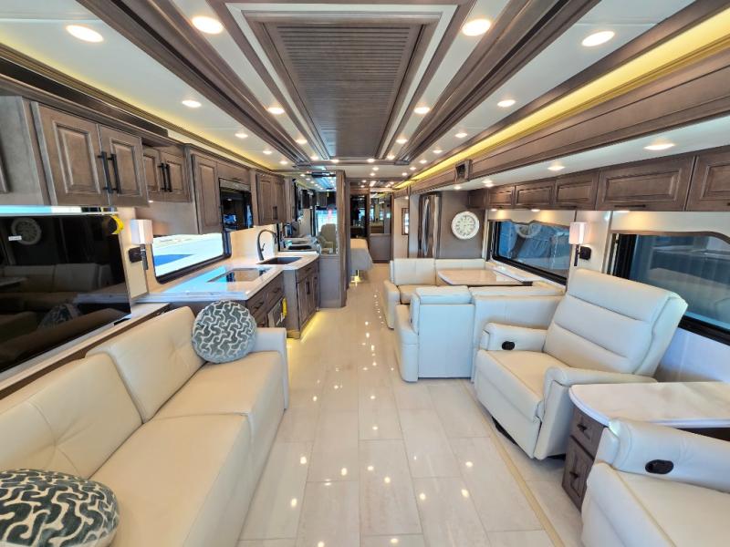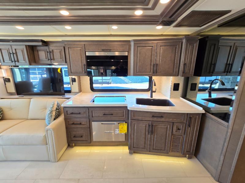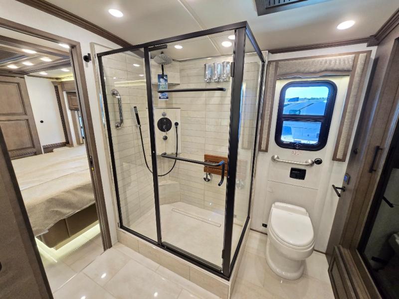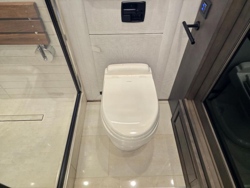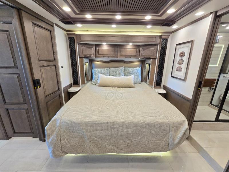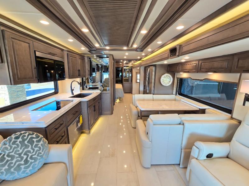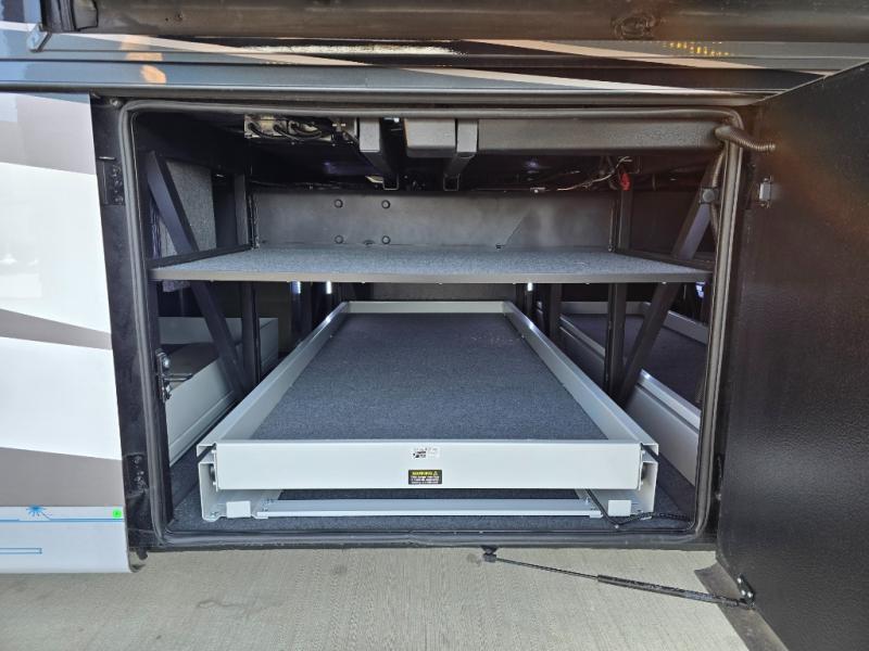 The London Aire Class A diesel motorhome by Newmar starts with a Freightliner chassis with a tag axle and 605 HP, tire pressure monitoring on the tag axle chassis, aluminum wheels, and an electronic chassis information center in dash. There is also 5/8" foam insulation laminated in sidewalls and ceiling to ensure years of use. You will stay comfortable with the three 15M Penguin heat pump central air conditioners with remote control thermostat that will keep you warm during those cooler months. Each model includes super polished solid surface countertops, hardwood cabinets with raised panel doors, and many more luxuries. Some of the conveniences you are sure to appreciate are the central vacuum with a tool kit, the Aqua Miser shower system, and the air leveling control system for hassle-free setup.