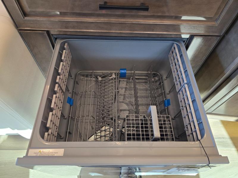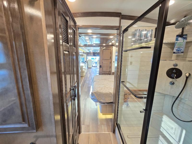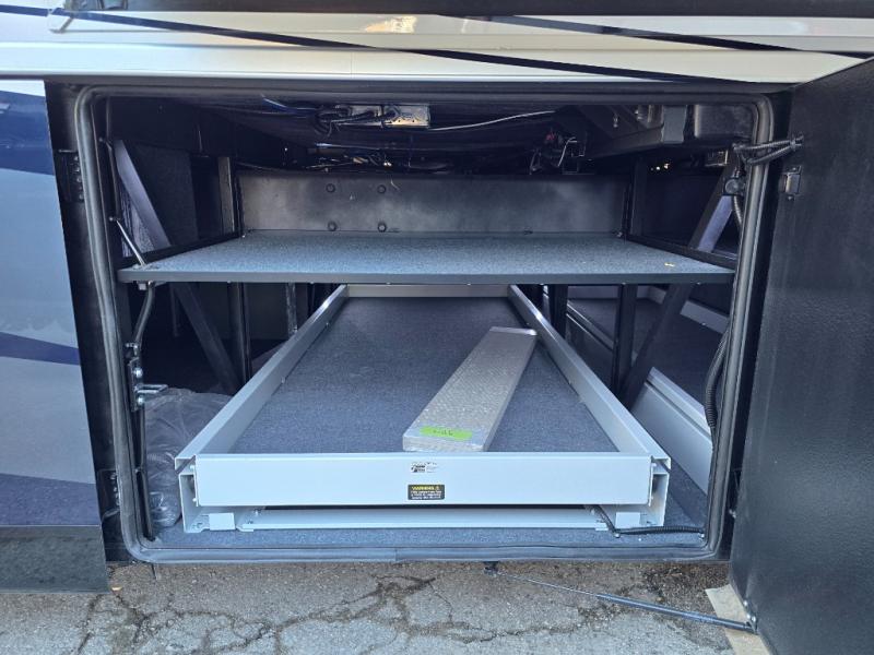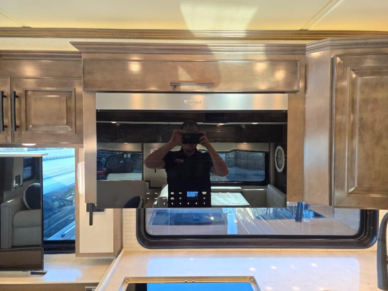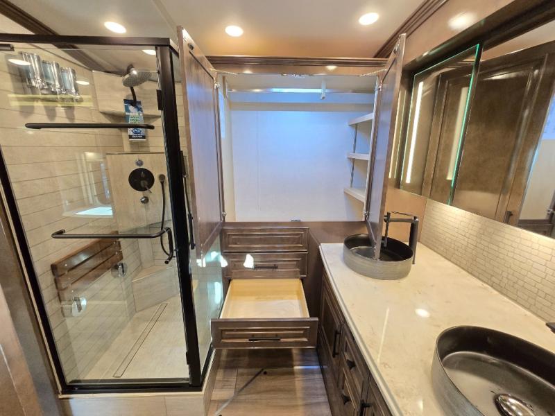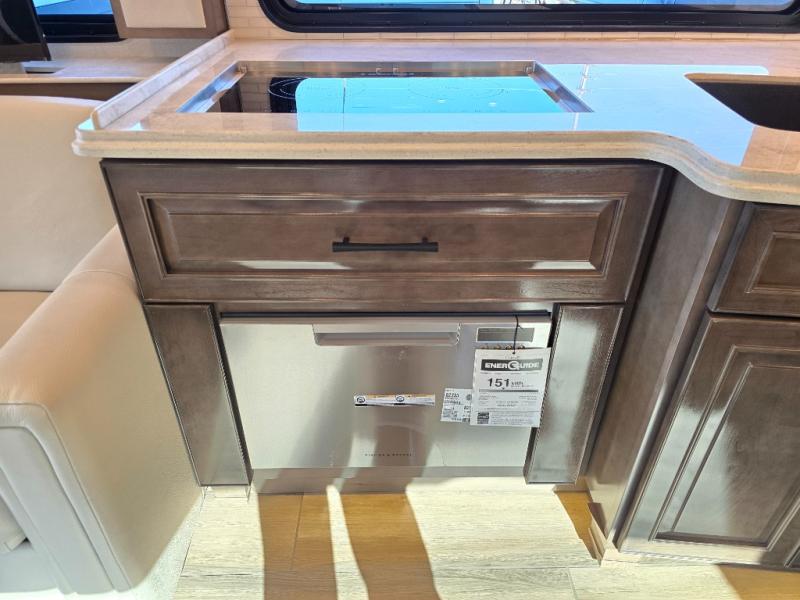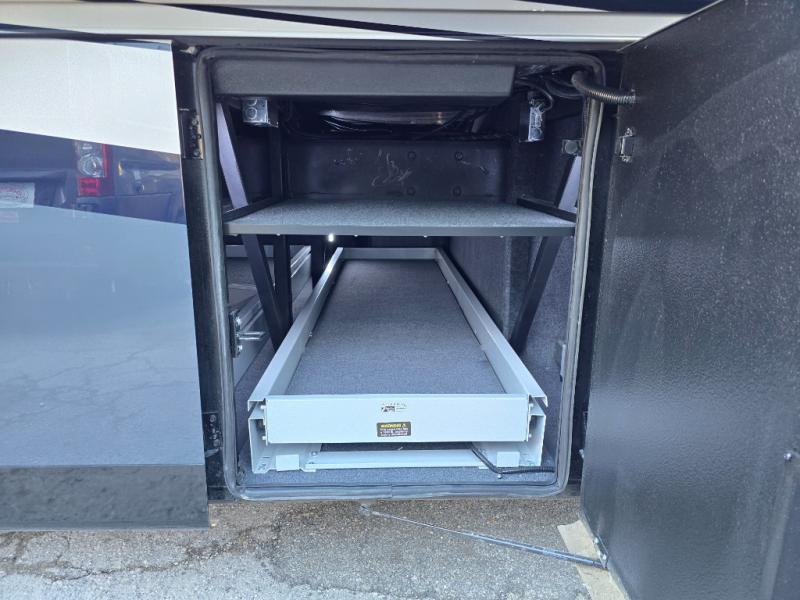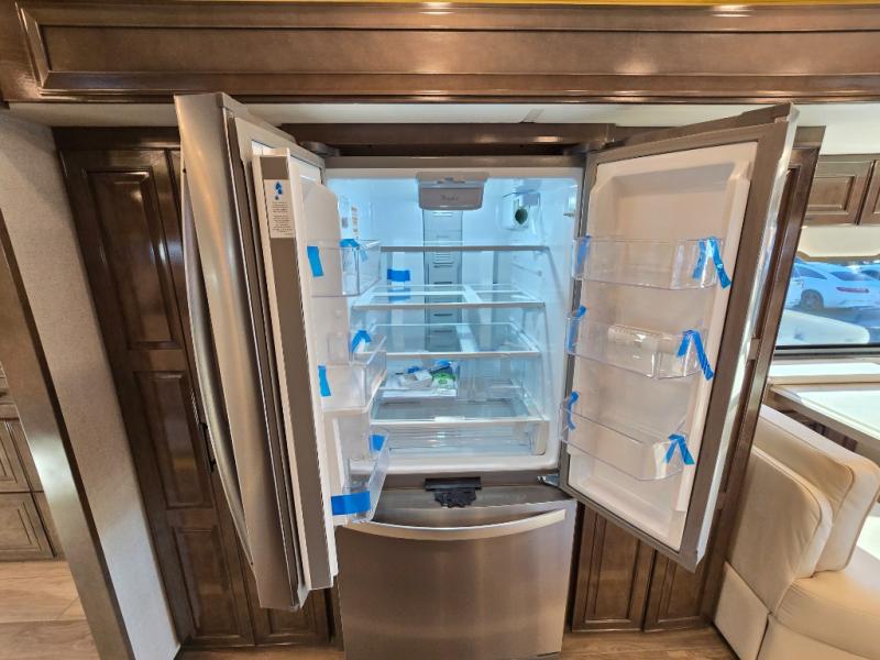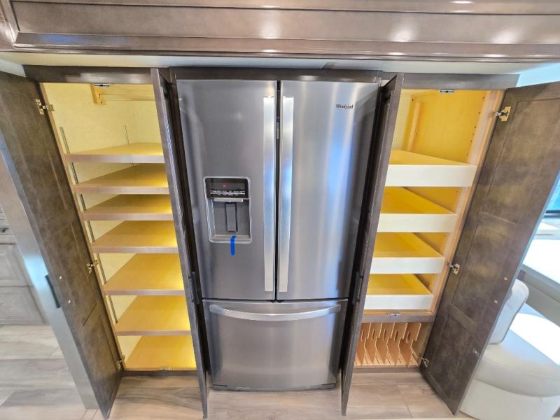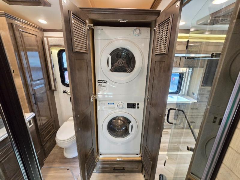 Have an amazing ride in the brand-new luxurious motorhome. This unit is perfect for five. Sleep comfortably in the bedroom on the 72" x 80" king bed ideal for you and your partner, store your things in the dresser, and entertain yourself watching the TV. Guests or the rest of the family can easily fit on the 87" hide-a-bed sofa and the 74" jack knife sofa. Moreover, cook delicious meals in a chef's dream kitchen, which includes a 17.9 cu. Whirlpool refrigerator, 30" stainless steel convection microwave with air fryer feature, hide-a-leaf dinette, overhead cabinets, pantry, and shelf storage. Finally have a relaxing time in the luxury and spacious rear bathroom. The dual sink will allow you and a plus one to do your skincare routine together, plus, it includes wardrobes with drawers and a washer and dryer space. Finally, after a long ride, take a refreshing bath in the 40” x 32” shower.