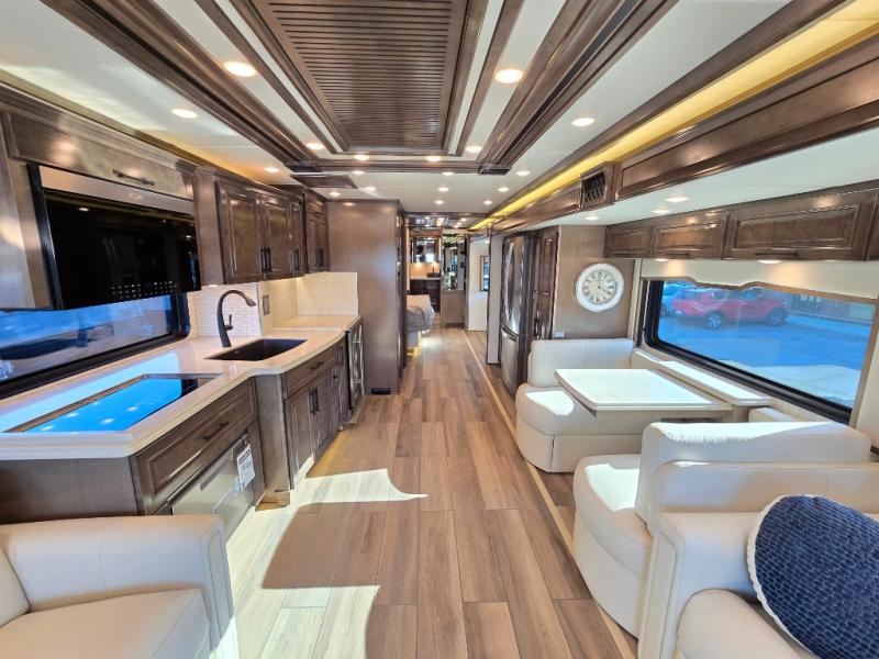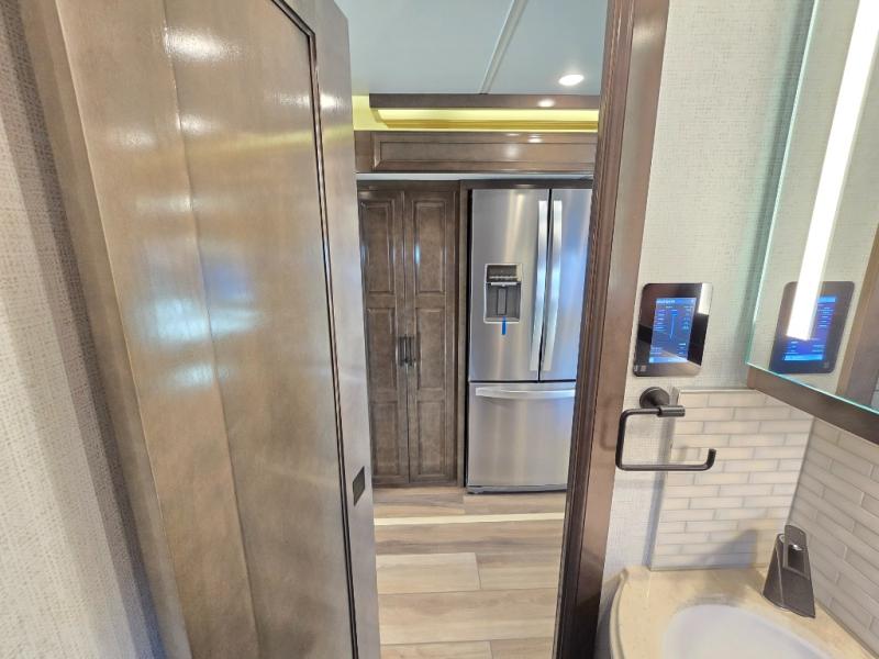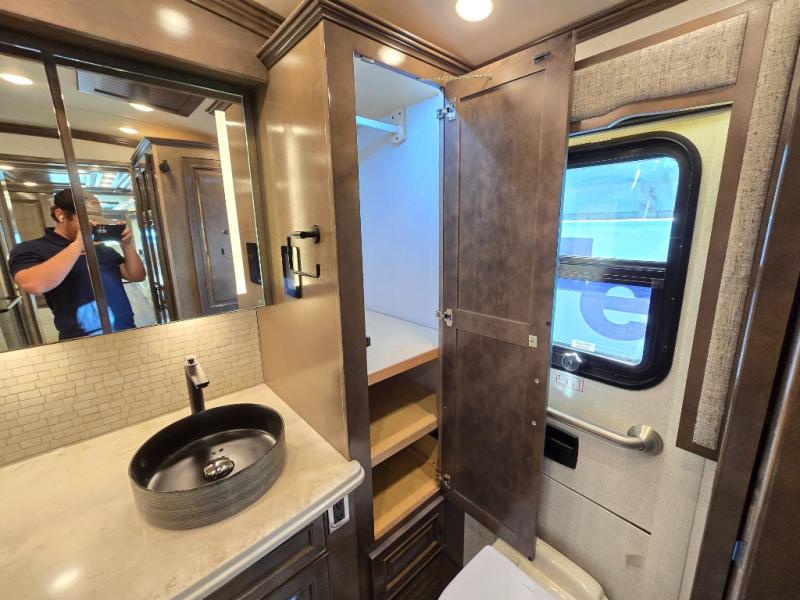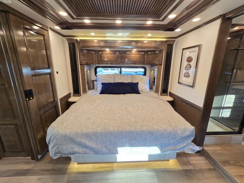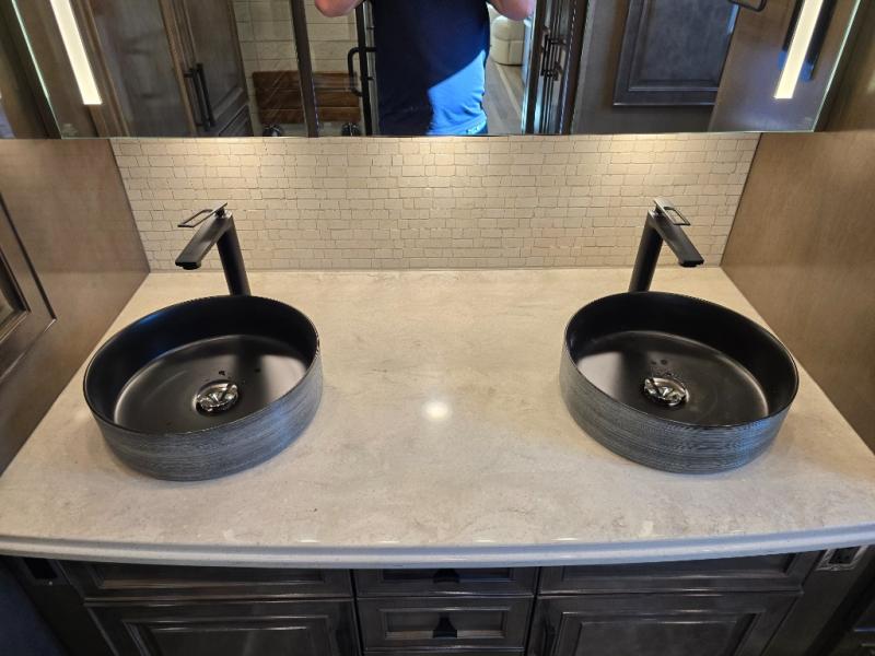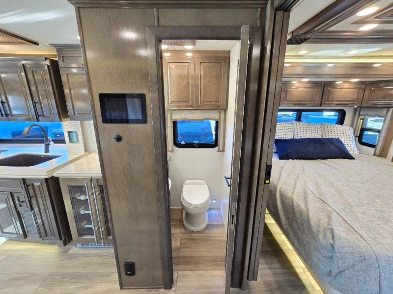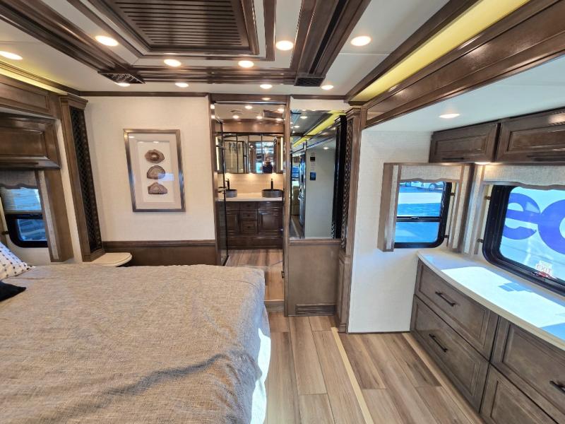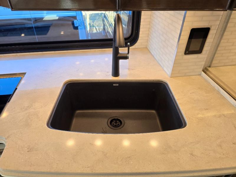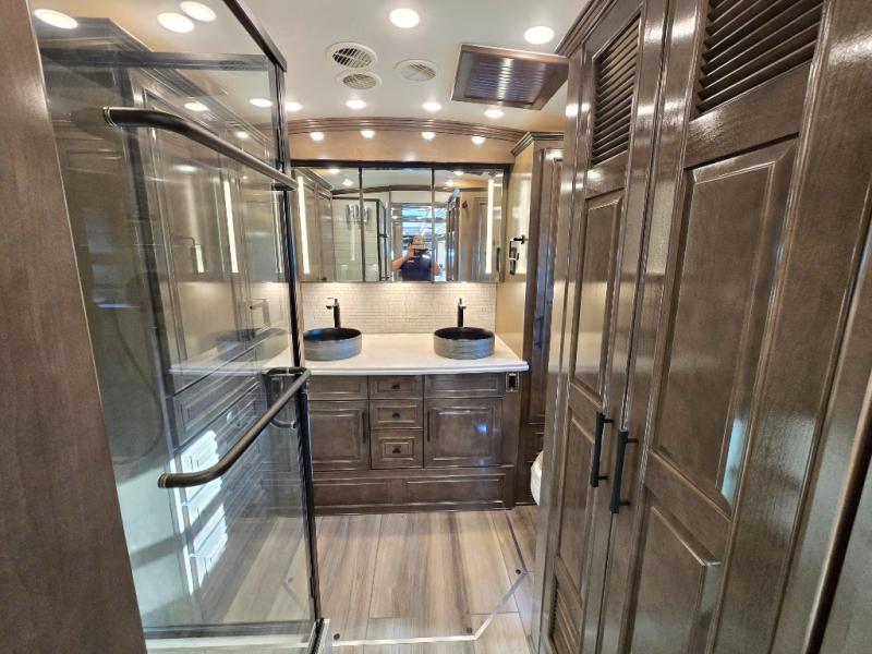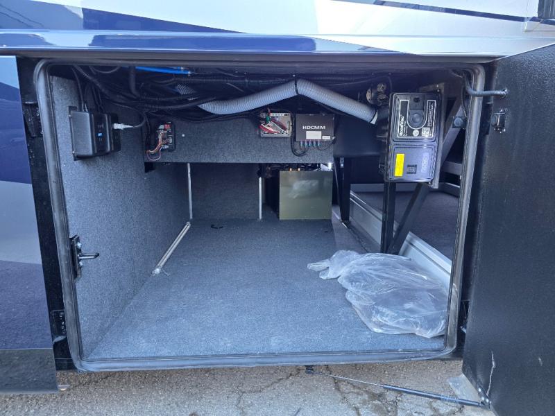 Have an amazing ride in the brand-new luxurious motorhome. This unit is perfect for five. Sleep comfortably in the bedroom on the 72" x 80" king bed ideal for you and your partner, store your things in the dresser, and entertain yourself watching the TV. Guests or the rest of the family can easily fit on the 87" hide-a-bed sofa and the 74" jack knife sofa. Moreover, cook delicious meals in a chef's dream kitchen, which includes a 17.9 cu. Whirlpool refrigerator, 30" stainless steel convection microwave with air fryer feature, hide-a-leaf dinette, overhead cabinets, pantry, and shelf storage. Finally have a relaxing time in the luxury and spacious rear bathroom. The dual sink will allow you and a plus one to do your skincare routine together, plus, it includes wardrobes with drawers and a washer and dryer space. Finally, after a long ride, take a refreshing bath in the 40” x 32” shower.