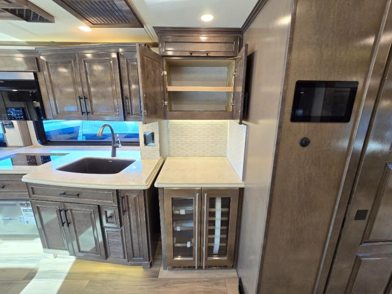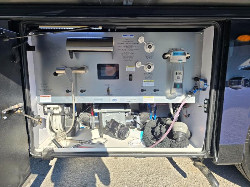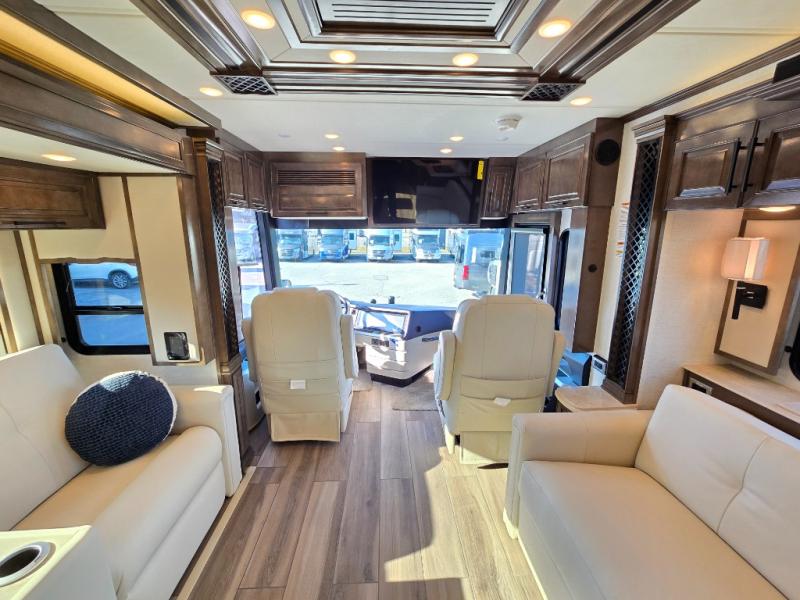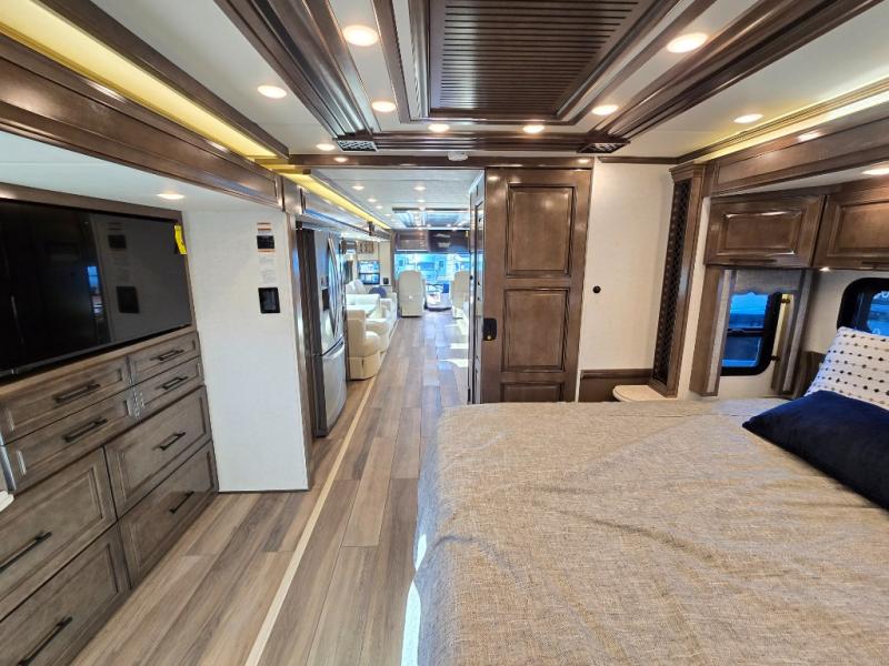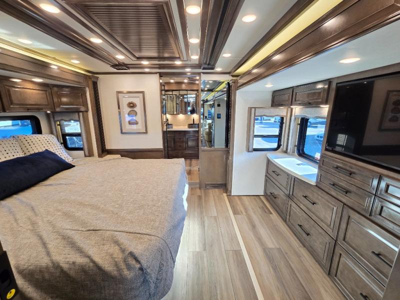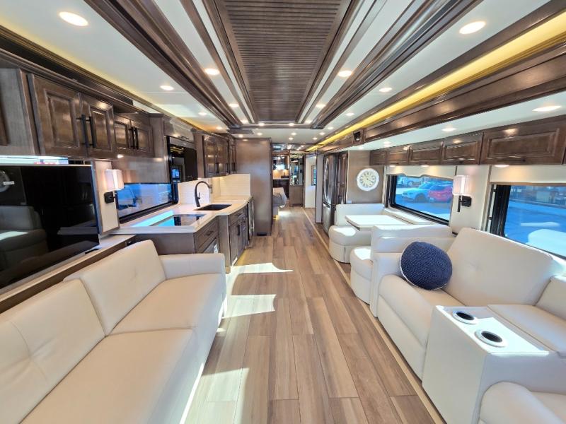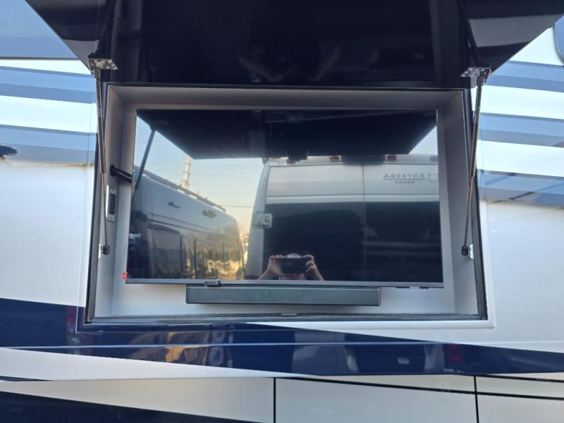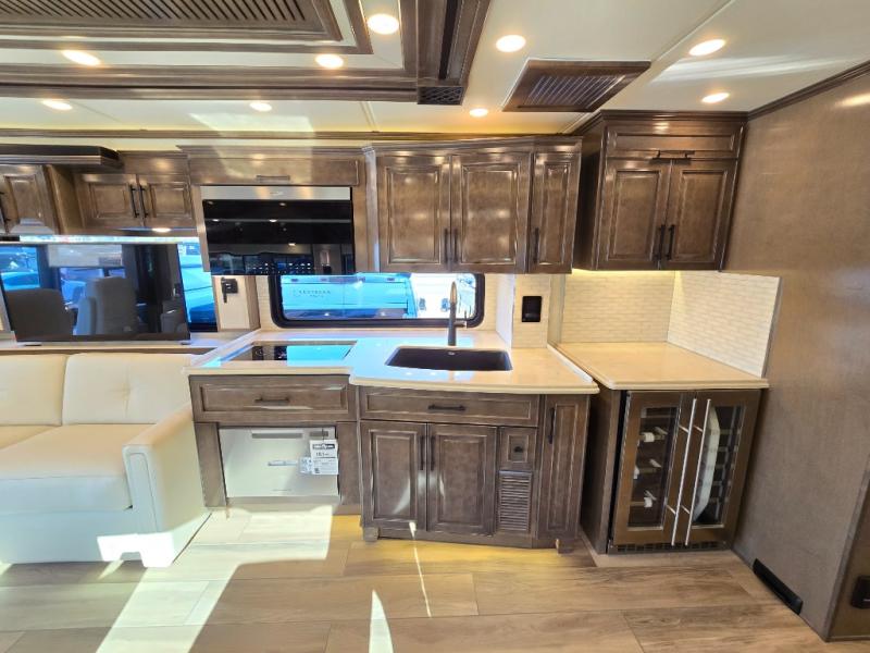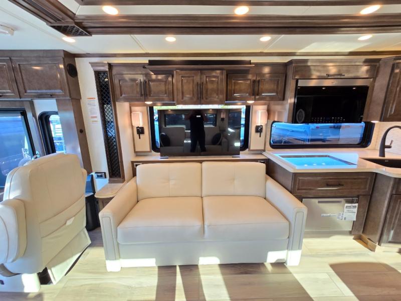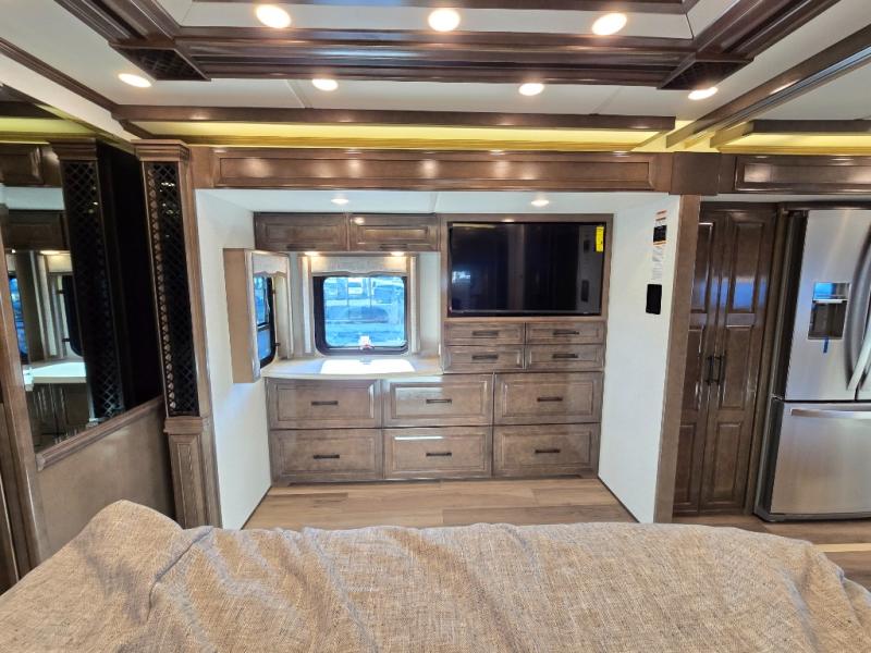 Have an amazing ride in the brand-new luxurious motorhome. This unit is perfect for five. Sleep comfortably in the bedroom on the 72" x 80" king bed ideal for you and your partner, store your things in the dresser, and entertain yourself watching the TV. Guests or the rest of the family can easily fit on the 87" hide-a-bed sofa and the 74" jack knife sofa. Moreover, cook delicious meals in a chef's dream kitchen, which includes a 17.9 cu. Whirlpool refrigerator, 30" stainless steel convection microwave with air fryer feature, hide-a-leaf dinette, overhead cabinets, pantry, and shelf storage. Finally have a relaxing time in the luxury and spacious rear bathroom. The dual sink will allow you and a plus one to do your skincare routine together, plus, it includes wardrobes with drawers and a washer and dryer space. Finally, after a long ride, take a refreshing bath in the 40” x 32” shower.