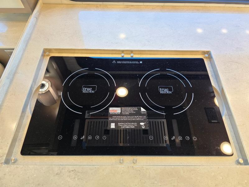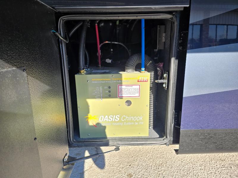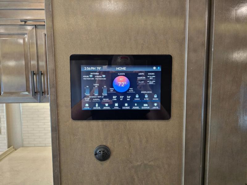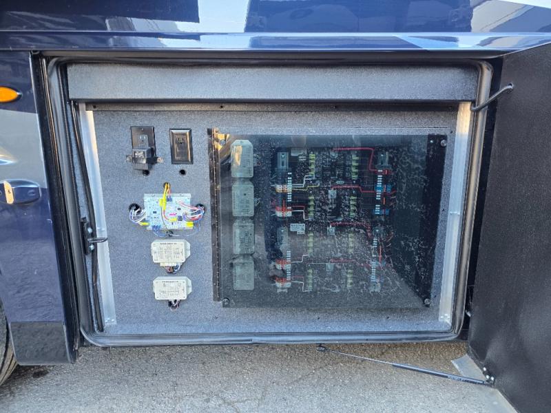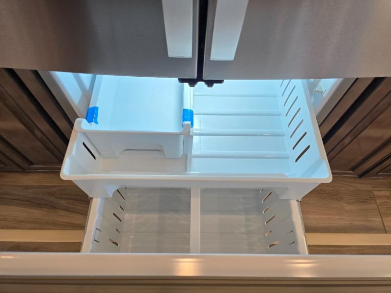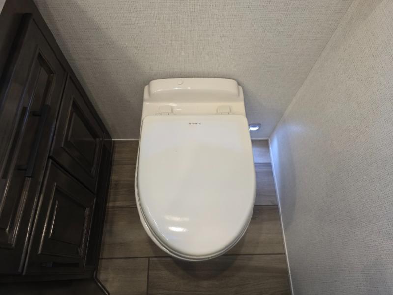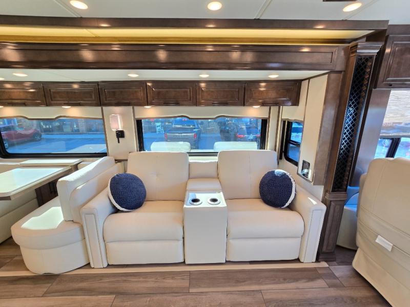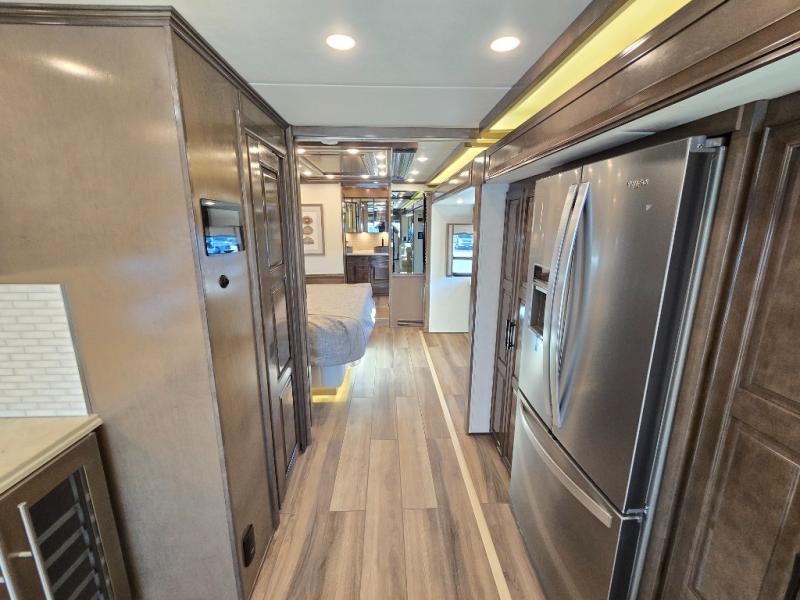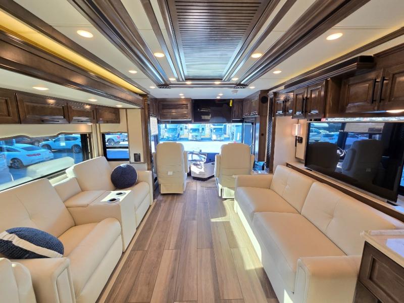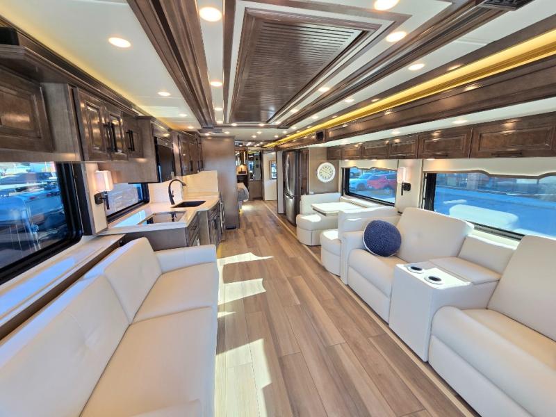 Have an amazing ride in the brand-new luxurious motorhome. This unit is perfect for five. Sleep comfortably in the bedroom on the 72" x 80" king bed ideal for you and your partner, store your things in the dresser, and entertain yourself watching the TV. Guests or the rest of the family can easily fit on the 87" hide-a-bed sofa and the 74" jack knife sofa. Moreover, cook delicious meals in a chef's dream kitchen, which includes a 17.9 cu. Whirlpool refrigerator, 30" stainless steel convection microwave with air fryer feature, hide-a-leaf dinette, overhead cabinets, pantry, and shelf storage. Finally have a relaxing time in the luxury and spacious rear bathroom. The dual sink will allow you and a plus one to do your skincare routine together, plus, it includes wardrobes with drawers and a washer and dryer space. Finally, after a long ride, take a refreshing bath in the 40” x 32” shower.