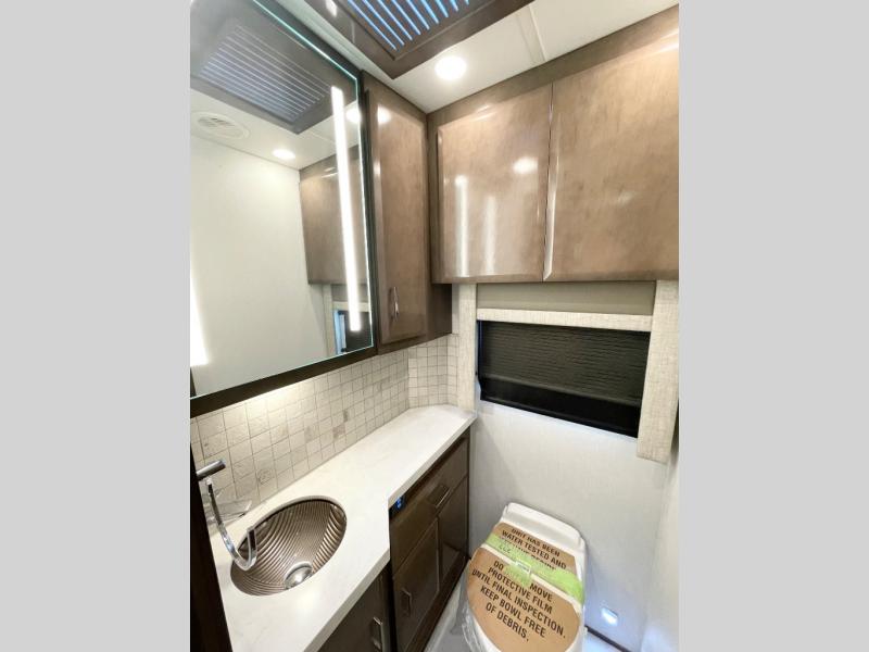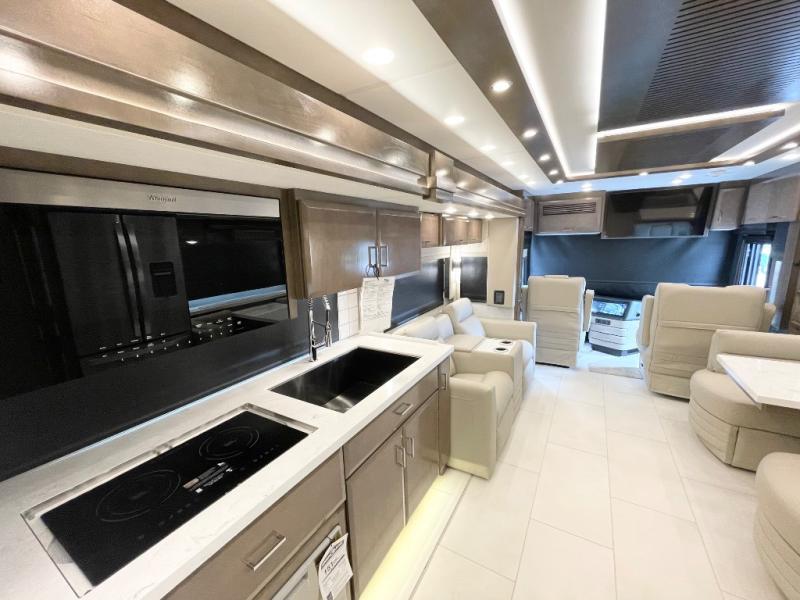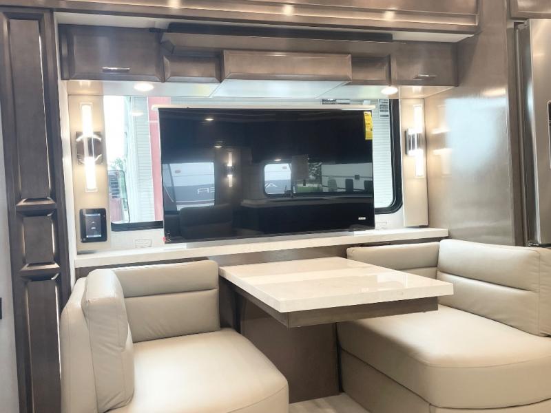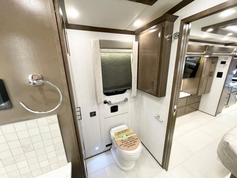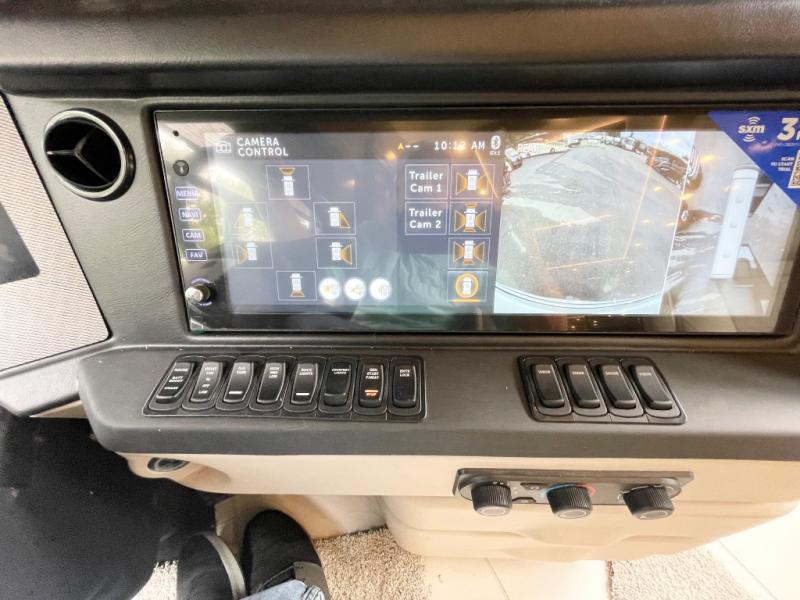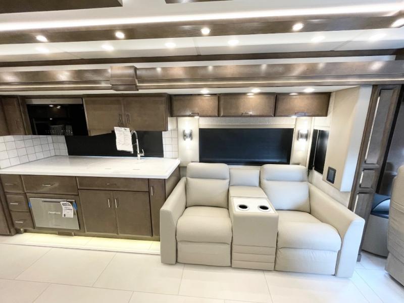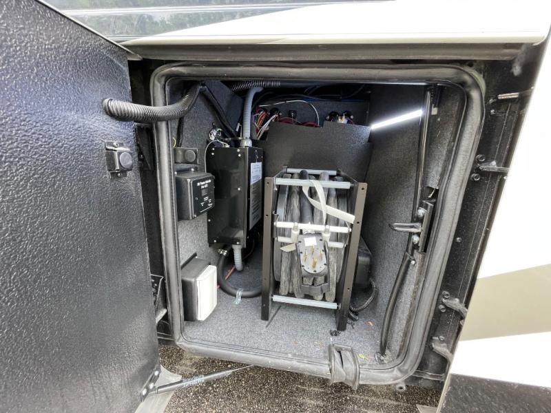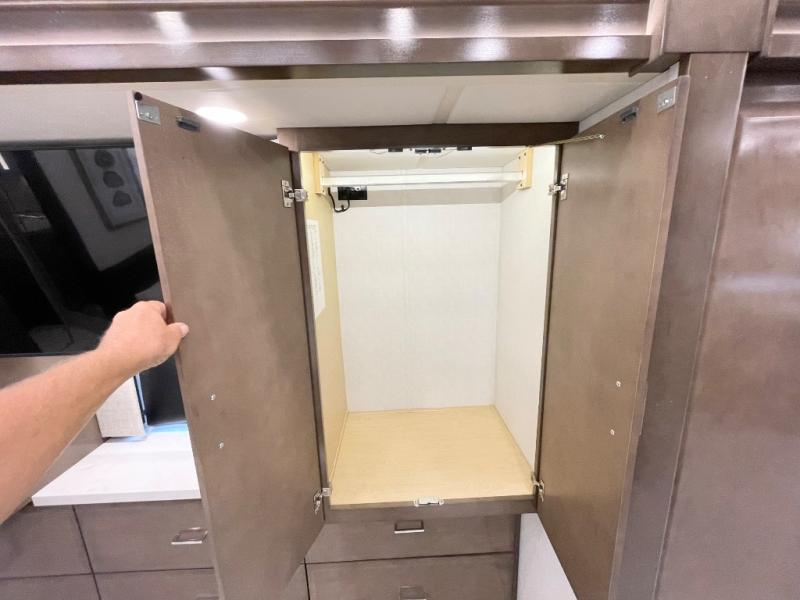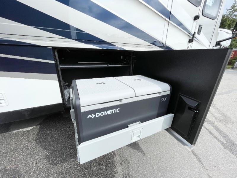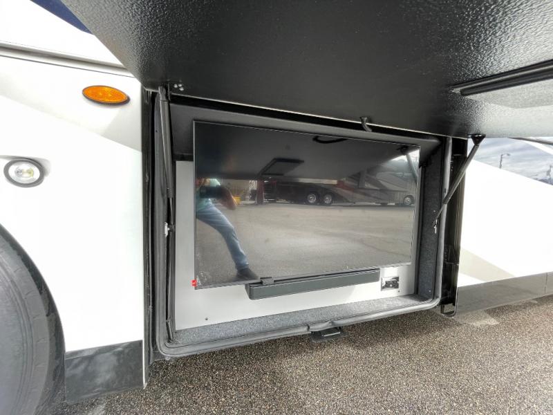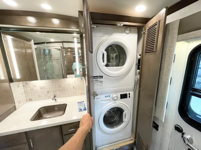 This motorhome has everything you need for a comfortable road trip! The master suite has a king bed slide for a good night's rest across from a dresser with a Samsung LED TV and shirt wardrobes on either side. Attached to the bedroom is your very own full rear bathroom which has a 42" x 35" angled shower next to a wardrobe with drawers and a Splendide washer and dryer next to the vanity sink. The chef will have everything they need to prepare delicious home cooked meals including a stainless steel 30" convection microwave with air fryer feature and a Whirlpool 19.7 cu. ft. refrigerator to keep the perishables fresh, plus the half bathroom is by the kitchen for quick bathroom breaks while cooking. Enjoy your meals at the Euro booth dinette (non-sleeper) and relax on the 74" hide-a-bed sofa while watching your favorite movies on the Samsung LED TV on power lift!
