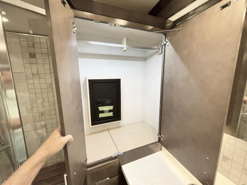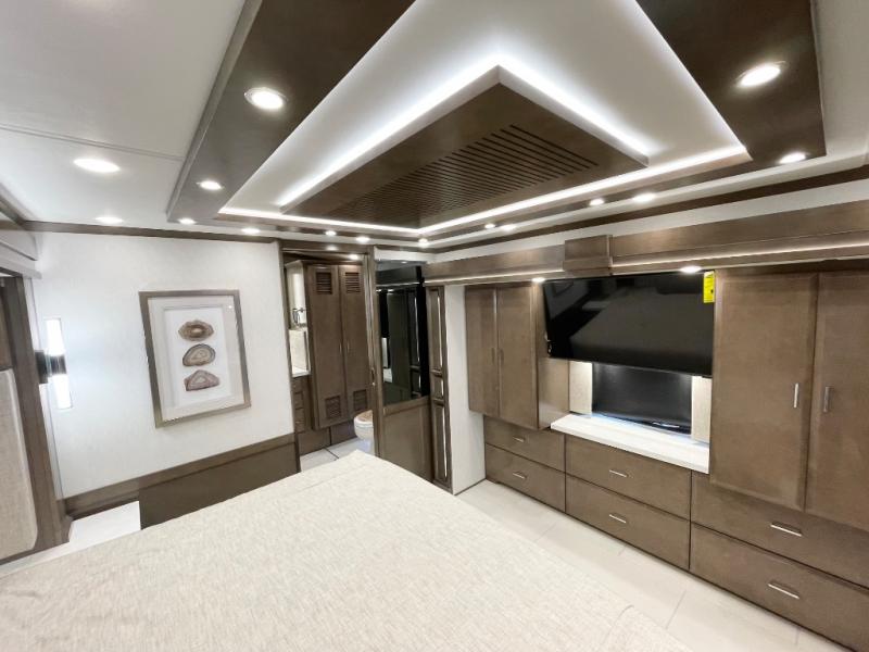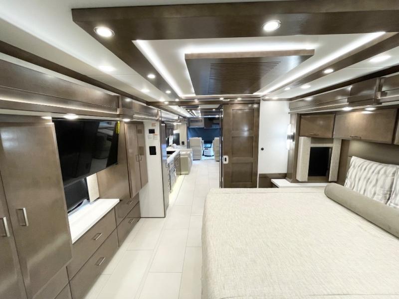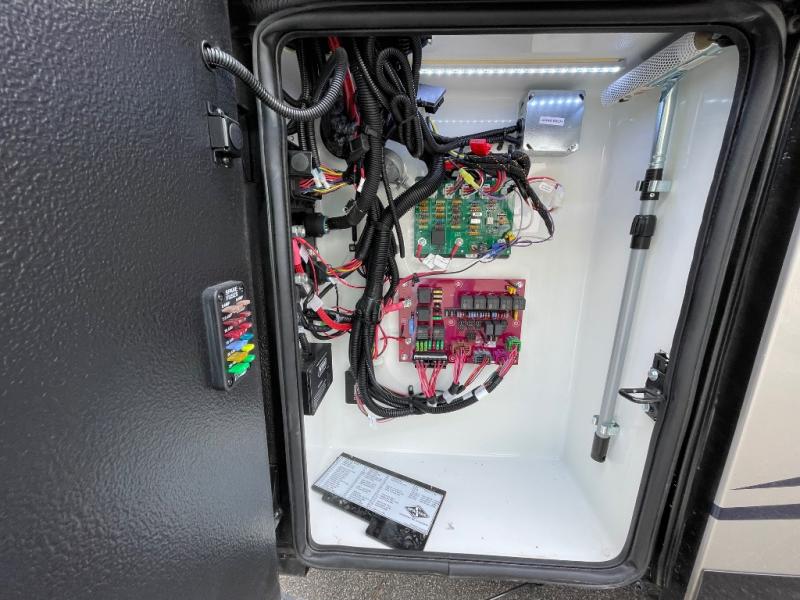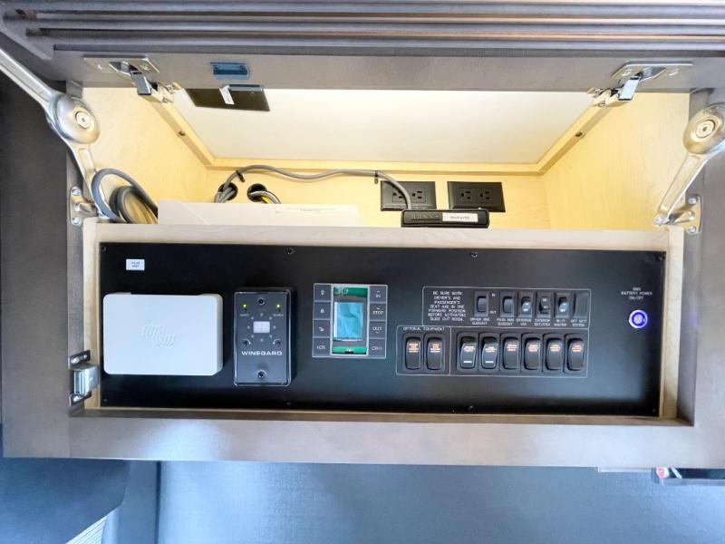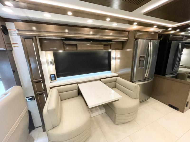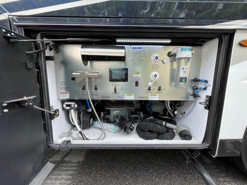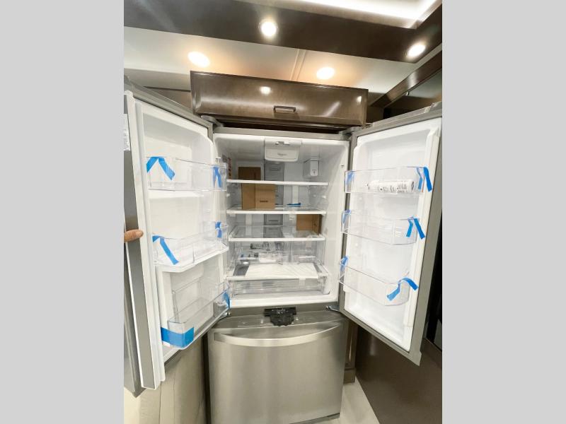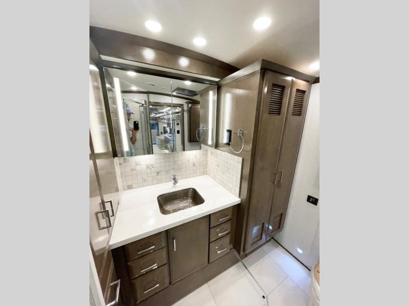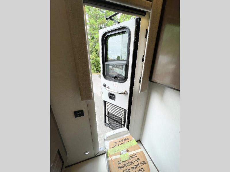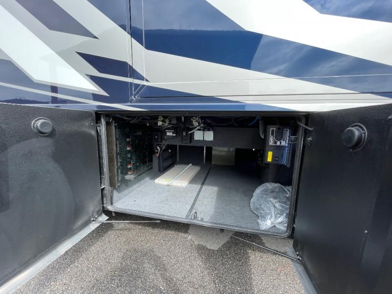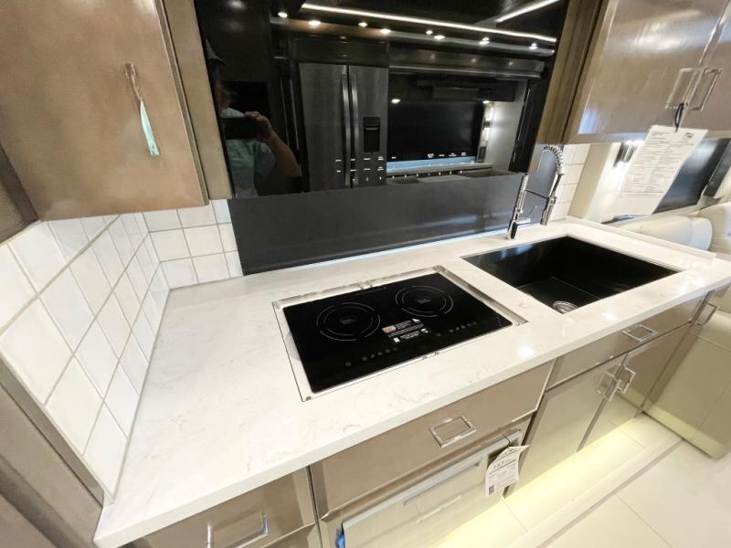 This motorhome has everything you need for a comfortable road trip! The master suite has a king bed slide for a good night's rest across from a dresser with a Samsung LED TV and shirt wardrobes on either side. Attached to the bedroom is your very own full rear bathroom which has a 42" x 35" angled shower next to a wardrobe with drawers and a Splendide washer and dryer next to the vanity sink. The chef will have everything they need to prepare delicious home cooked meals including a stainless steel 30" convection microwave with air fryer feature and a Whirlpool 19.7 cu. ft. refrigerator to keep the perishables fresh, plus the half bathroom is by the kitchen for quick bathroom breaks while cooking. Enjoy your meals at the Euro booth dinette (non-sleeper) and relax on the 74" hide-a-bed sofa while watching your favorite movies on the Samsung LED TV on power lift!