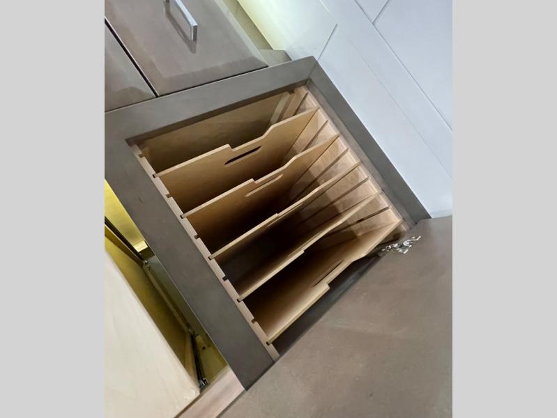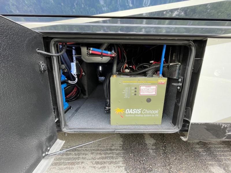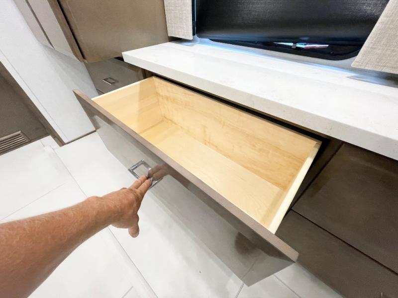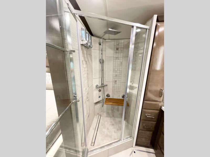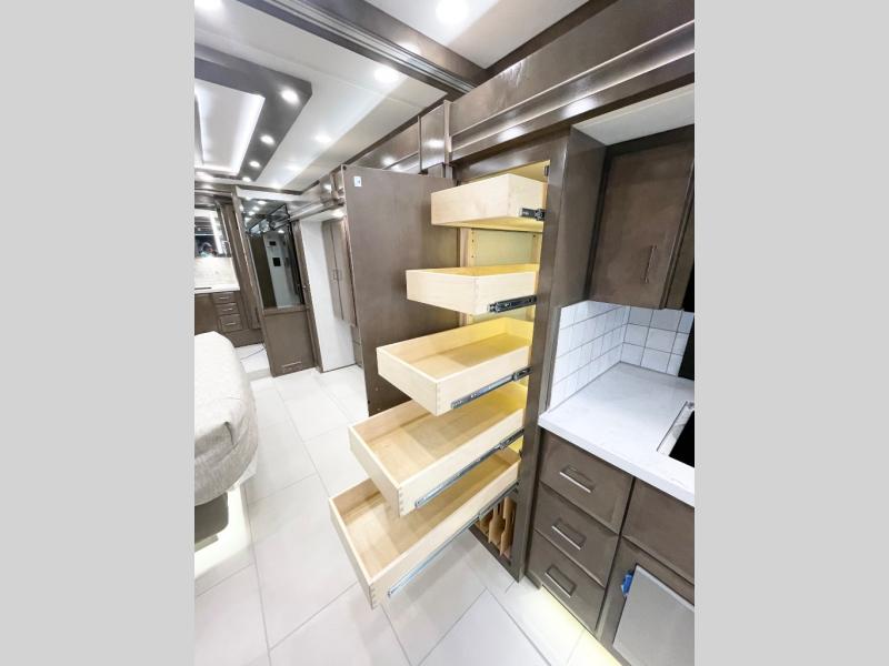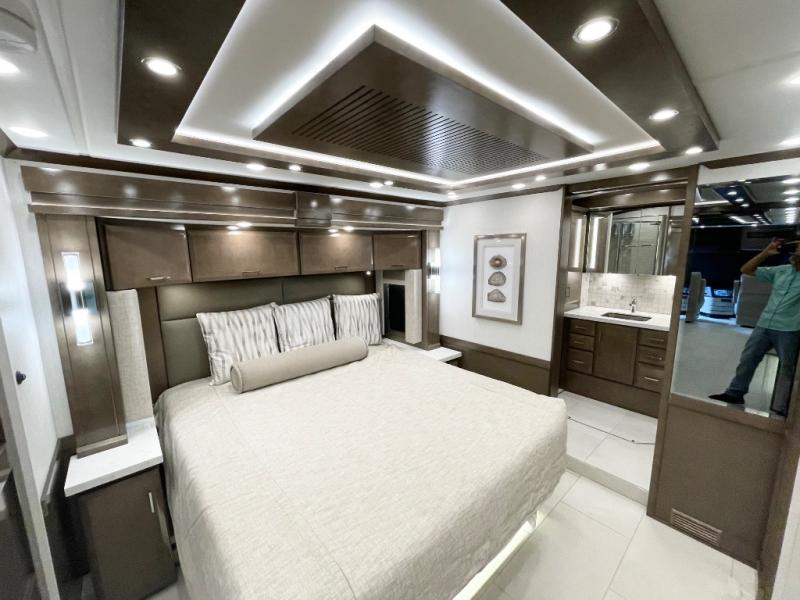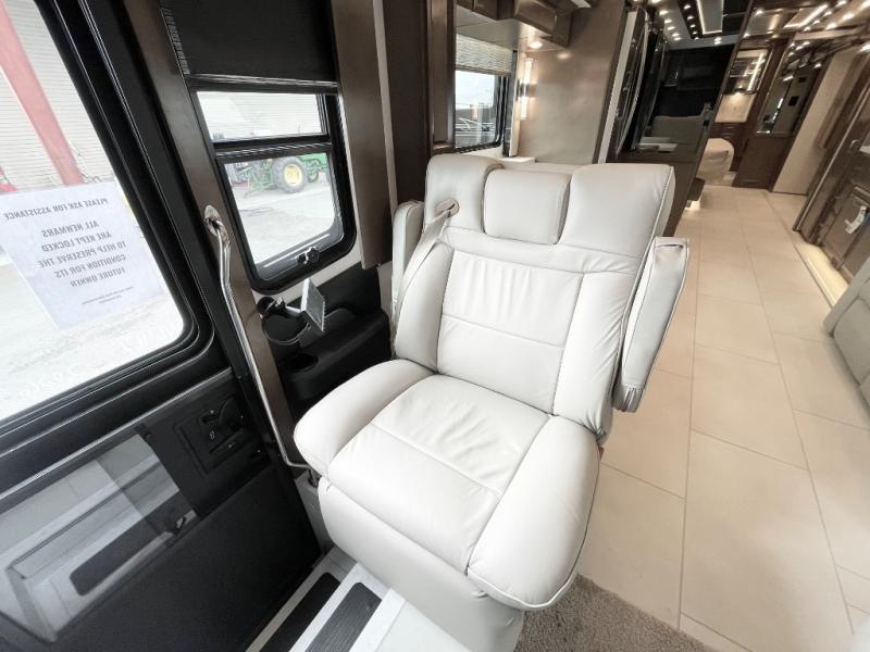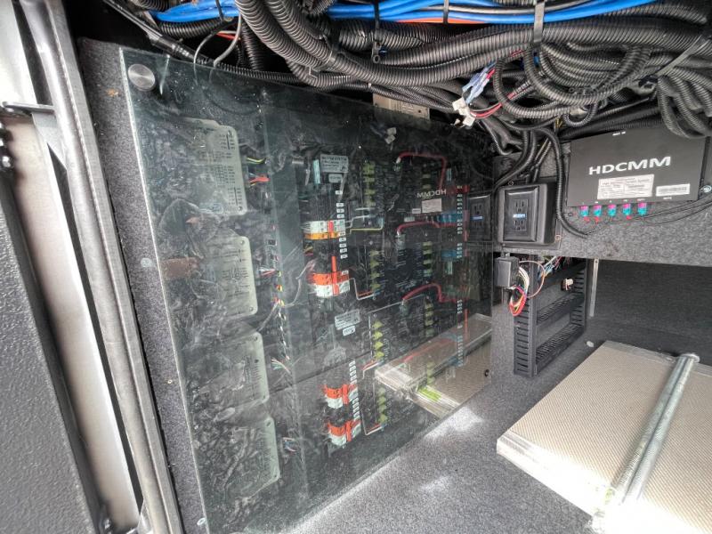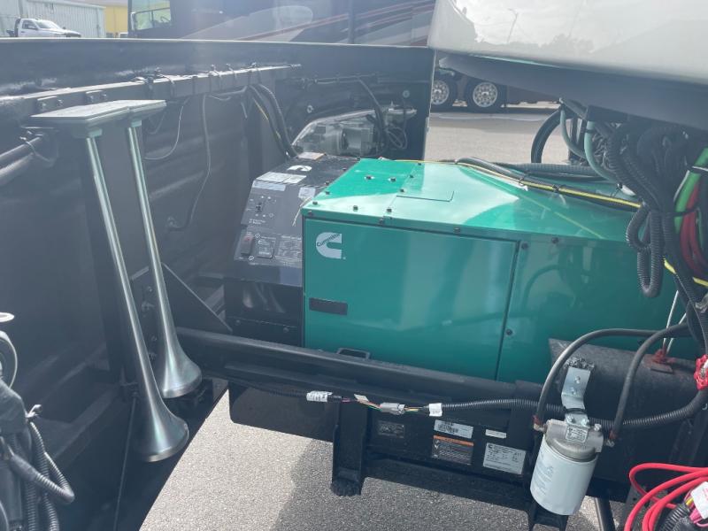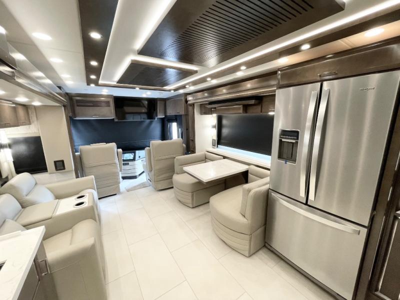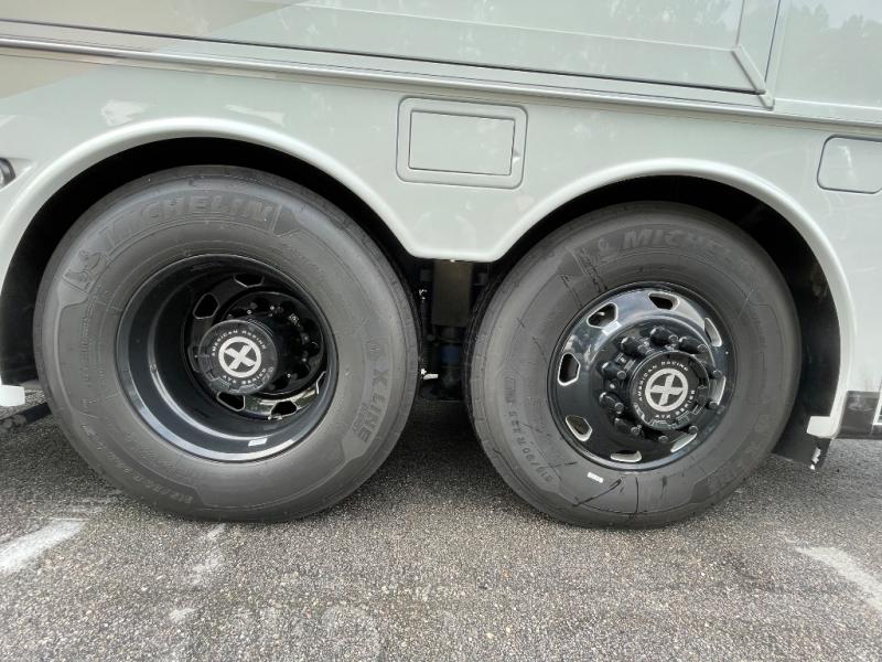 This motorhome has everything you need for a comfortable road trip! The master suite has a king bed slide for a good night's rest across from a dresser with a Samsung LED TV and shirt wardrobes on either side. Attached to the bedroom is your very own full rear bathroom which has a 42" x 35" angled shower next to a wardrobe with drawers and a Splendide washer and dryer next to the vanity sink. The chef will have everything they need to prepare delicious home cooked meals including a stainless steel 30" convection microwave with air fryer feature and a Whirlpool 19.7 cu. ft. refrigerator to keep the perishables fresh, plus the half bathroom is by the kitchen for quick bathroom breaks while cooking. Enjoy your meals at the Euro booth dinette (non-sleeper) and relax on the 74" hide-a-bed sofa while watching your favorite movies on the Samsung LED TV on power lift!