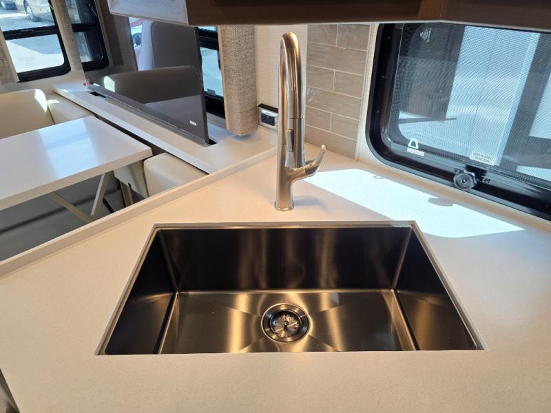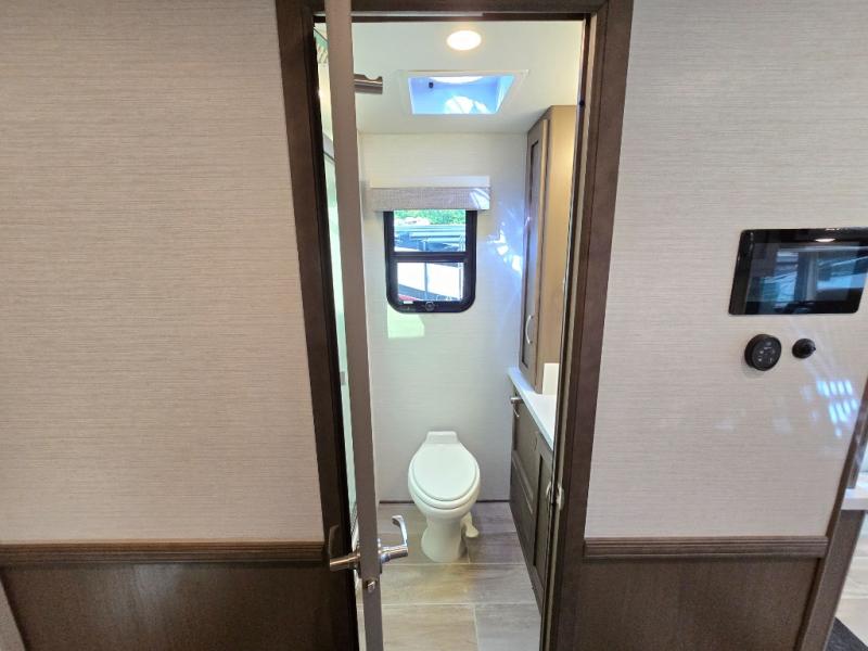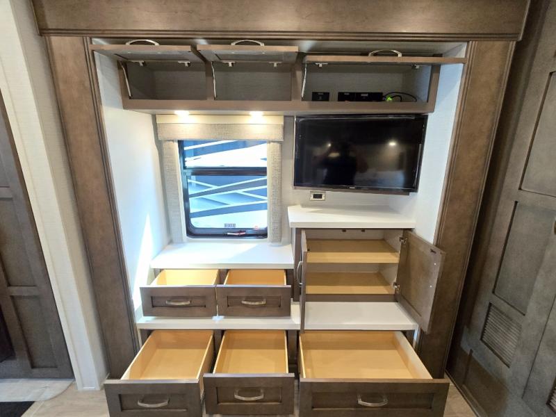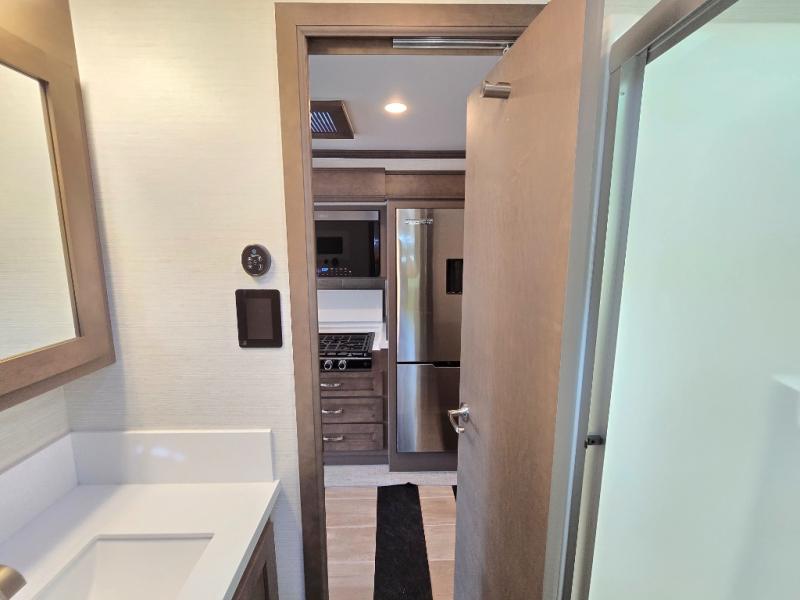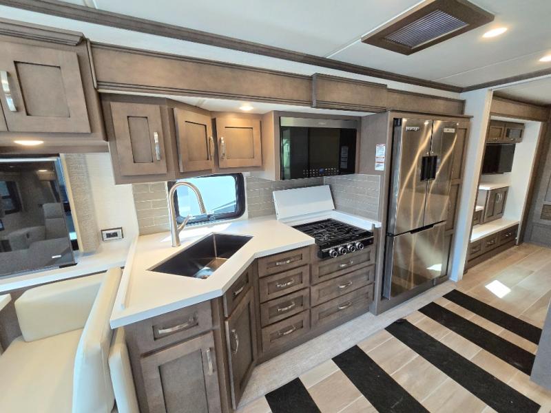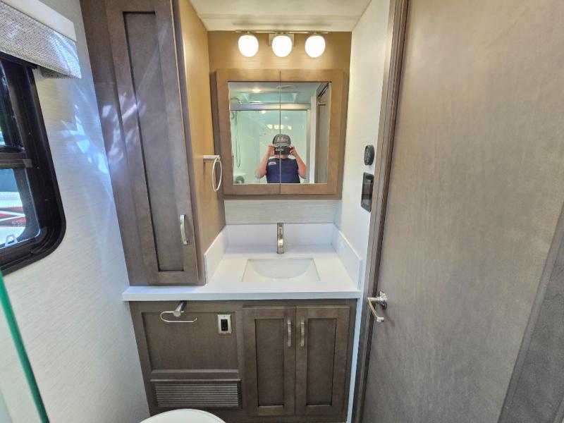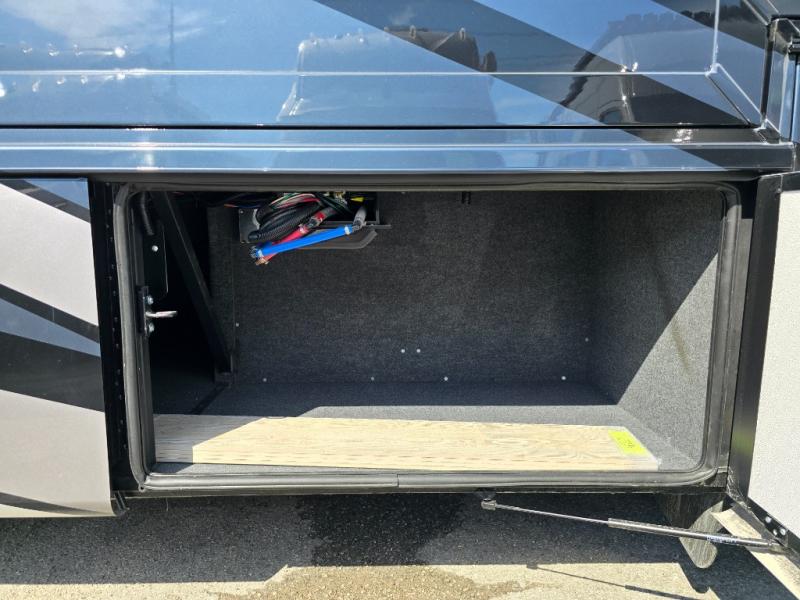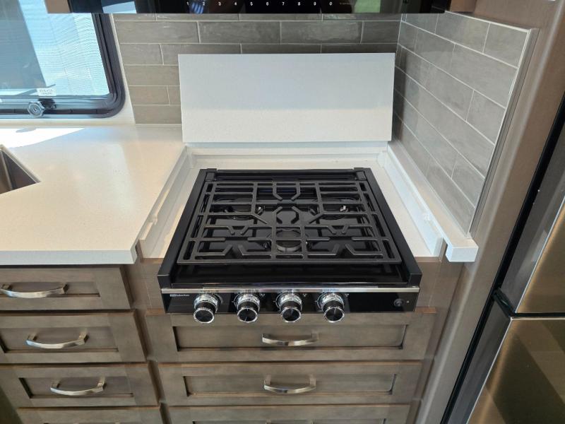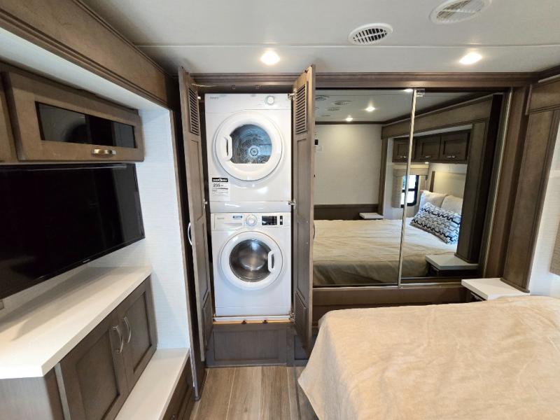 Pack your bags for an extended vacation in this four slide out coach! Once you've parked for the day, you can make lunch in the full kitchen that includes a 30" stainless steel convection microwave with a three burner cooktop and an air fryer feature. There is a 10 cu. ft. Norcold refrigerator and pantry to store your food, plus a booth dinette where you can dine together. A Jackknife sofa provides more seating space, or you may just find yourselves outdoors under the Carefree Travel'r awning. The mid-coach full bath will be easily accessible for everyone to use, and the rear private bedroom provides you with your own space at night. Here, you'll enjoy a queen bed slide out with overhead storage, a dresser with a Samsung LED TV, plus a wardrobe with sliding mirror doors. There is even a second wardrobe with an optional Splendide two-piece stacked washer and dryer if you plan to go full-time!