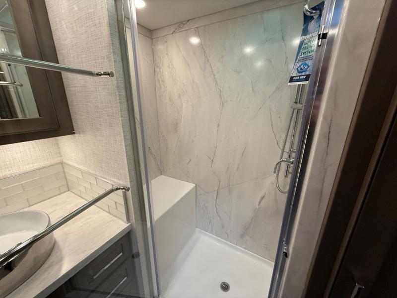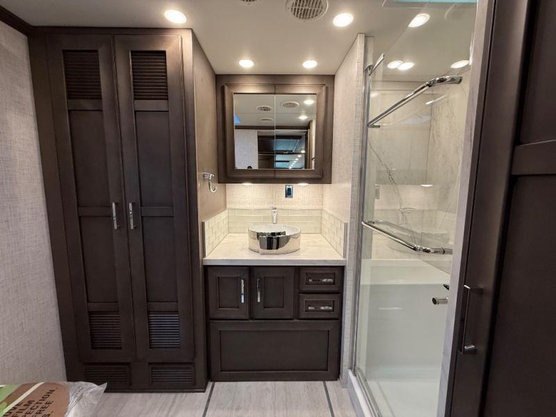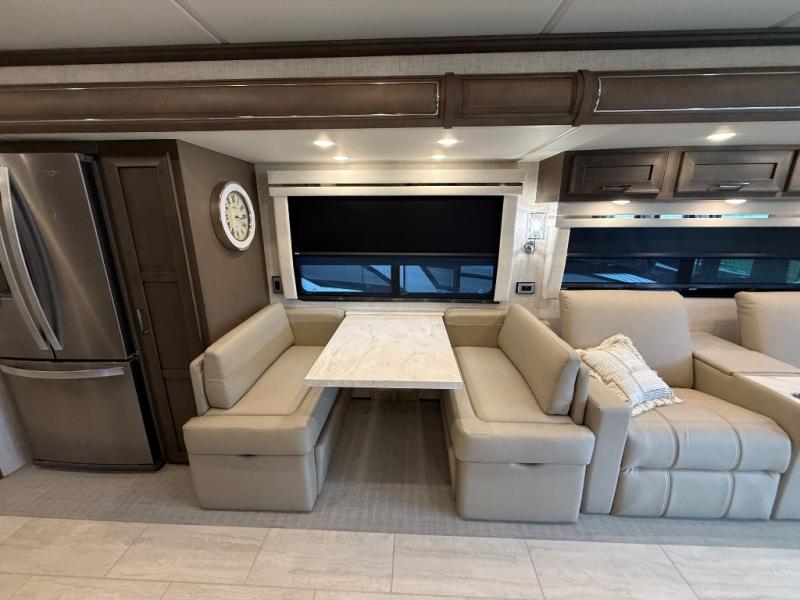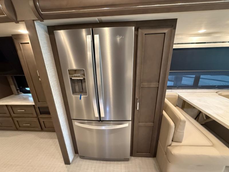 Step right into luxury with this Ventana coach that can sleep six people each night. Your guests can make their beds on the side hide-a-bed sofa, the jack knife sofa, and the booth dinette, while you take the king bed slide out in the master bedroom. You will have the full rear bath to yourselves that includes a wardrobe with shelves, a 50" x 30" shower, plus washer and dryer prep to make life on the road easier than ever. In the morning you can prepare breakfast on the all electric induction cooktop, or use the stainless steel convection microwave. There is also a large pantry here and a 19.7 cu. ft. Whirlpool refrigerator for food storage.