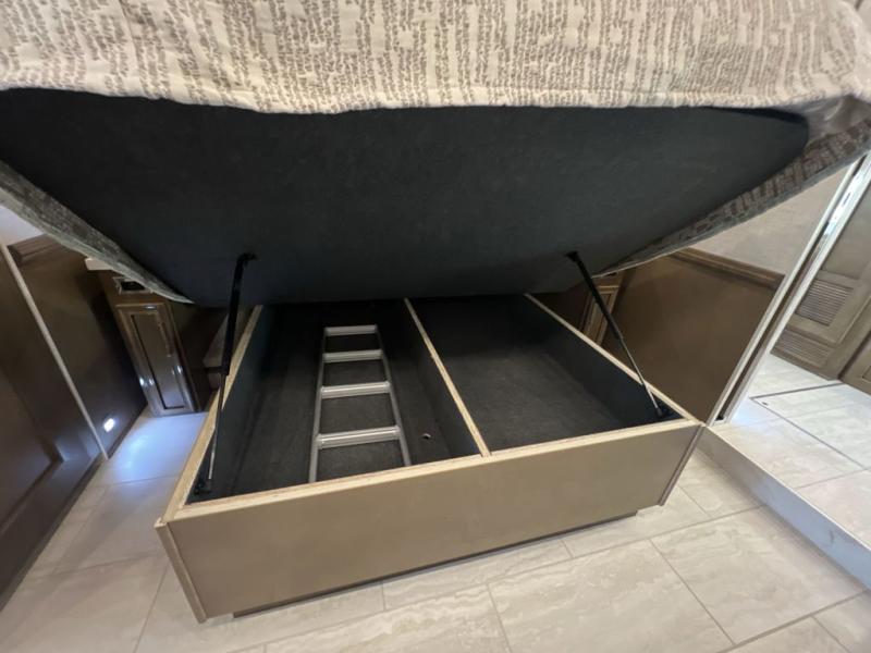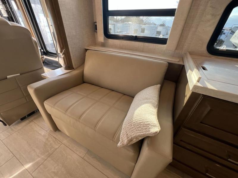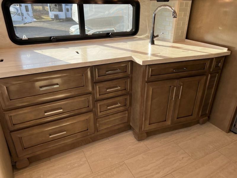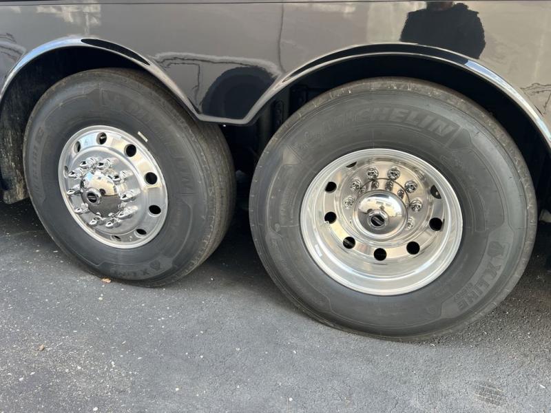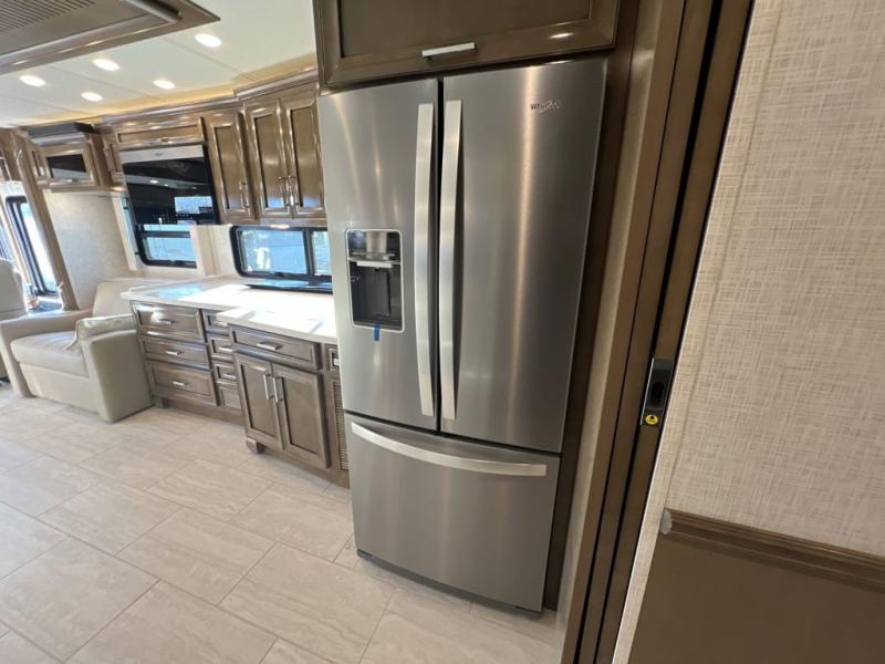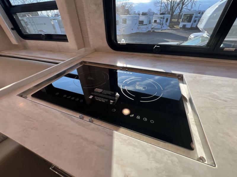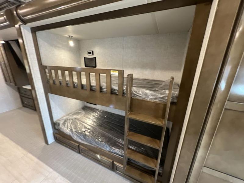 It will be easier than ever to travel with a larger group since this coach features triple slides for more space, bunk beds, and two full baths for added comfort! The master bedroom includes a king bed slide, dual shirt wardrobes to keep your clothes organized, and an LED 4K TV to watch movies in bed. Everyone can meet in the combined kitchen and living room while the chef makes breakfast on the all electric induction cooktop. For seating space, you'll find a hide-a-bed sofa, a 48" loveseat, and a dinette with four chairs. And the 19.7 cu. ft. Whirlpool refrigerator and pantry can store your food for the whole week!