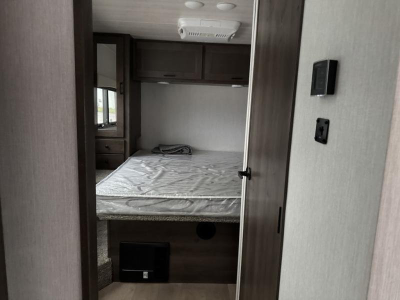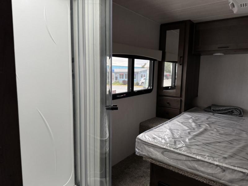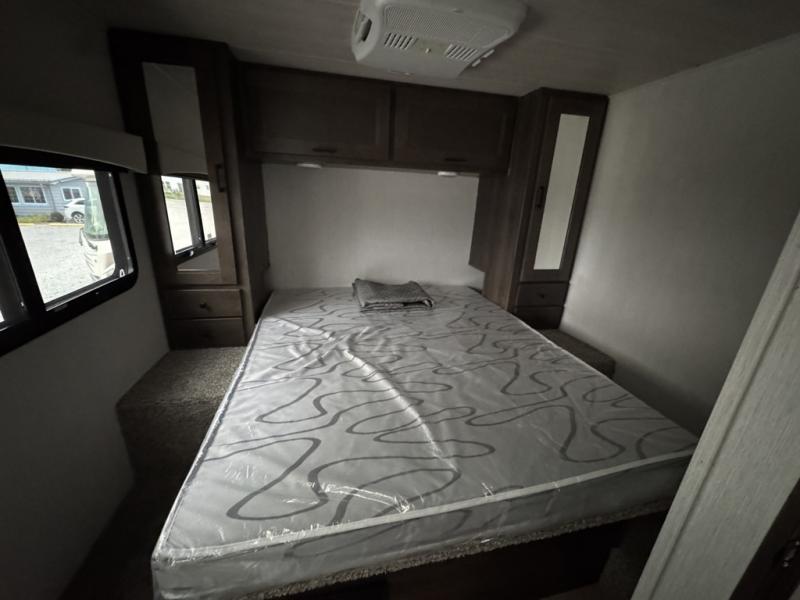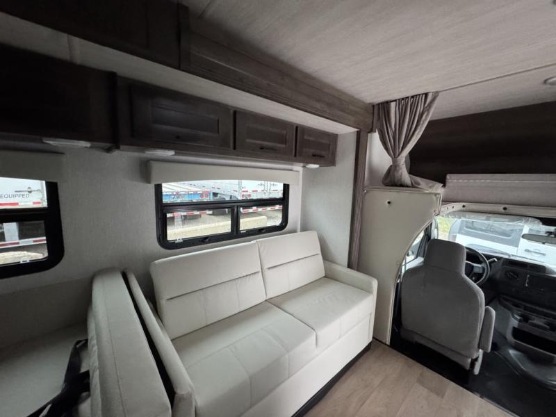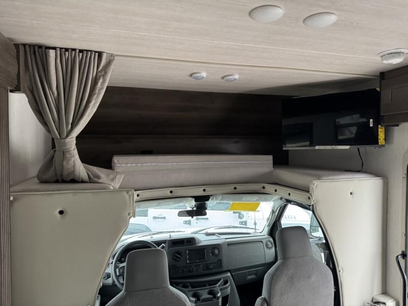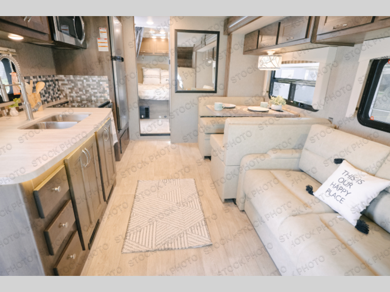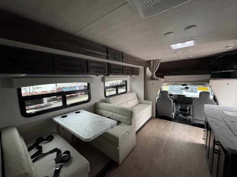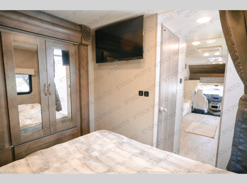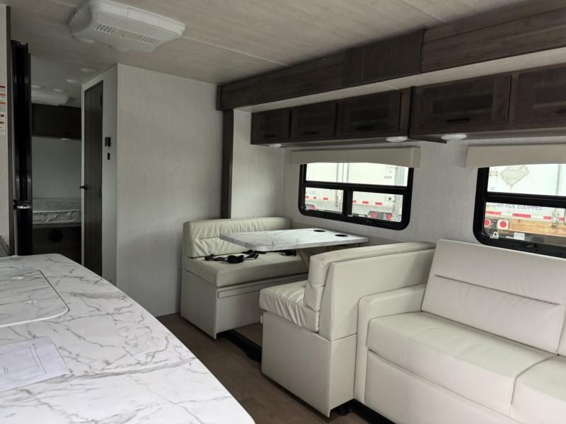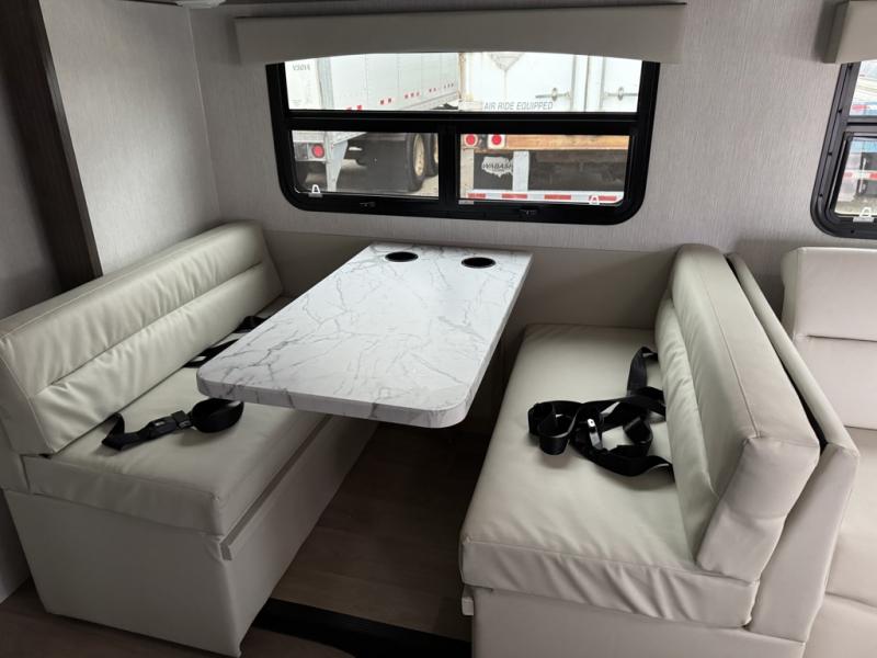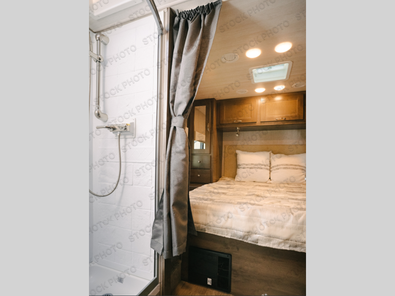 This Phantom Class C gas motorhome has a unique bathroom that is located within the rear private bedroom creating a desirable oasis away from the rest of the coach! This master suite has a wardrobe slide, a queen-size bed, a private toilet room that closes off from the rest of the room, and a standalone shower in the corner of the bedroom. The main living area has a large slide that allows the booth dinette and sofa to move out of the walkway, and the TV will provide entertainment for everyone sitting in the living room.