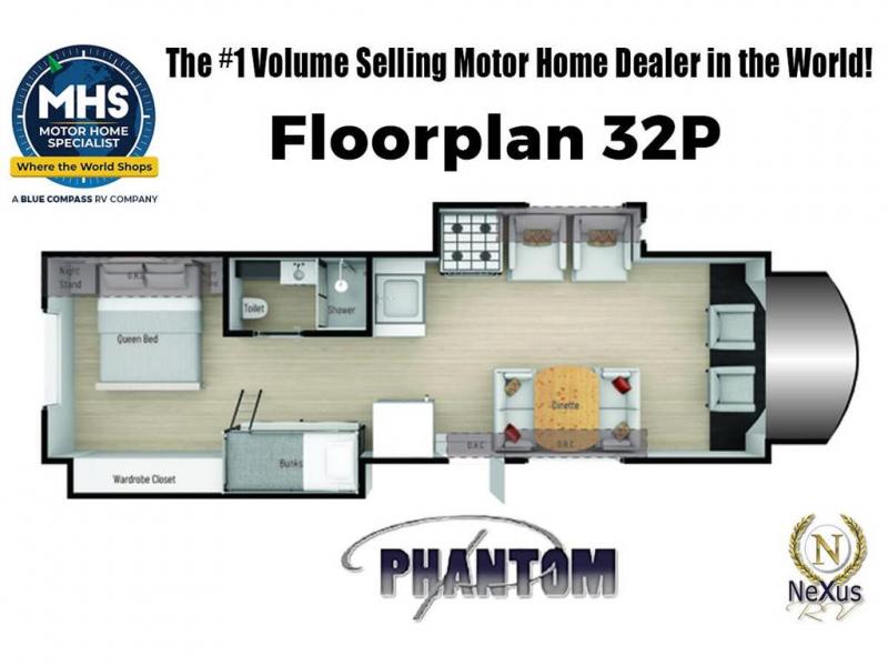 M.S.R.P. $164,947 - All New 2026 Nexus Phantom 32P Bunk Model RV for Sale at Motor Home Specialist; the #1 Volume Selling Motor Home Dealership in the World. This unit is approximately 32 feet 11 inches in length. It rides on the amazing new Ford® E-Series chassis with a 7.3L V8 engine! Optional features include an oven, convection microwave, second A/C, TV in bedroom, Outside entertainment center, gateway 4G LTE WiFi Router, Theater Seating, soft touch driver and passenger seats, swivel driver and passenger seat, roof ladder, aluminum running boards, side view cameras, heated and remove mirrors and full automatic leveling jacks. This amazing Class C RV also features the Phantom Value Package which includes a fiberglass roof, large residential size microwave, residential refrigerator w/inverter, and rear fiberglass radius eyebrow. Additional features found in the Nexus RV include galvanized steel storage boxes, and heated and enclosed holding tanks. Strength, Safety and Customer Satisfaction are the 3 cornerstones found in every Nexus RV. The construction of the Nexus RV far exceeds the industry norm. First, and arguable foremost, the Nexus RV boast an all STEEL cage construction instead of the normal aluminum framed construction found in the competition. Steel cage construction is 72% stronger than aluminum and is only common place on RVs such as the Foretravel Realm or a Prevost bus conversion; both of which would have an M.S.R.P. value well over $1 million dollars! That same commitment to strength and safety is found throughout the Nexus line-up. You will also find construction highlights such as 2 layers of Azdel substrate in the sidewalls & roof! The Azdel product provides 3X the insulation value of wood and is 50% lighter which will help optimize your engine’s performance and fuel economy, and because it is not a wood material harvested from the rain forest it is both greener and provides a less that 1% chance of retaining any moisture that could ever lead to wall separation or mold. It is also formaldehyde free, impact resistant and a sound absorbing material creating a much quieter RV. To further protect and insulate the RV from the elements Nexus utilizes high grade UV protected automotive window seals. The roof is a pre-stamped metal roof truss system that is further highlighted by the exterior layer of seamless fiberglass as opposed to the normal TPO or "rubber roofs" found in most RVs built today. The steel roof is also designed to incorporate Nexus RV's Easy-Flow Air Distribution system. This HVAC ducting is a tried-and-true system that provides more evenly distributed A/C throughout the coach as well as helps promote cleaner air and reduce allergens. Shop hundreds of class C gas RVs at 1 location! Choose from Fleetwood Altitude - Gulf Stream BT Cruiser - Thor Chateau - Four Winds - Geneva and Quantum - Entegra Coach Odyssey Odyssey SE and Esteem - East to West Entrada - Forest River Forester - Forester LE - Nexus Phantom - Viper and much more. We also sell quality pre-owned models such as Jayco Greyhawk – Redhawk - Redhawk SE - Thor Magnitude - Winnebago Spirit - and Minnie Winnie - Coachmen Freelander and Leprechaun - Forest River Sunseeker Classic - Sunseeker LE – Solera - Holiday Rambler Incline and much more. Visit MHSRV.com for our complete line-up and the sale prices that have made us the #1 volume selling motor home dealership in the world 12 years in a row! For more complete details on this unit and our entire inventory including brochures, window sticker, videos, photos, reviews & testimonials as well as additional information about Motor Home Specialist and our manufacturers please visit us at MHSRV.com or call 800-335-6054. All sale prices include a multi-point inspection, interior & exterior wash, detail service and a fully automated high-pressure rain booth test and coach wash that is a standout service unlike that of any other in the industry. You will also receive a thorough coach orientation with an MHSRV technician, a night stay in our delivery park featuring landscaped and covered pads with full hook-ups and much more! Read Thousands upon Thousands of 5-Star Reviews at MHSRV.com and see what they had to say about their experience at Motor Home Specialist. MHSRV.com or 800-335-6054 - Why Pay More? Why Settle for Less?