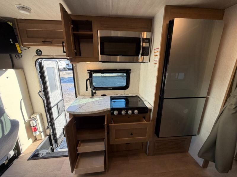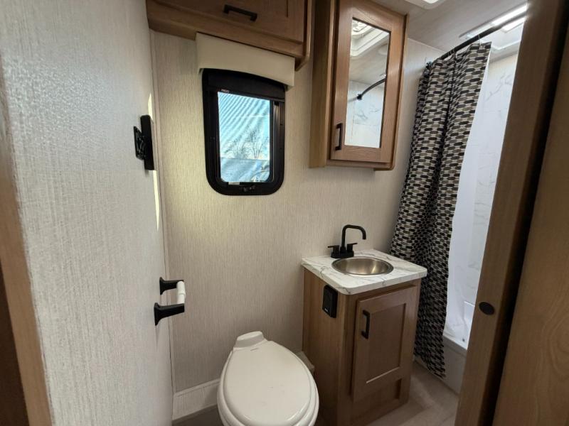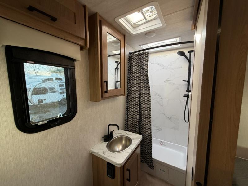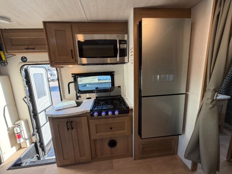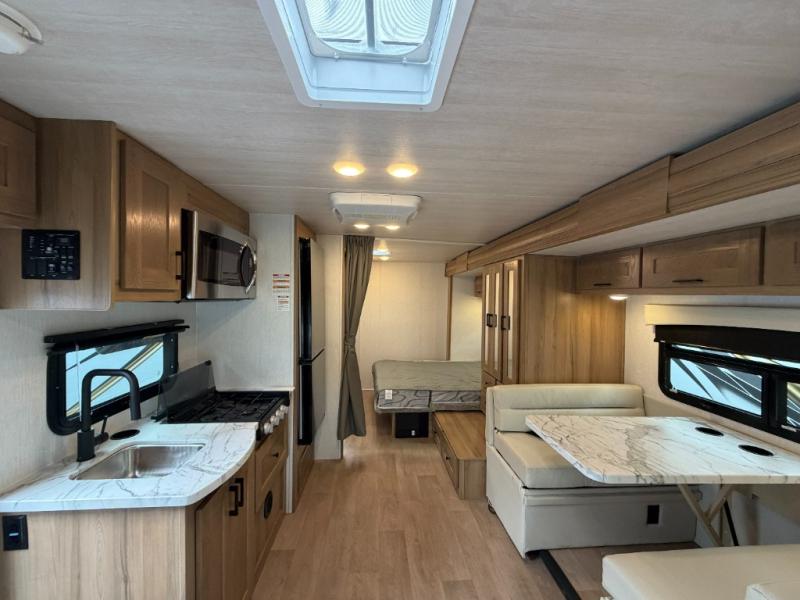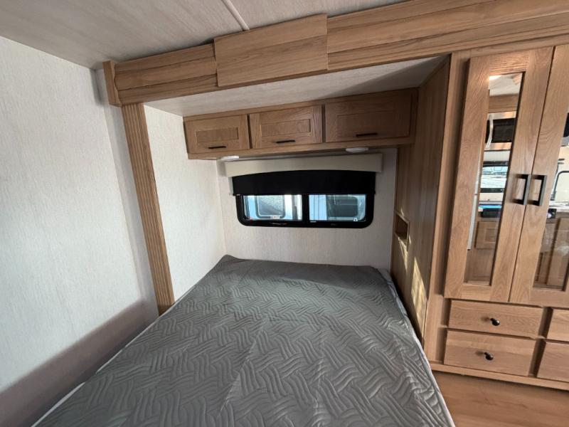 You'll enjoy every moment spent in this spacious coach! The full-wall slide will open up your living space so you can easily cook meals on the three-burner stove or in the residential microwave. A booth dinette, 60" x 74" RV queen bed, and wardrobe are found within the slide, giving you dining, sleeping, and storage space! Your guests or little ones will love the cab-over bunk, and everyone can stay clean throughout the trip thanks to the rear corner full bath!