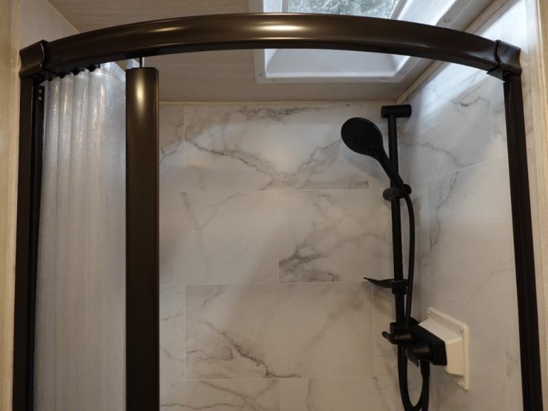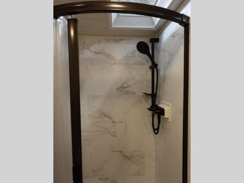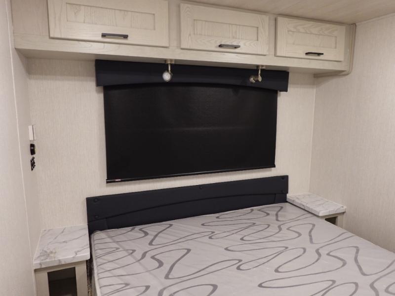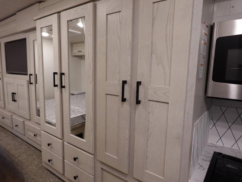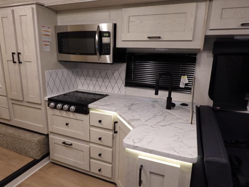 You won't want to travel any other way once you step inside this motorhome! The rear private bedroom has a bed with a deluxe innerspring mattress across from a TV, a dresser, and a closet to keep your clothes looking nice. With two linen closets in the full bathroom, you will be able to keep your towels and toiletries out of the way. You won't have to eat fast food either thanks to the three burner stovetop, 10 cu. ft. 12V residential refrigerator with 1,000 watt inverter, and over the range microwave for popcorn on movie night. The bunk over cab and booth dinette offer extra sleeping spaces for more to join in on the adventure too. There is also an outside shower to rinse your feet off before tracking mud throughout the unit!