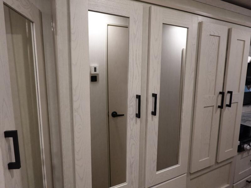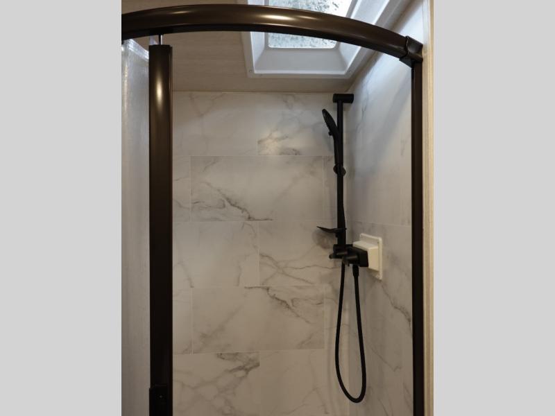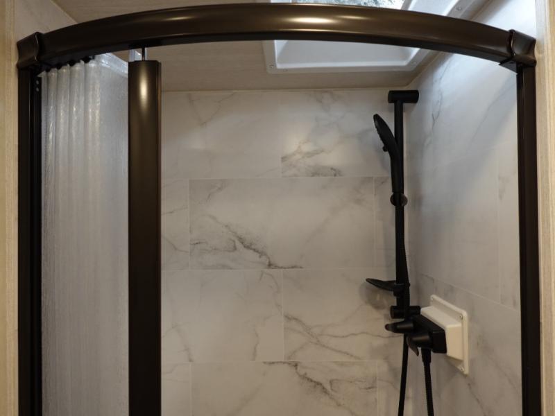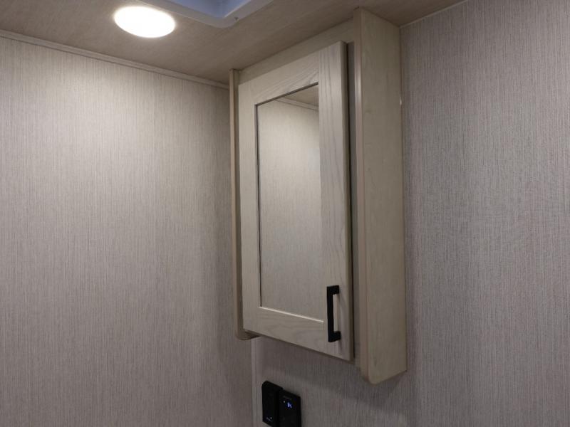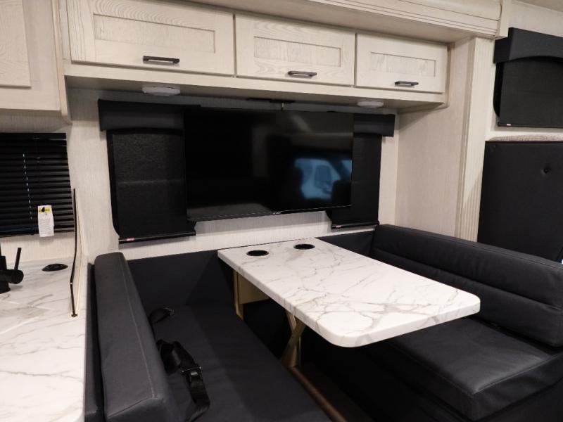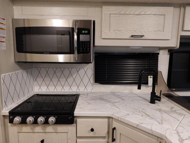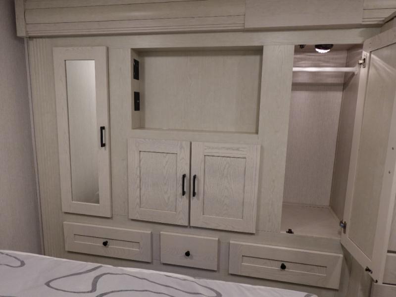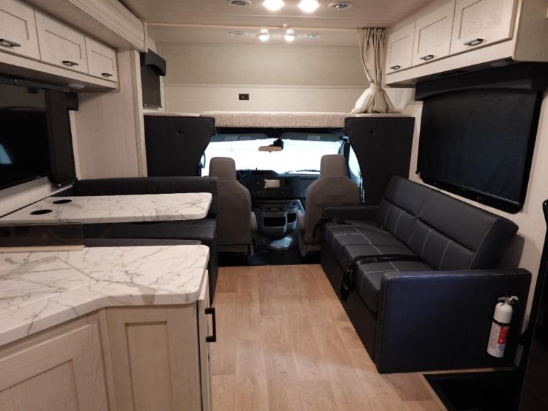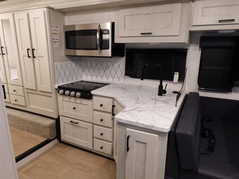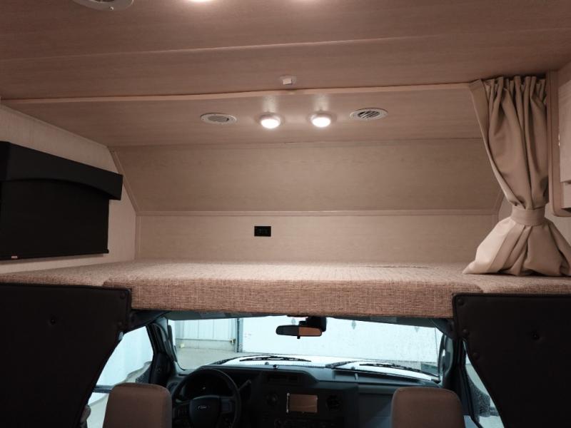 You won't want to travel any other way once you step inside this motorhome! The rear private bedroom has a bed with a deluxe innerspring mattress across from a TV, a dresser, and a closet to keep your clothes looking nice. With two linen closets in the full bathroom, you will be able to keep your towels and toiletries out of the way. You won't have to eat fast food either thanks to the three burner stovetop, 10 cu. ft. 12V residential refrigerator with 1,000 watt inverter, and over the range microwave for popcorn on movie night. The bunk over cab and booth dinette offer extra sleeping spaces for more to join in on the adventure too. There is also an outside shower to rinse your feet off before tracking mud throughout the unit!
