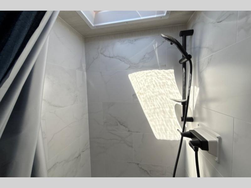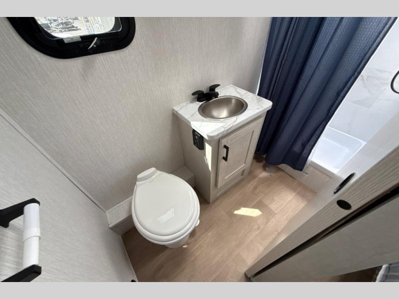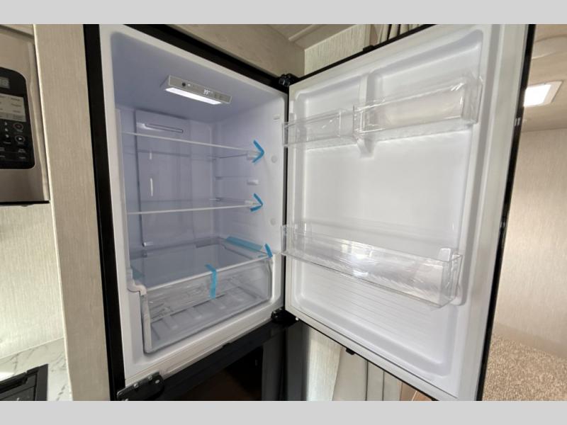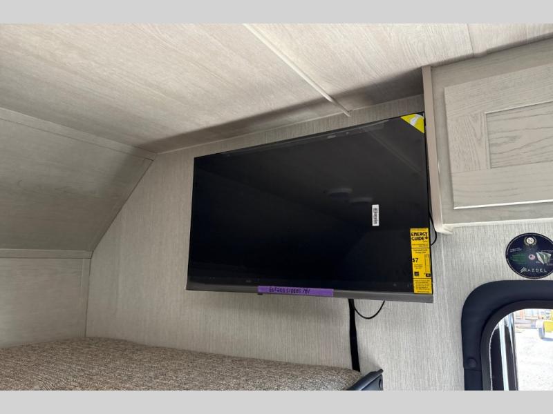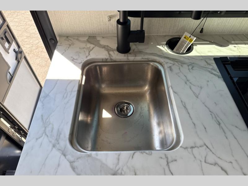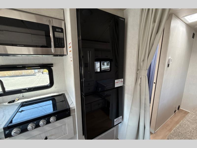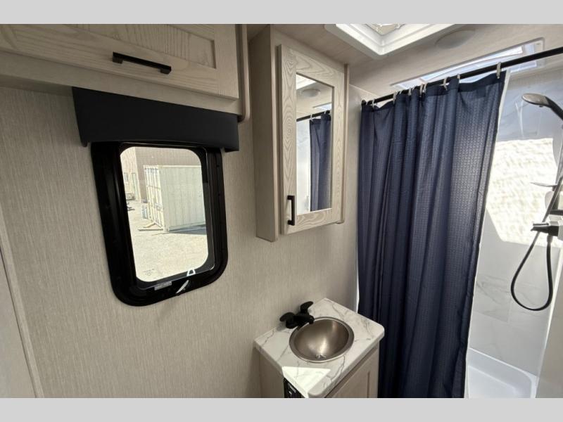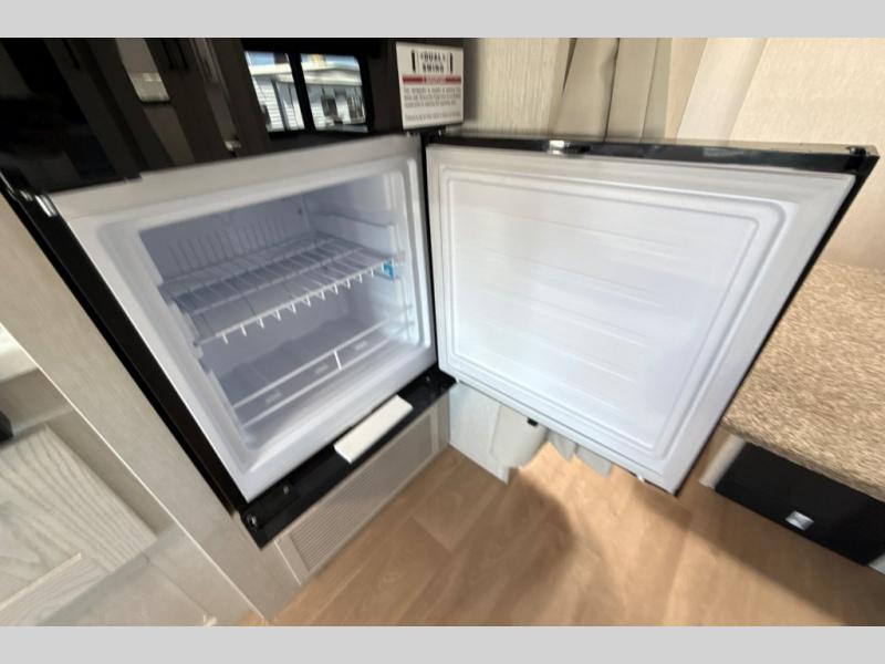 Pack your bags and head across the country in this cozy coach! Get a good night's rest each night on the deluxe innerspring 60" x 74" queen bed, and freshen up in the morning with the shower with a skylight in the rear corner bathroom. And there is a wardrobe beside the bed to keep your clothes out of the way too. Grab some eggs from the 10 cu. ft. 12V refrigerator then head to the three burner cooktop to fry them up. You can then enjoy them at the booth dinette within the full-wall slide, which can also transform into an extra sleeping space. The bunk over cab is also another sleeping space or it can be used for storage!