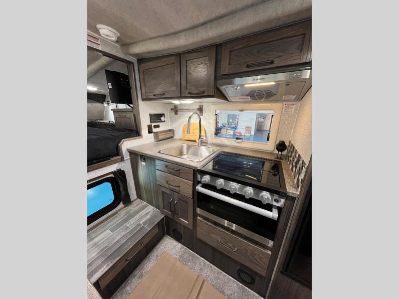 This truck camper is perfect for your long bed truck! Start each morning feeling recharged after sleeping on the front queen bed while your electronics recharge at the 12V USB charging stations. Fill your bellies with fried bacon and eggs cooked on the three burner stove with oven and drink a cold glass of orange juice stored in the 6.3 cu. ft. three way refrigerator. Plus, you can eat your meals at the face-to-face dinette and transform into an extra sleeping space. You can even freshen up each morning in the wet bath. There is plenty of storage throughout with closets and overhead cabinets too!