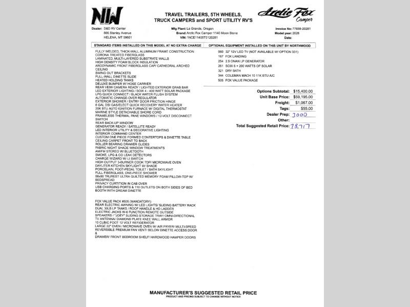 New 2026 Northwood Arctic Fox Camper 1140 Dry Bath Truck Camper