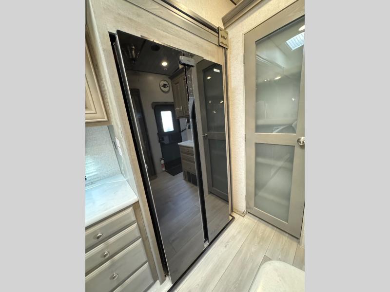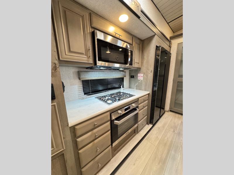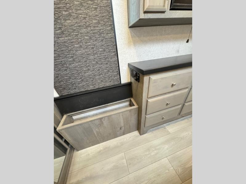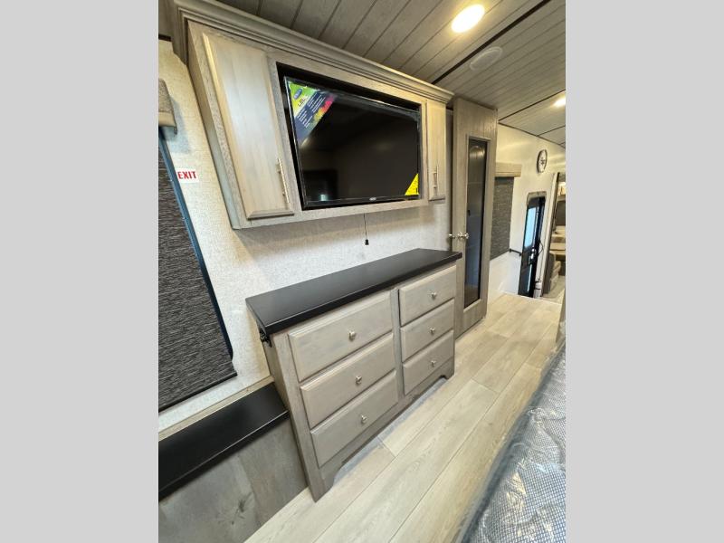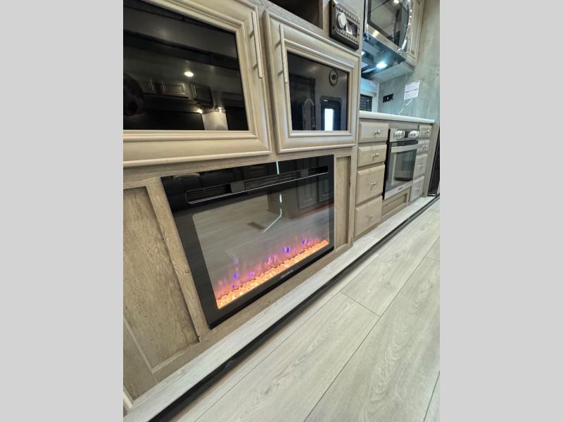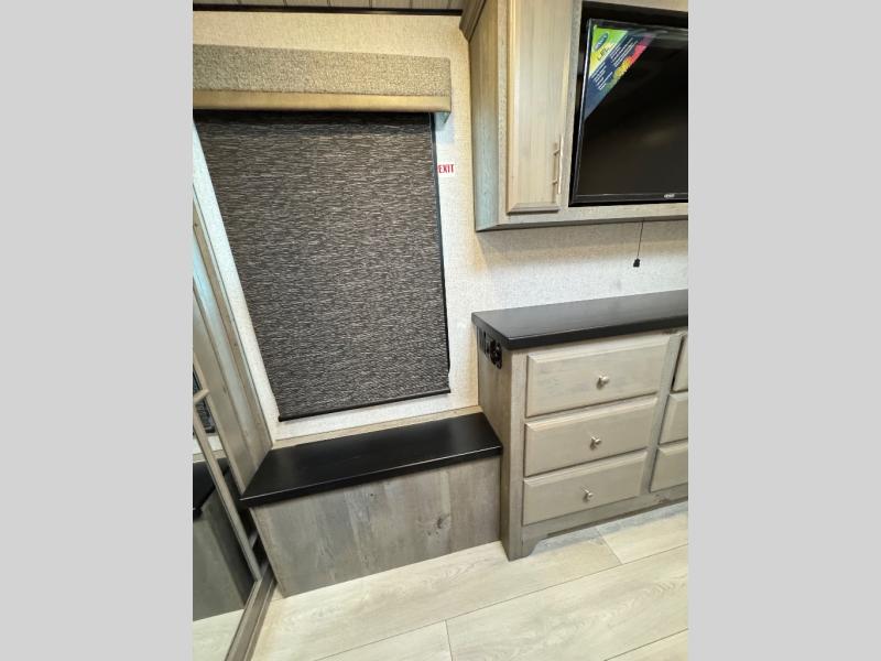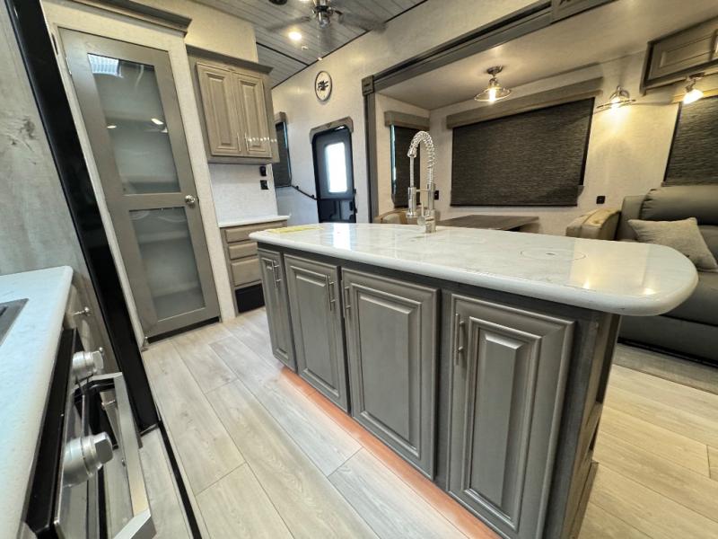 Wherever you decide to camp, you can call it home with this fifth wheel in tow! The dual opposing slides in the main living area will create an open floorplan, and the large kitchen island with a double sink is sure to be a big hit with the chef of your group. They will also have a three burner cooktop and 1.5 cu. ft. over-the-range convection microwave to cook meals plus a refrigerator to store leftovers. The theater seating across from the entertainment center with a fireplace will make your space feel more like home, and there is a free-standing table with four chairs where you can dine together. Your guests can sleep on the rear tri-fold sofa, while you take the king bed slide out in the front bedroom. You'll also enjoy a full-width quad slide wardrobe with an optional washer/dryer, a dresser, and bench seating with a hamper to keep your room tidy. And don't overlook the spacious full bath with a fiberglass shower and dual bath sinks; how convenient!