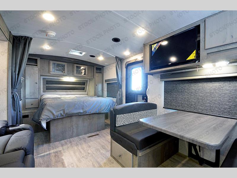 Escape to the campground in this travel trailer for three. The front queen bed includes dual wardrobes to keep your clothes tidy and overhead cabinets for your belongings. You can relax on the theater seating within the large slide out, and the booth dinette can convert to a 40" x 76" sleeping area for guests. The rear of this unit is shared with the full bath and the kitchen counter with a stainless-steel sink. You can prepare meals on the three-burner range and keep food fresh in the 10-cu. ft. 12V refrigerator.
