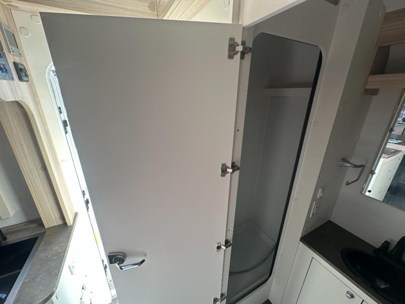 You'll find comfort wherever you camp in this travel trailer! Once you arrive at your campsite, you can unload the pass-through storage, put out the 12' awning, and relax in your camp chairs. There is a two-burner glass stove top and microwave oven inside that will allow you to make lunch for your crew, and there is a 4.6 cu. ft. 12V compressor refrigerator to keep your food fresh. The 4-peson U-shaped dinette will provide a place to dine together and convert to sleeping space for one to two more. Up front, a walk-around queen bed will provide a great night's rest.