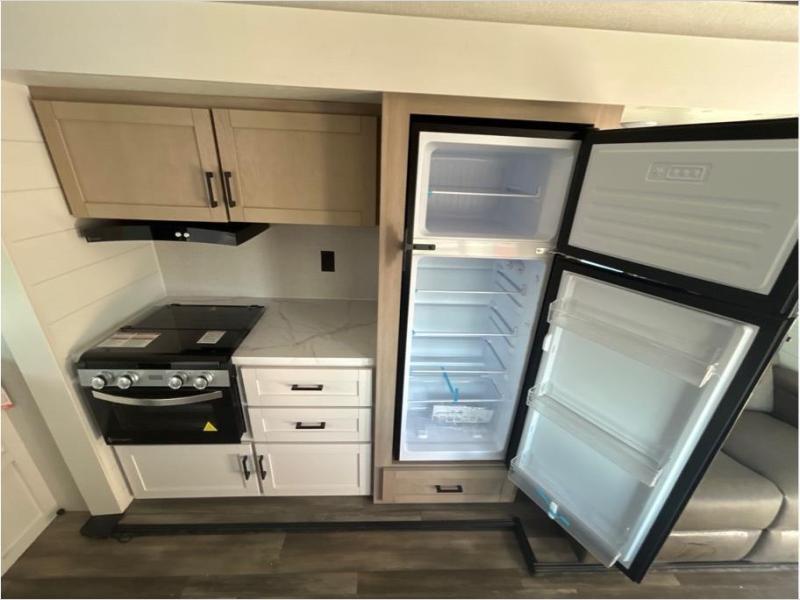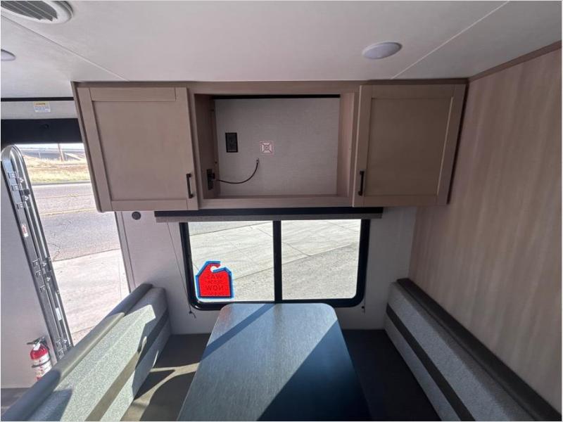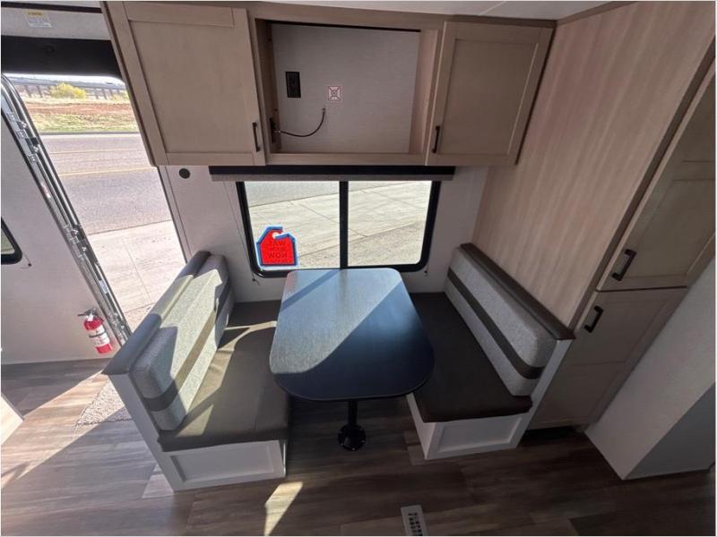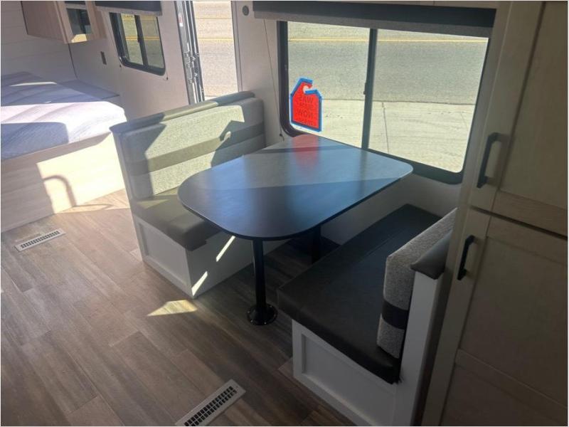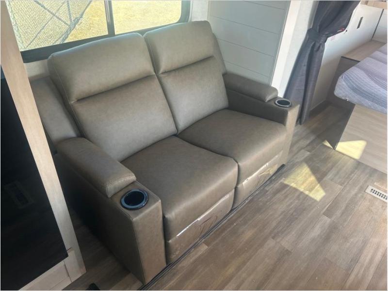This travel trailer is perfect for weekend trips to the lake! Once you arrive at the campground, you can unload the exterior storage, put out the 18' power awning with LED lights, then relax in your camp chairs. Head inside to make lunch on the three-burner cooktop in the rear corner kitchen, and you'll find the full bath in the other rear corner for quick access. A booth dinette provides a place to dine together, and a theater seat within the large slide out is sure to bring comfort. This unit includes a queen bed in the front semi-private bedroom with a privacy curtain and dual wardrobes for your things!