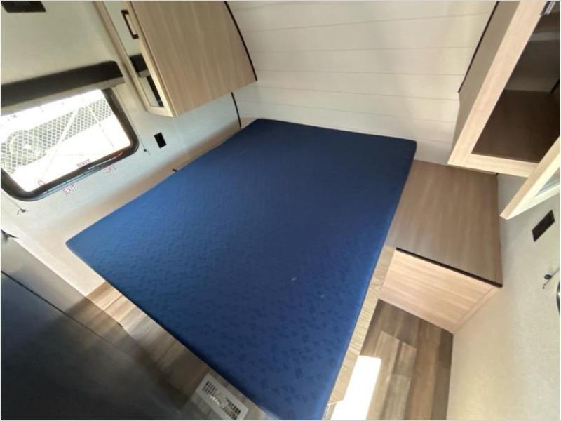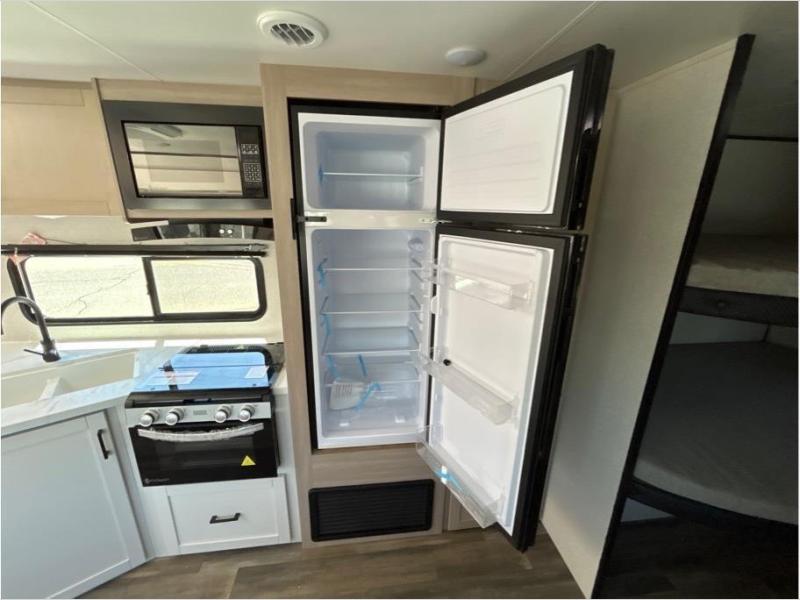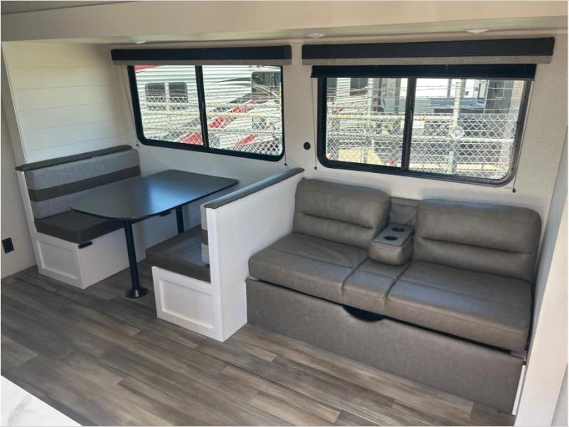This travel trailer with double-size bunks is spacious and cozy! Once you've unloaded the exterior storage, your crew can put out the 16' power awning with LED lights, then start lunch on the outside kitchen. If the weather isn't cooperating, there is a three-burner cooktop and microwave oven inside, plus comfortable seating on the jack-knife sofa and booth dinette. You're sure to appreciate the front private bedroom with an RV queen bed, dual wardrobes, plus an overhead shelf for books, and the rear corner full bath will let everyone freshen up each day!