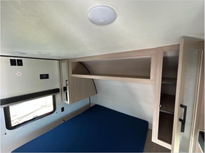 This travel trailer with double-size bunks is spacious and cozy! Once you've unloaded the exterior storage, your crew can put out the 16' power awning with LED lights, then start lunch on the outside kitchen. If the weather isn't cooperating, there is a three-burner cooktop and microwave oven inside, plus comfortable seating on the jack-knife sofa and booth dinette. You're sure to appreciate the front private bedroom with an RV queen bed, dual wardrobes, plus an overhead shelf for books, and the rear corner full bath will let everyone freshen up each day!