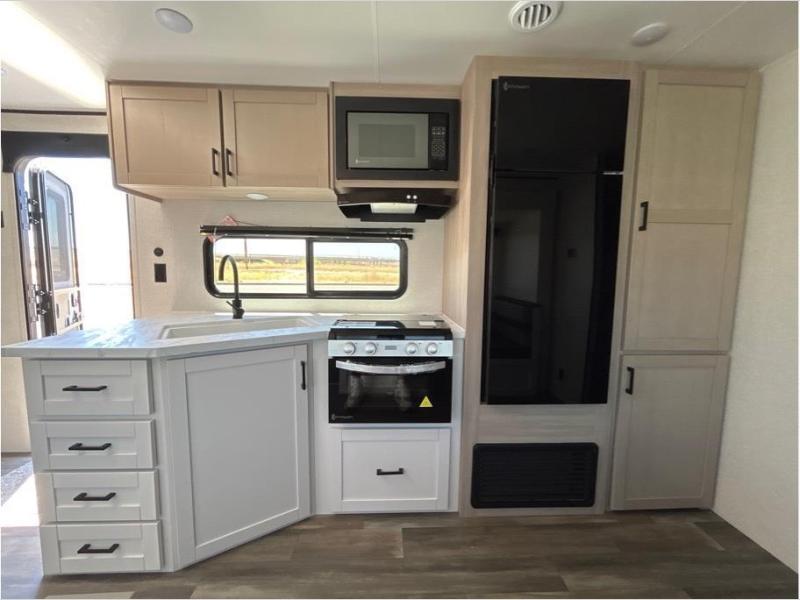 This travel trailer with double-size bunks is spacious and cozy! Once you've unloaded the exterior storage, your crew can put out the 16' power awning with LED lights, then start lunch on the outside kitchen. If the weather isn't cooperating, there is a three-burner cooktop and microwave oven inside, plus comfortable seating on the jack-knife sofa and booth dinette. You're sure to appreciate the front private bedroom with an RV queen bed, dual wardrobes, plus an overhead shelf for books, and the rear corner full bath will let everyone freshen up each day!