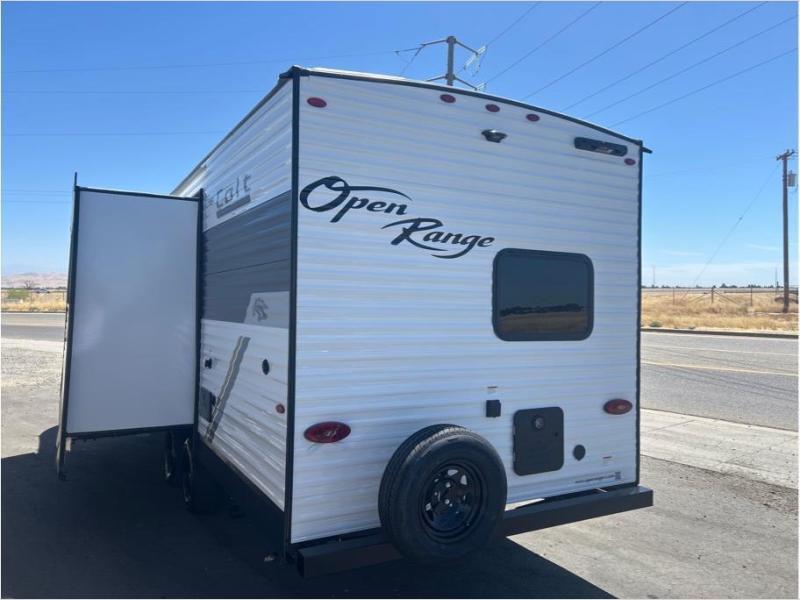 With any Colt travel trailer by Open Range RV, you can be sure you're getting a budget-friendly unit designed to fit your lifestyle! Each one is built to last with a PVC roofing membrane and built-in A-frame, plus there are nitrogen-filled radial tires and self-adjusting electric brakes for easy towing. You will appreciate the utilities that include 30-amp service, an A/C unit, and an on-demand tankless water heater. A few interior comforts include vinyl flooring throughout, solid hardwood cabinet doors, and residential grade kitchen countertops to make your space feel more like home. There are additional features available, depending on the edition you choose, along with available options to further customize your Colt travel trailer!