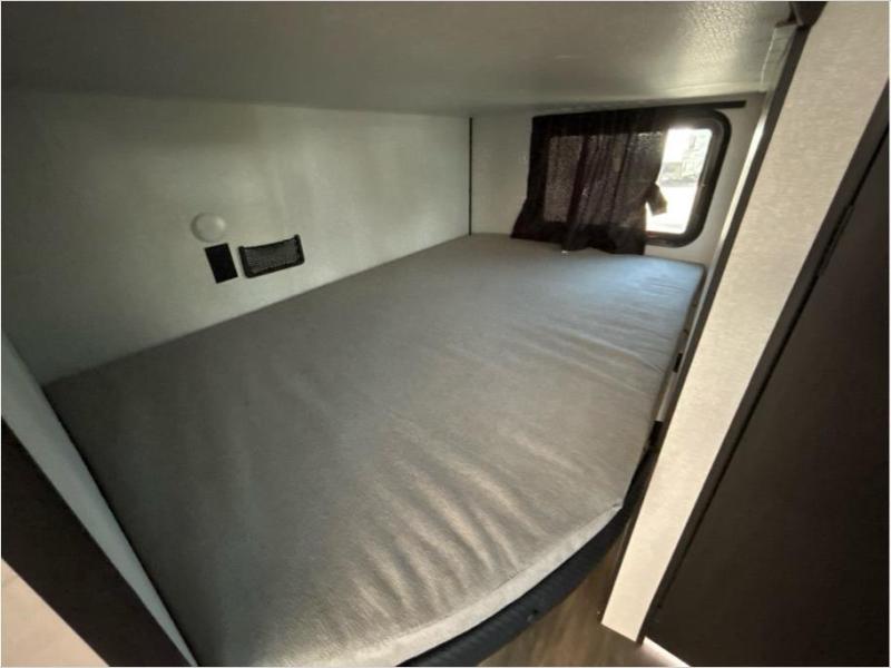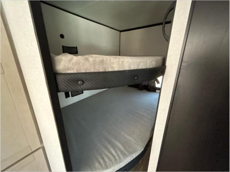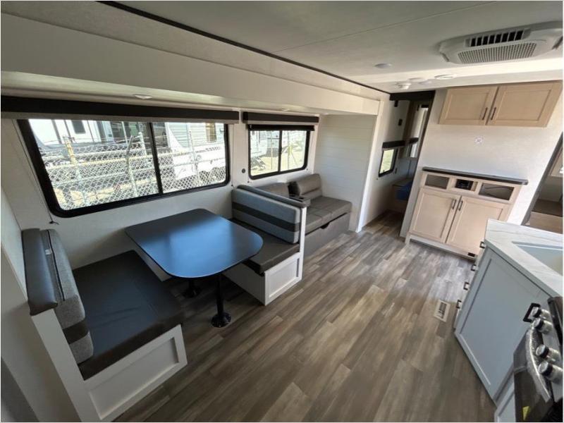 This travel trailer with double-size bunks is spacious and cozy! Once you've unloaded the exterior storage, your crew can put out the 16' power awning with LED lights, then start lunch on the outside kitchen. If the weather isn't cooperating, there is a three-burner cooktop and microwave oven inside, plus comfortable seating on the jack-knife sofa and booth dinette. You're sure to appreciate the front private bedroom with an RV queen bed, dual wardrobes, plus an overhead shelf for books, and the rear corner full bath will let everyone freshen up each day!