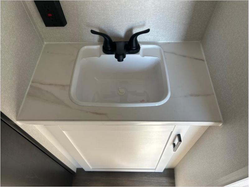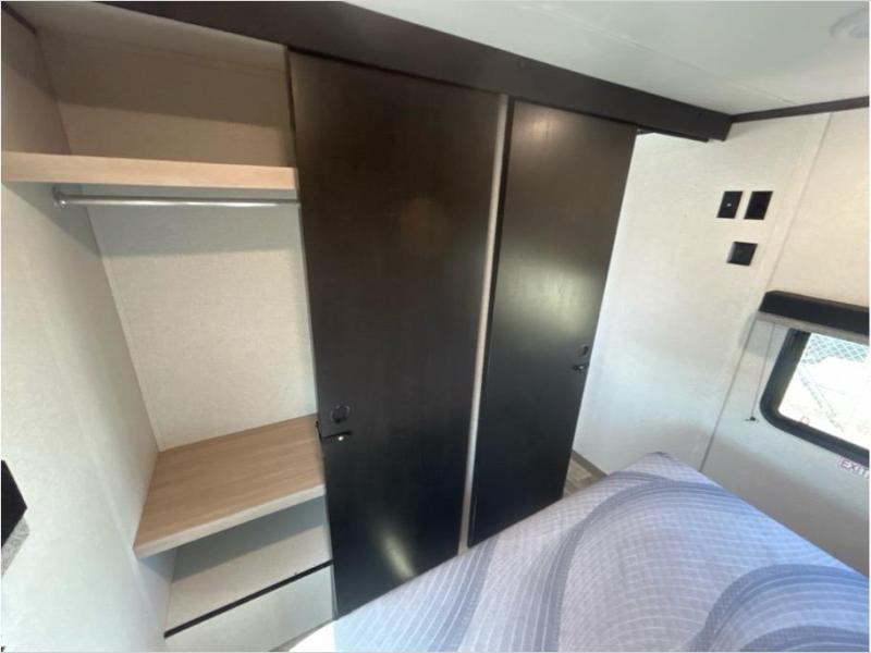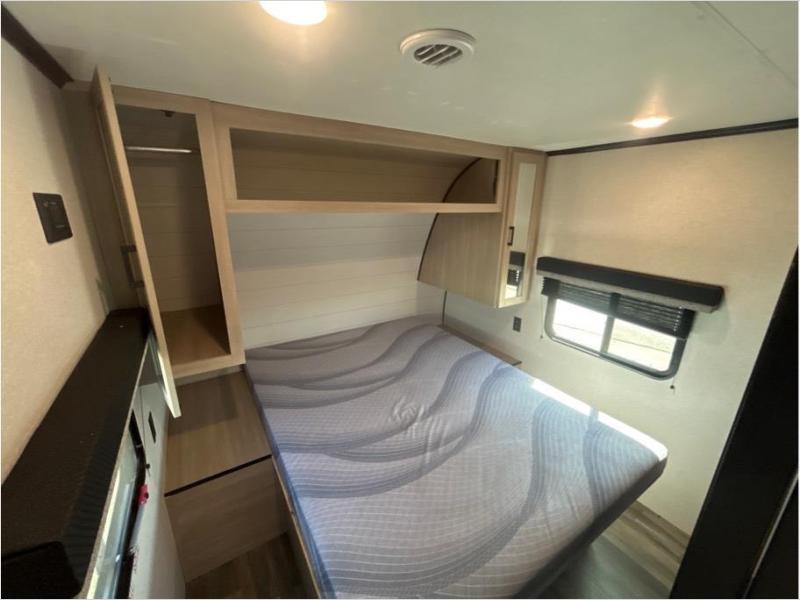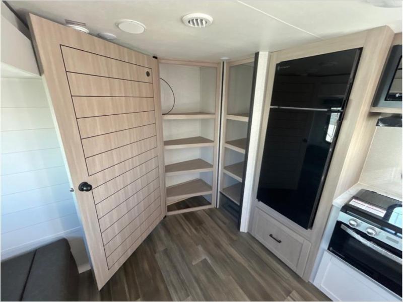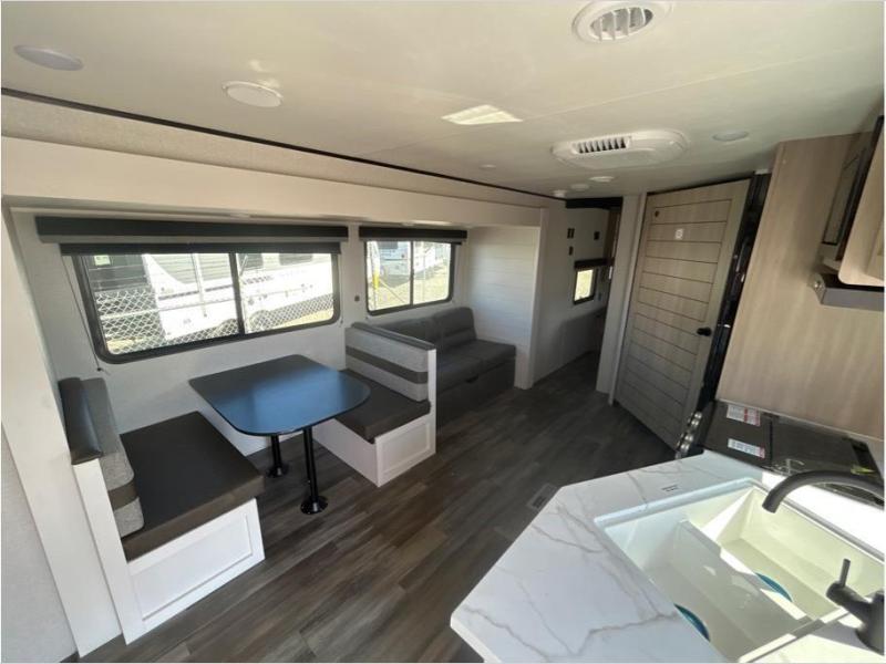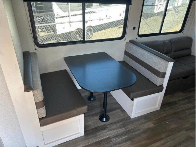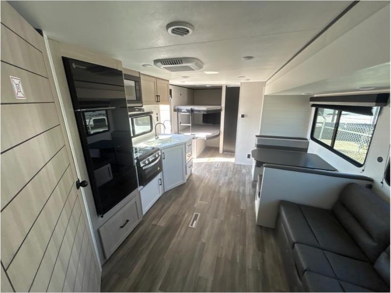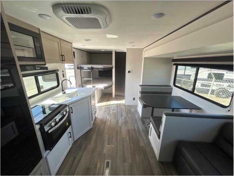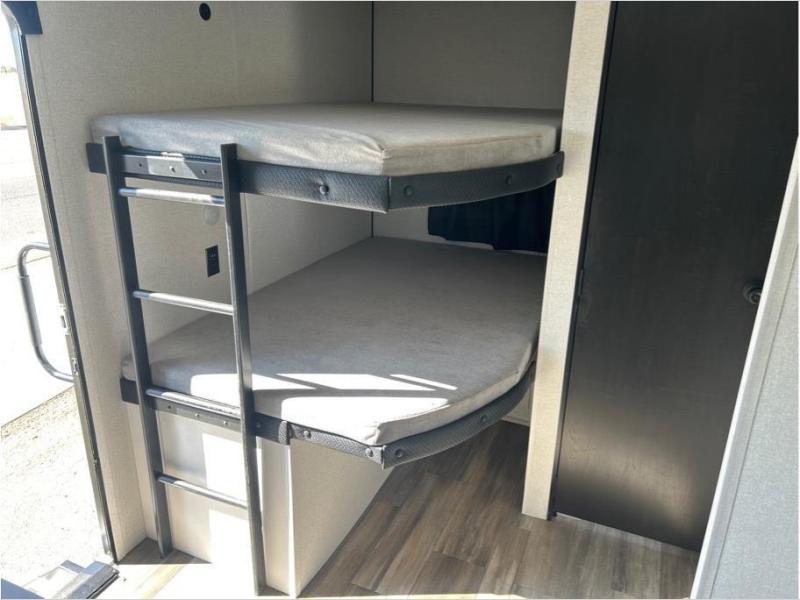 This travel trailer with double-size bunks is spacious and cozy! Once you've unloaded the exterior storage, your crew can put out the 20' power awning with LED lights, then start lunch on the outside kitchen. If the weather isn't cooperating, there is a three-burner cooktop and microwave oven inside, plus comfortable seating on the jack-knife sofa and booth dinette. You're sure to appreciate the front private bedroom with an RV queen bed, dual wardrobes, an overhead shelf, plus a bedroom closet for more shoes and clothes!