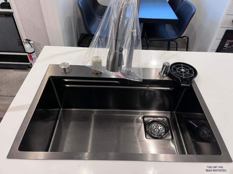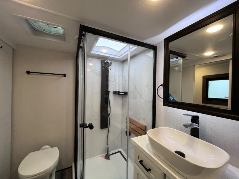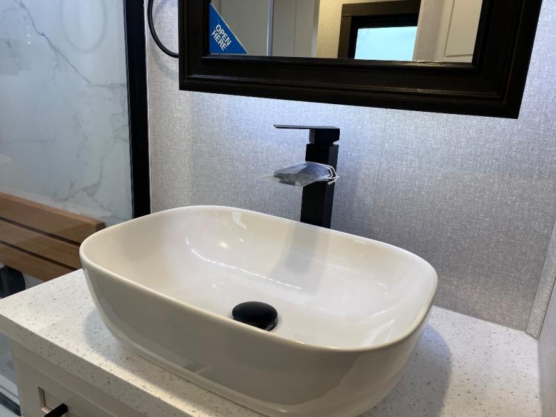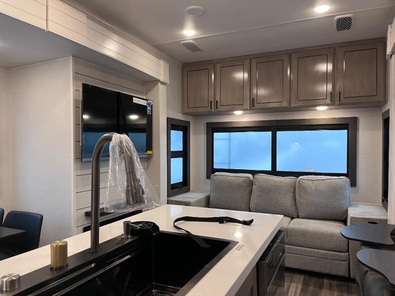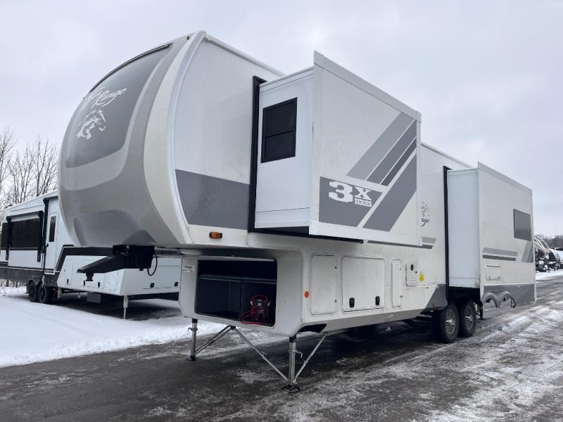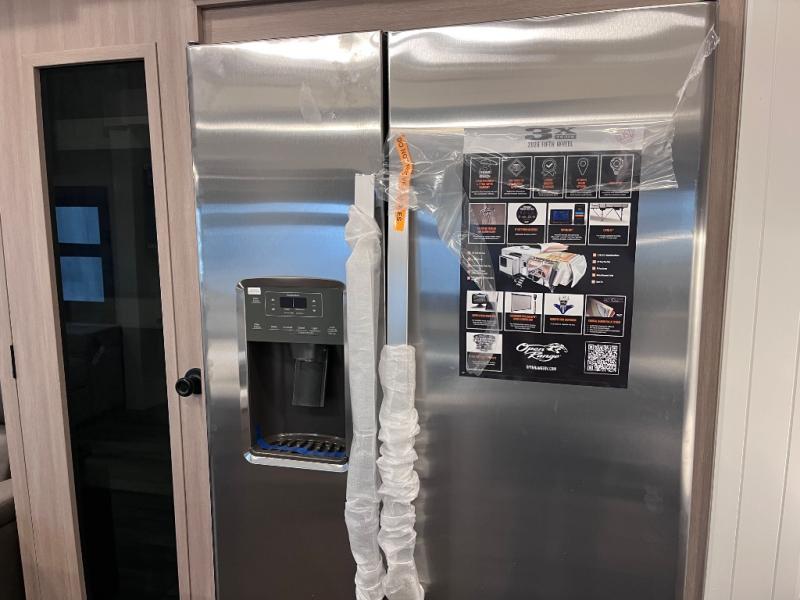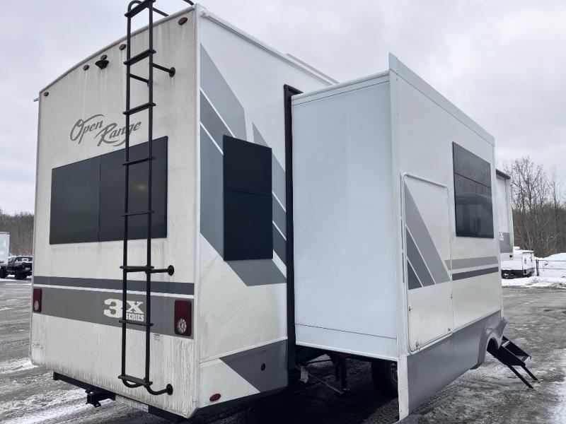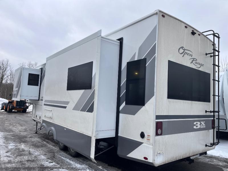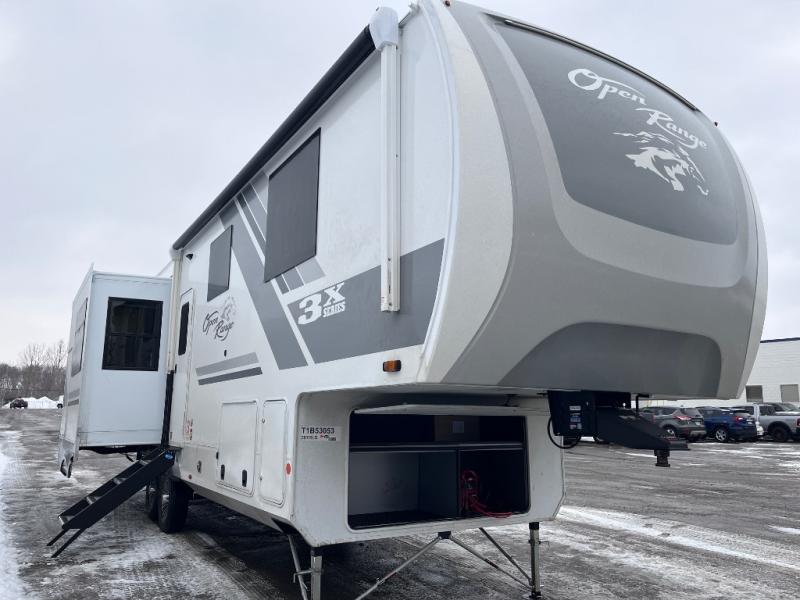With any Open Range 3X fifth wheel by Open Range RV, you will enjoy residential luxuries and an exceptional build. The TuffShell construction includes vacuum bonded laminated fiberglass and welded aluminum frames for added strength, and the PVC roofing membrane is ultra durable. You can plan to camp year around or go full-time since there is a mandatory Four Season Package that includes a heated and enclosed underbelly, a 40K BTU high-performance furnace, double insulated baggage doors, and more. The residential features continue on with the mandatory Executive Package with the TravelLINK Smart RV system, Keyed-Alike entry and baggage doors, painted fiberglass front cap with LED lighting, and three 15,000 BTU A/C units with quiet residential return air. Inside, you'll enjoy GE kitchen appliances, sleek square windows with integrated blinds, ceramic subway tile backsplash, a glass shower door, and the list of amenities goes on!