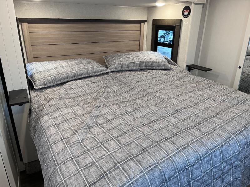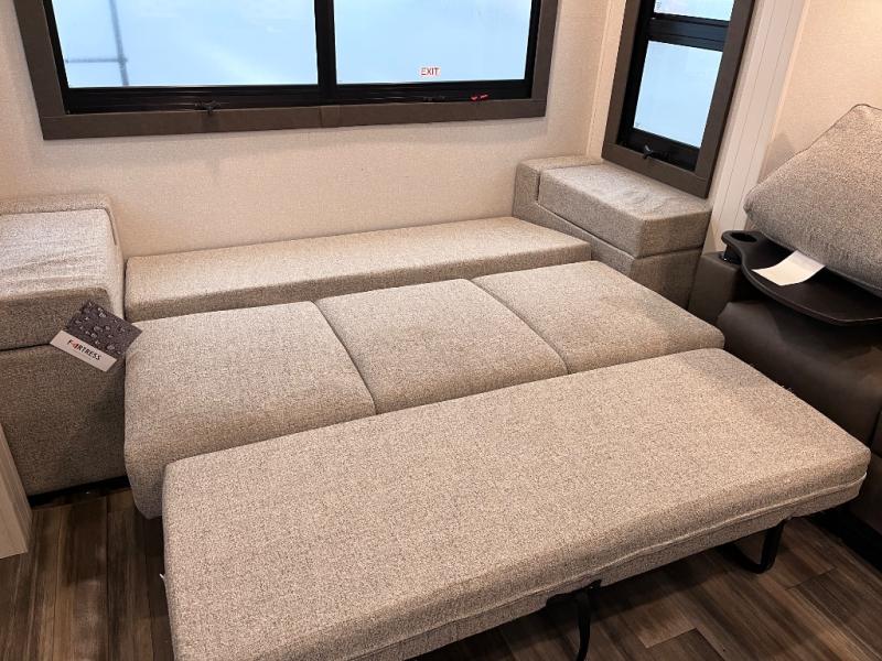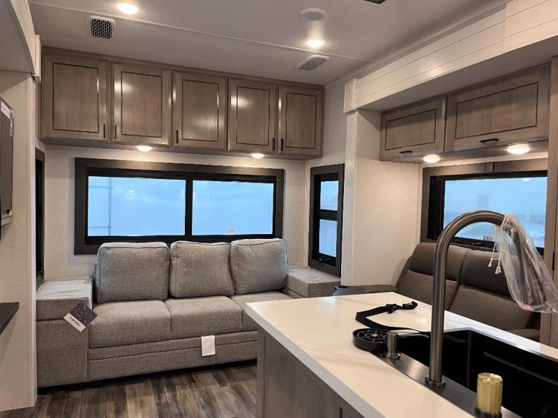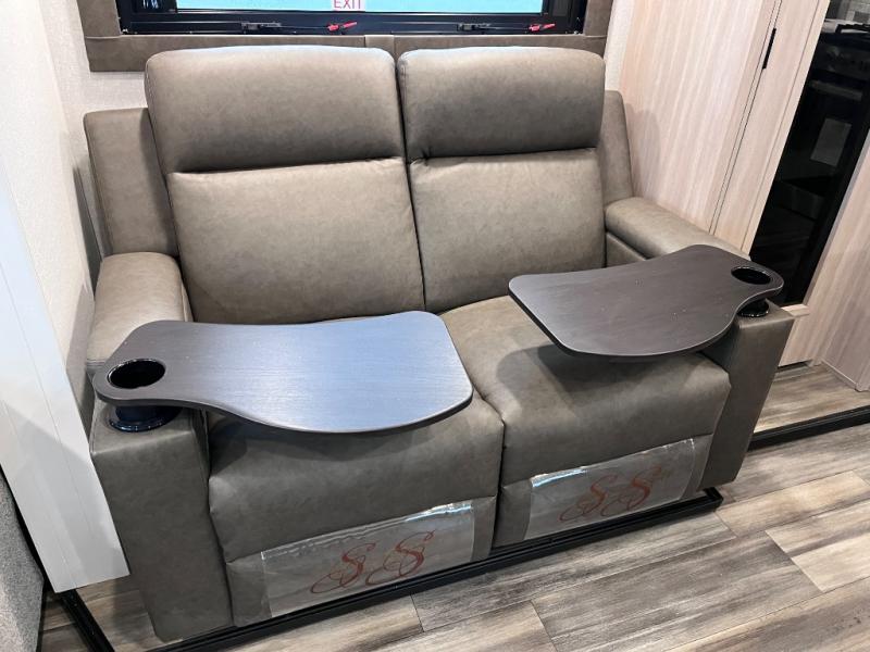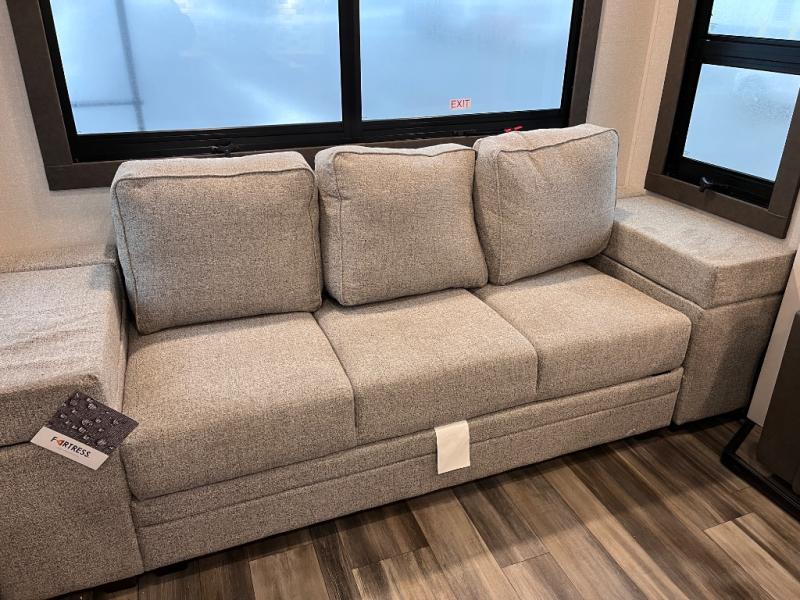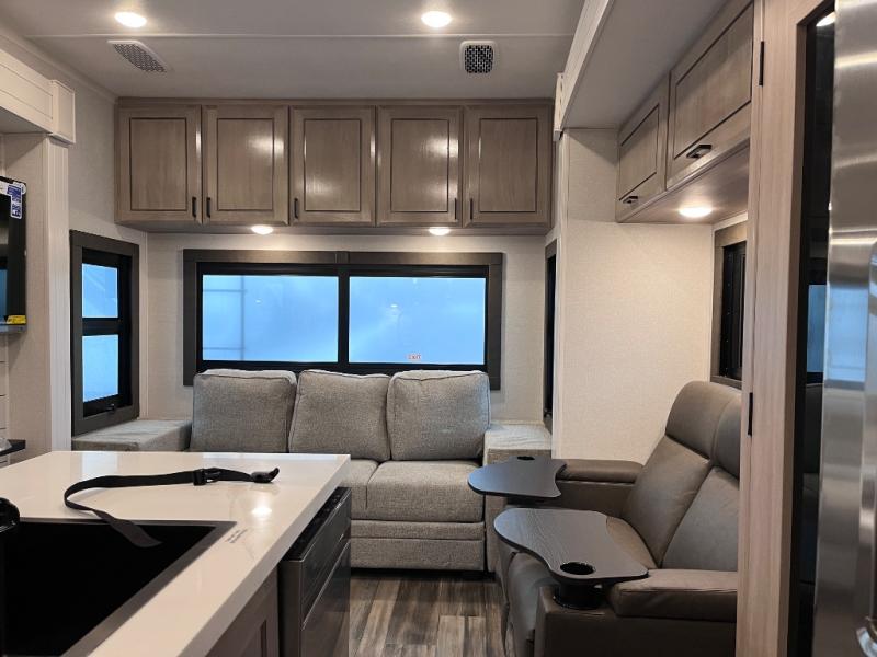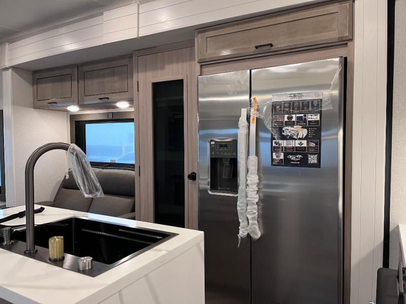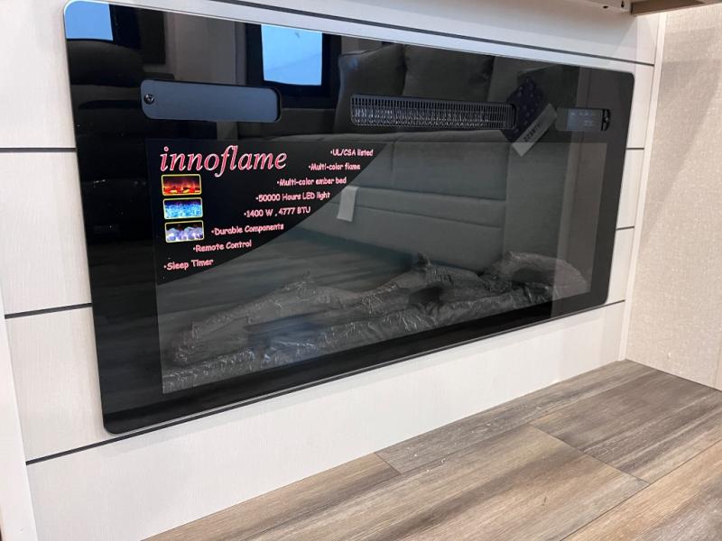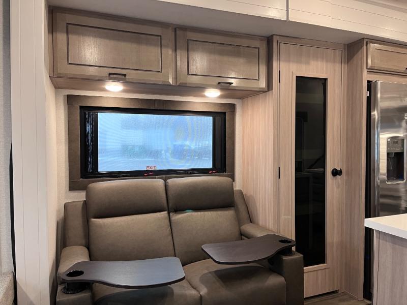 You will love the great space and layout in this amazing fifth wheel! The rear living area features theater seats as well as a tri-fold sofa with adjustable headrests. It's the perfect place to watch a movie on the Smart TV located in the entertainment center with fireplace! The kitchen includes a full suite of GE residential appliances, including a 4-burner range, 21 cu. ft. refrigerator, and over-the range microwave. Also, standard are a dishwasher and central vacuum system so cleaning up is easy! At night retire to the bedroom with its king bed with power base. A second TV lets you watch your favorite shows as you fall asleep. Storage abounds including a full wardrobe and dresser with a pull-out top. A dual-entry full bath is easily accessible and includes even more storage with a linen closet!