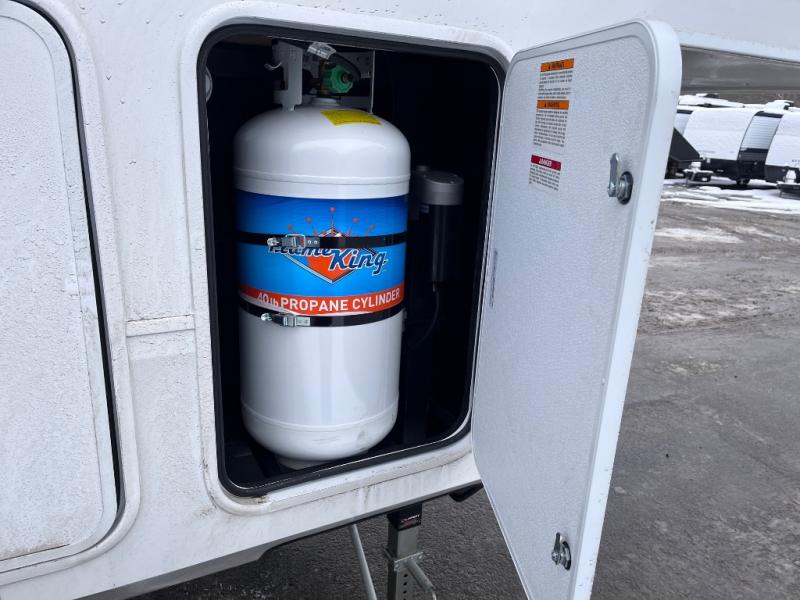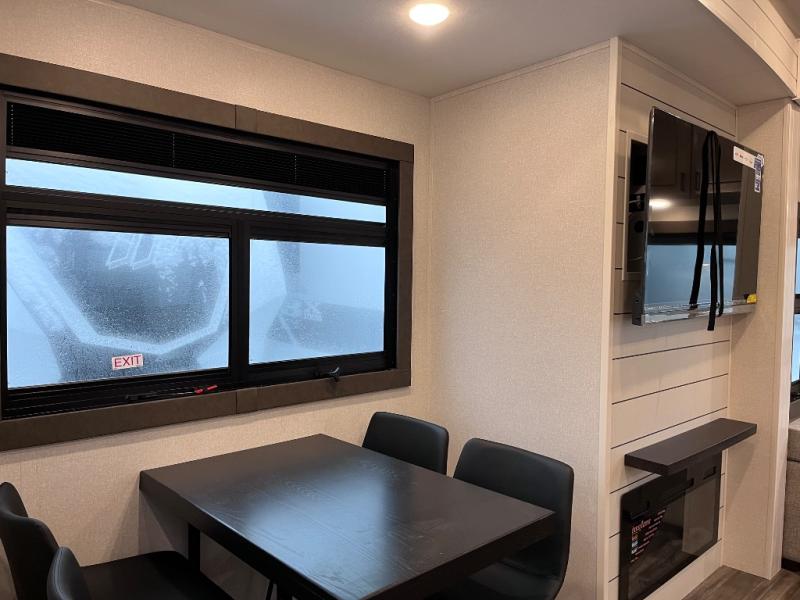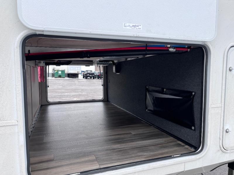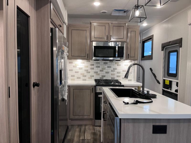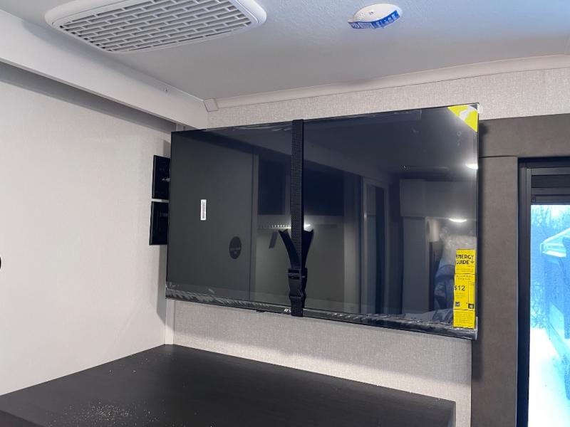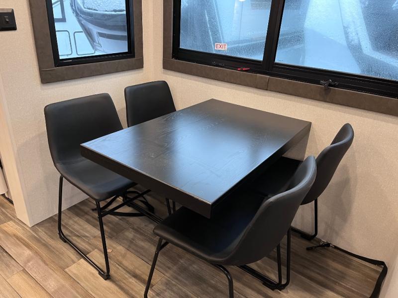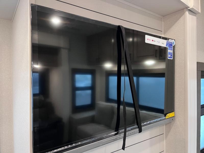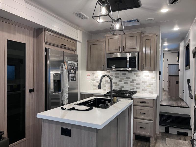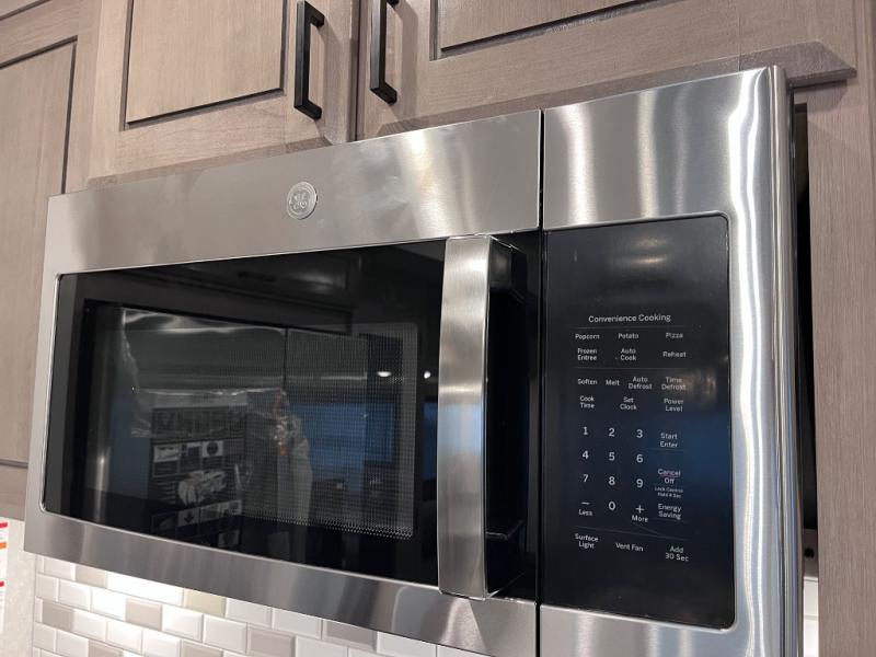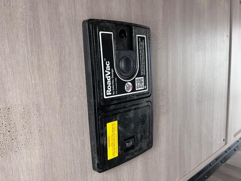 You will love the great space and layout in this amazing fifth wheel! The rear living area features theater seats as well as a tri-fold sofa with adjustable headrests. It's the perfect place to watch a movie on the Smart TV located in the entertainment center with fireplace! The kitchen includes a full suite of GE residential appliances, including a 4-burner range, 21 cu. ft. refrigerator, and over-the range microwave. Also, standard are a dishwasher and central vacuum system so cleaning up is easy! At night retire to the bedroom with its king bed with power base. A second TV lets you watch your favorite shows as you fall asleep. Storage abounds including a full wardrobe and dresser with a pull-out top. A dual-entry full bath is easily accessible and includes even more storage with a linen closet!