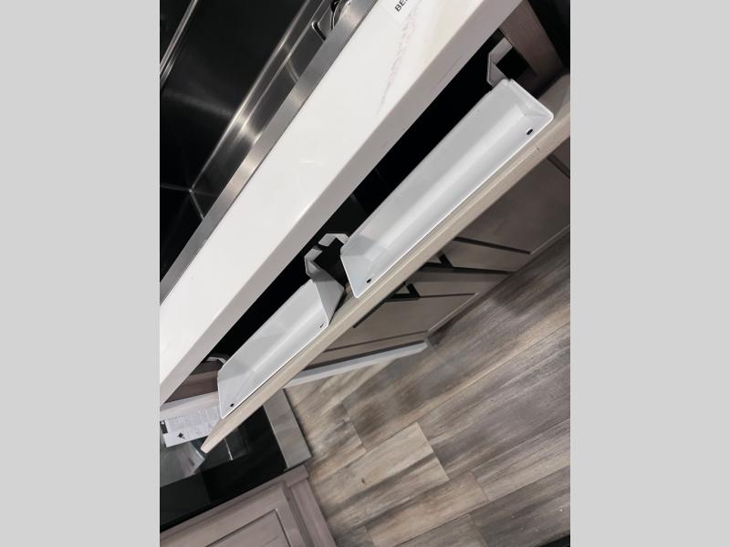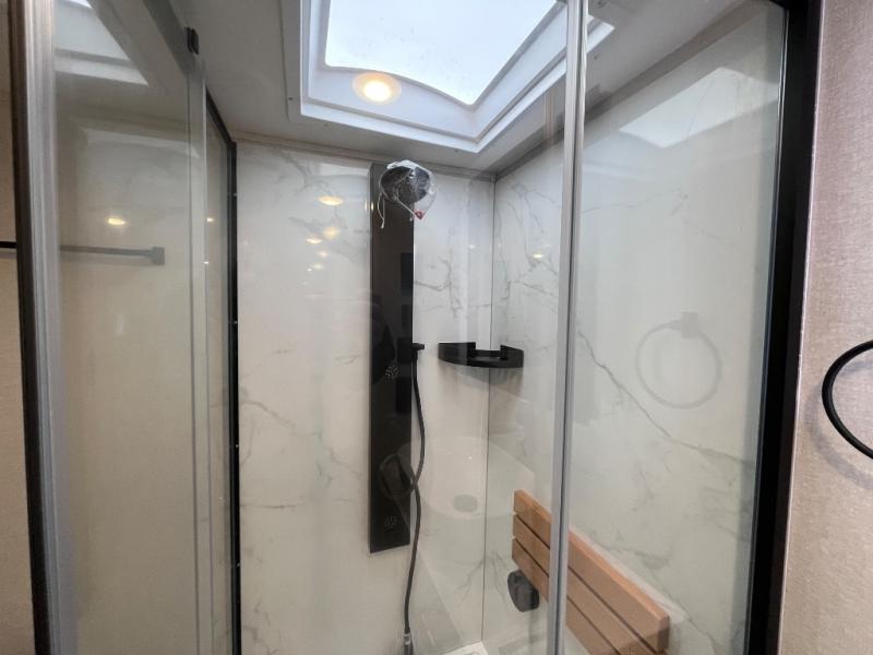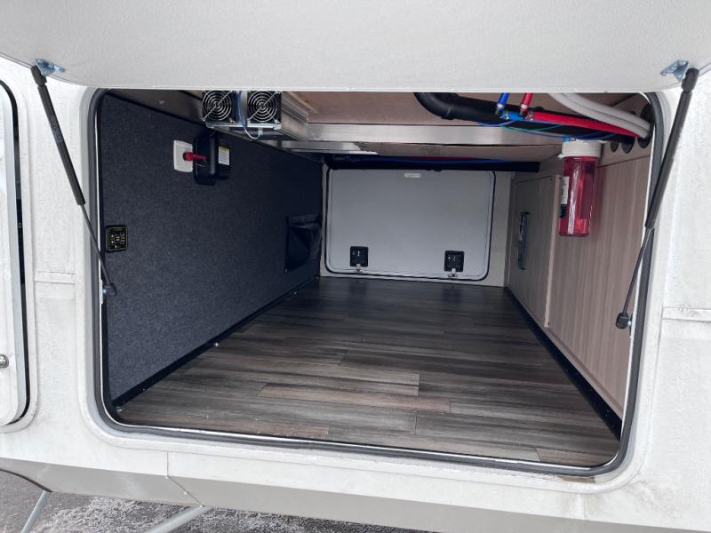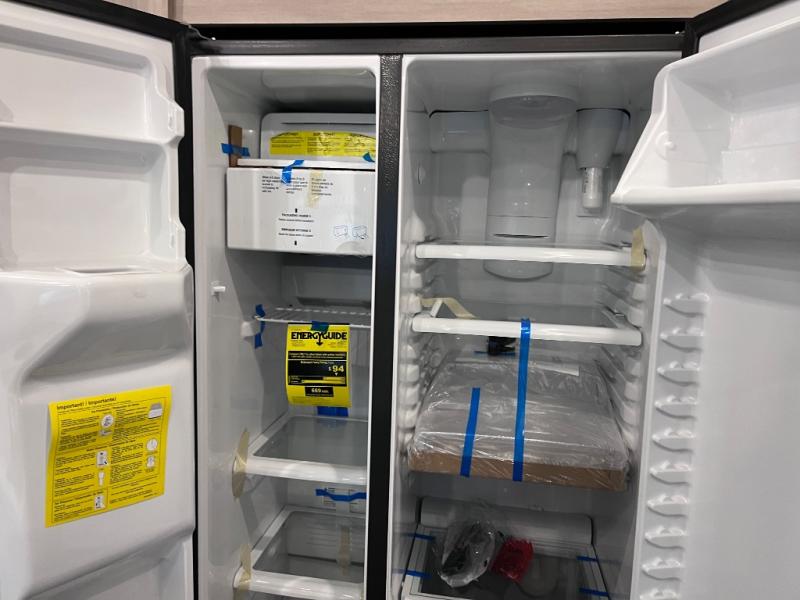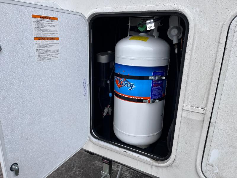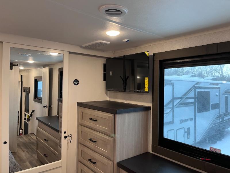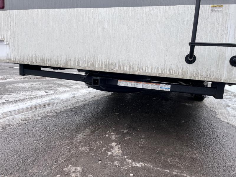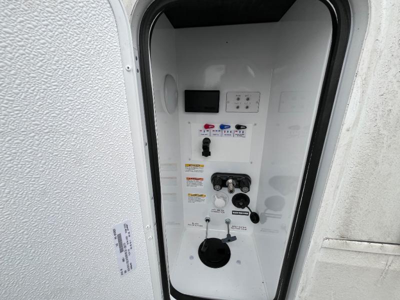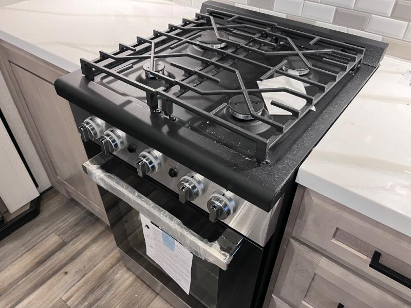 You will love the great space and layout in this amazing fifth wheel! The rear living area features theater seats as well as a tri-fold sofa with adjustable headrests. It's the perfect place to watch a movie on the Smart TV located in the entertainment center with fireplace! The kitchen includes a full suite of GE residential appliances, including a 4-burner range, 21 cu. ft. refrigerator, and over-the range microwave. Also, standard are a dishwasher and central vacuum system so cleaning up is easy! At night retire to the bedroom with its king bed with power base. A second TV lets you watch your favorite shows as you fall asleep. Storage abounds including a full wardrobe and dresser with a pull-out top. A dual-entry full bath is easily accessible and includes even more storage with a linen closet!
