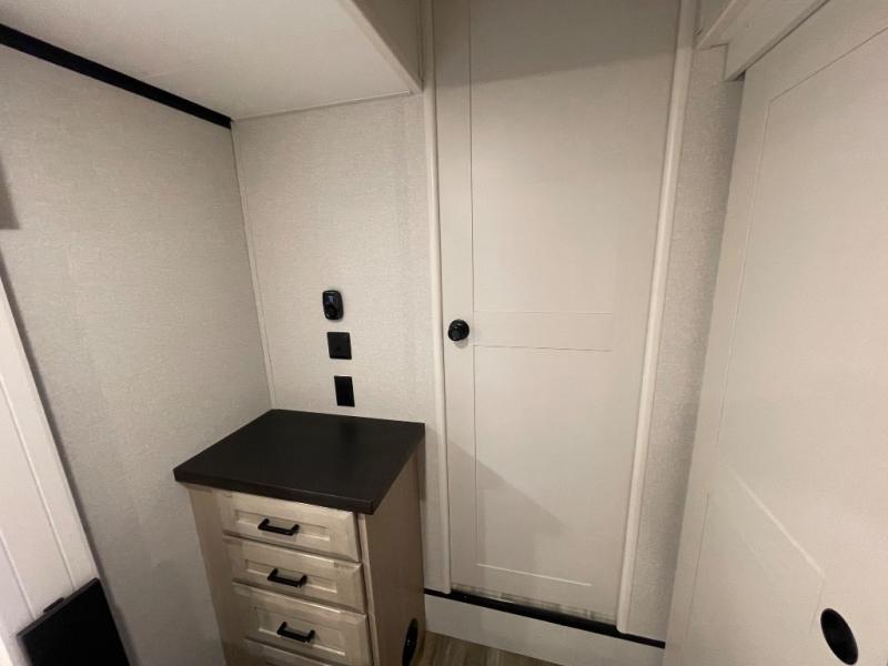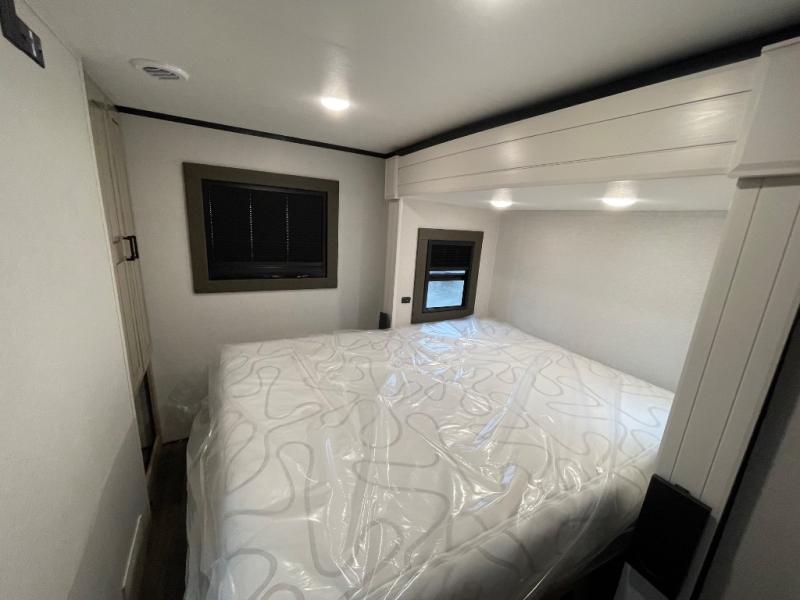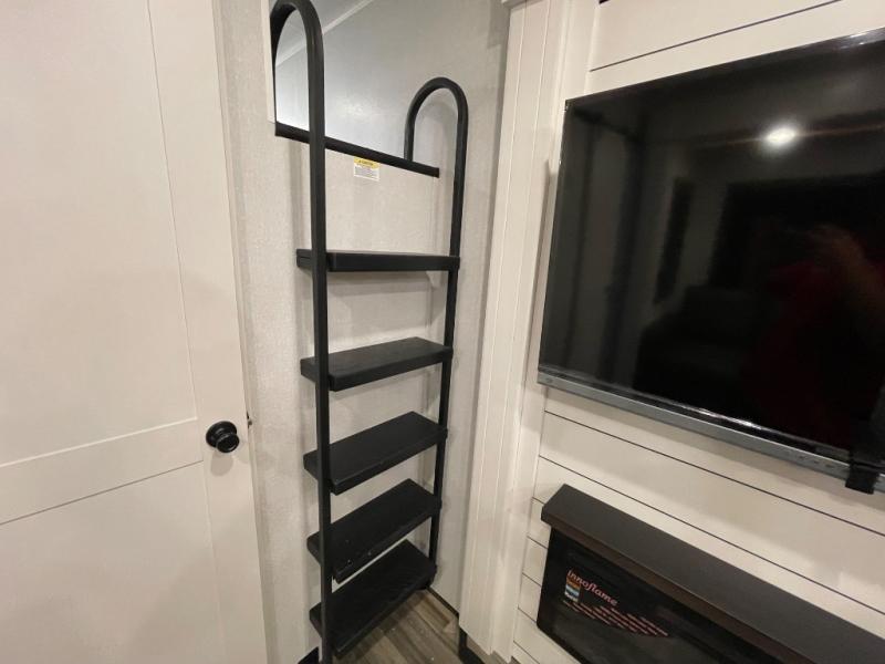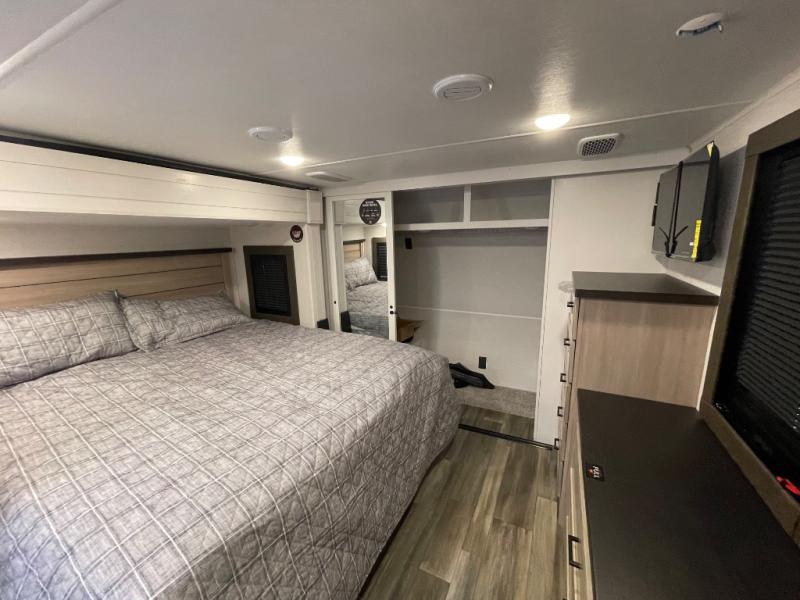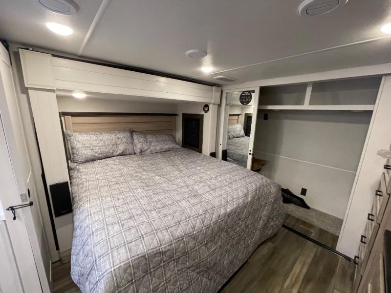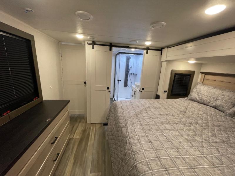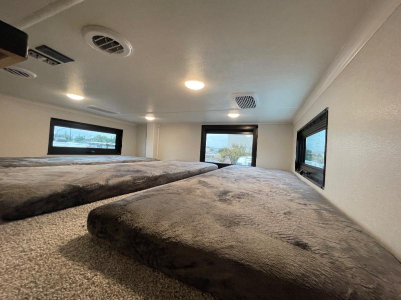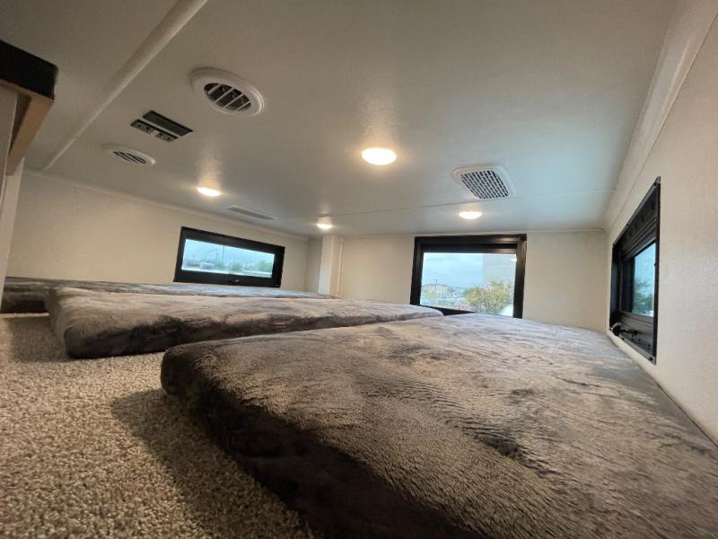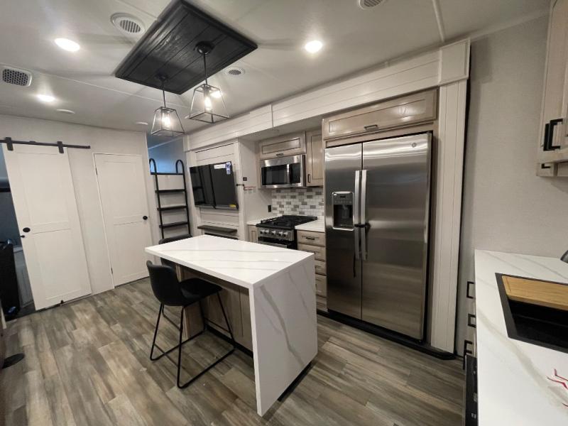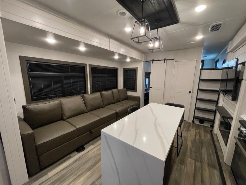 If you enjoy luxury camping or you're looking for a residential fifth wheel to go full-time in, this Open Range 3X is the one! The middle kitchen and living room is made open by the dual opposing slides, and your crew can get comfortable on the mega lounge with two tables. The chef of your group will love cooking on GE free-standing four burner range, or they can use the GE residential microwave to heat up leftovers. The standard dishwasher and central vacuum make cleanup a breeze. A waterfall island with four chairs will provide a place to dine and the hidden pantry behind the swing-out entertainment center can hold snacks galore. There is also a fireplace and smart HDTV to make movie nights cozy. The front master bedroom includes a slide out king bed with a power base, two dressers, a large front closet, and a 32" TV to watch shows in bed. You even have your own entrance into the full bath, plus washer and dryer prep if you choose to add those appliances. The rear master bedroom is just as accommodating with a queen bed slide out, a wardrobe and a dresser, plus a second full bath with its own exterior entry door. And the loft above the rear bedroom provides even more sleeping space.
